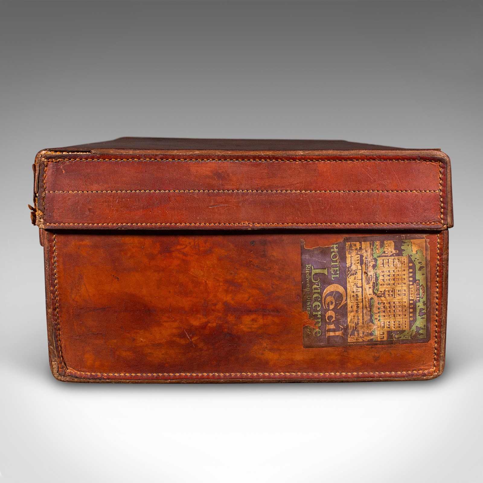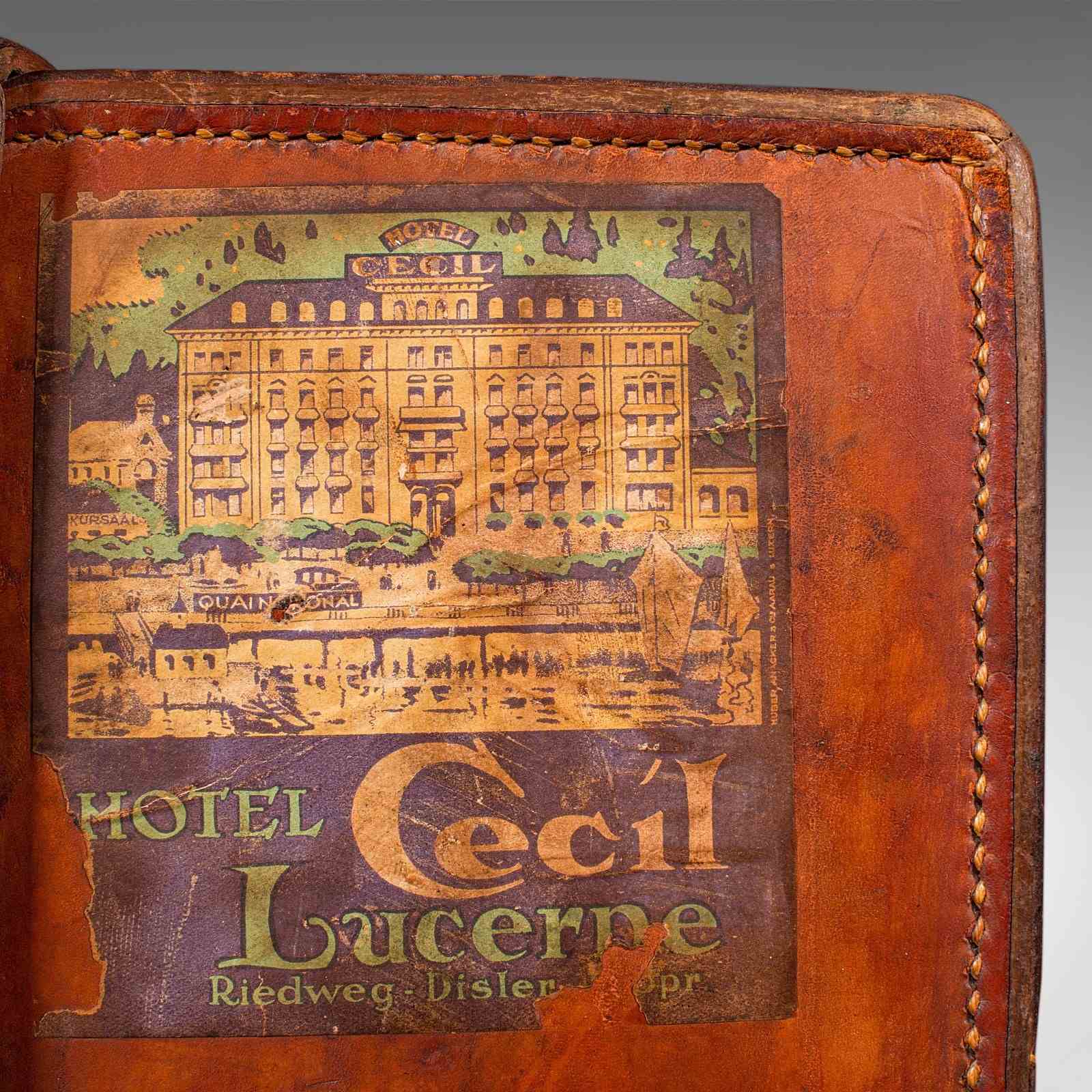Fascinating travel history, adorned with period label remnants from London, France, and the Hotel Cecil, Switzerland