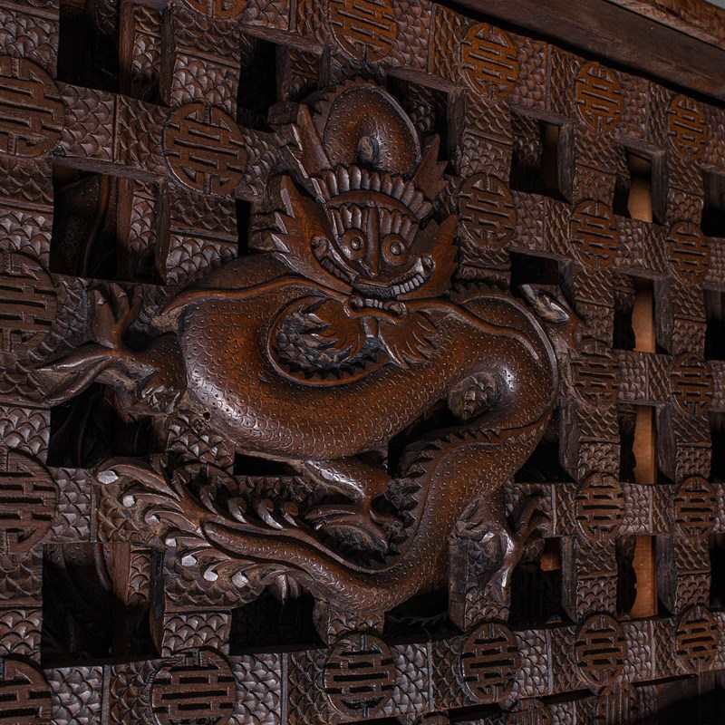 Corners feature dragon and symbolic motif carvings, rich with Eastern iconography