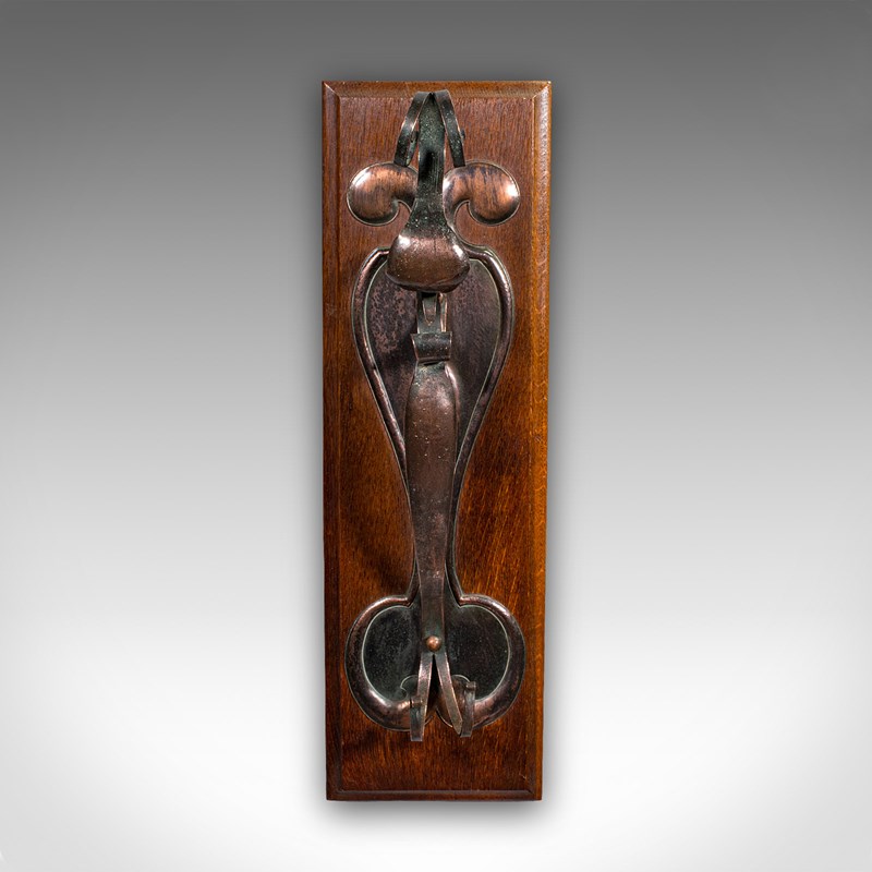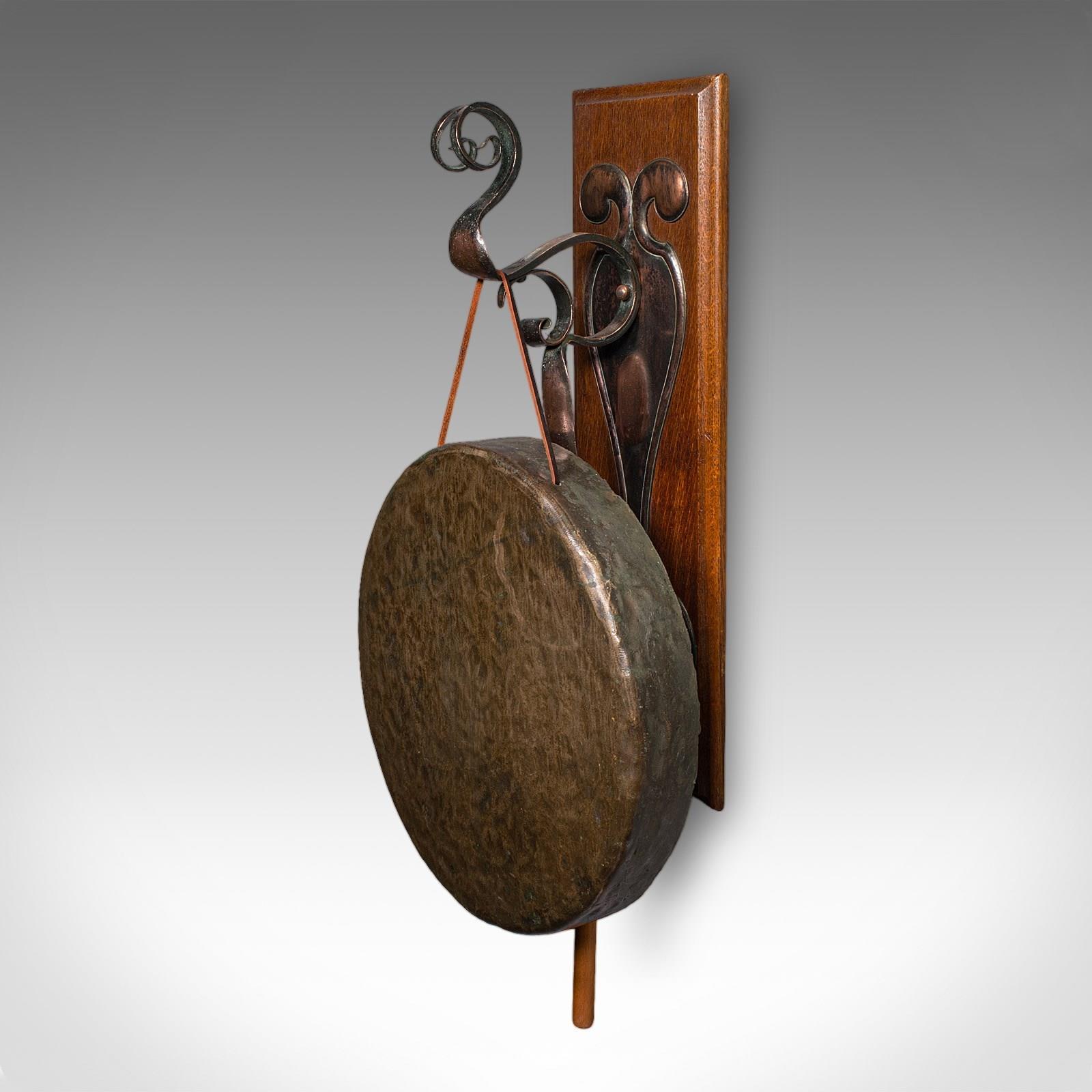 Antique Wall Gong, English, Oak, Bronze, Dinner Chime, Art Nouveau, Victorian