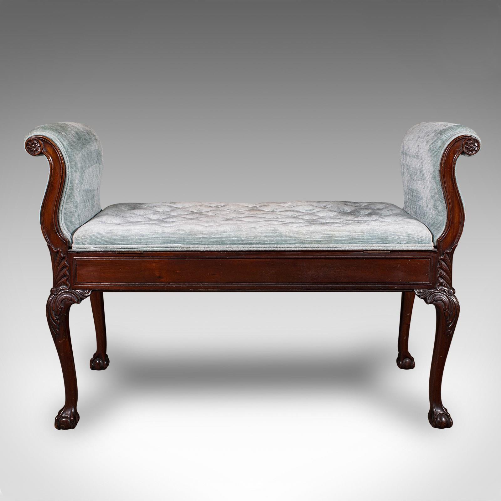 This is an elegant antique window seat. An English, walnut duet bench in the Georgian revival taste, dating to the Edwardian period, circa 1910. Gracefully proportioned and superbly crafted, this piece offers both refined comfort and practical storage, ideal for placement within a bay window, entrance hall, or at the foot of a bed.