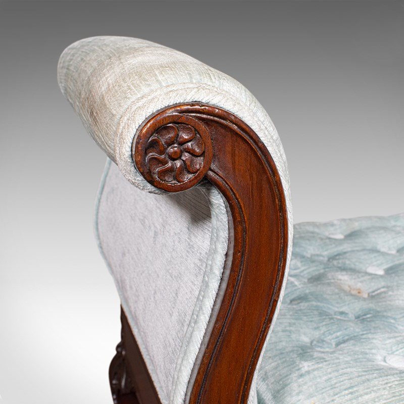 Features a comfortably buttoned cushion, executed in the traditional manner