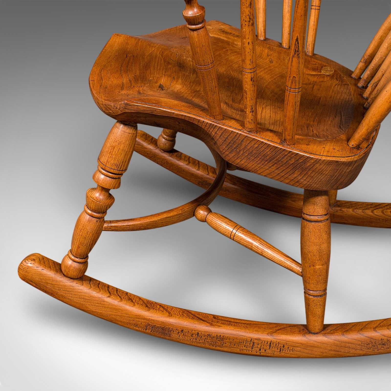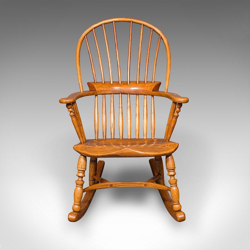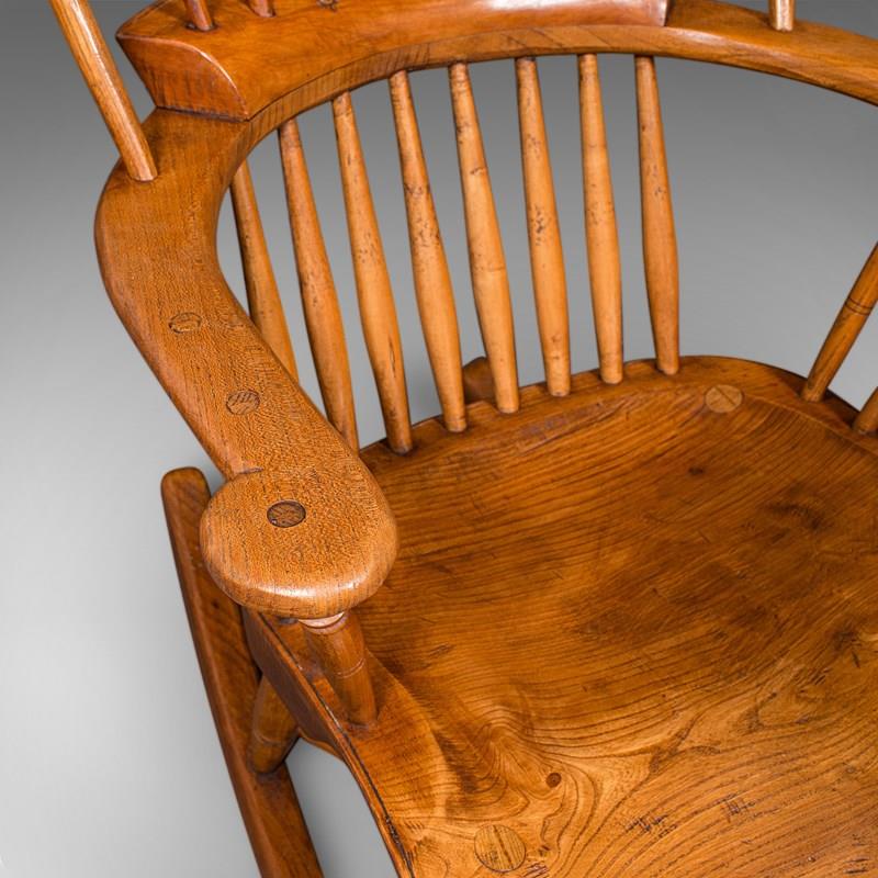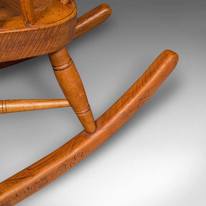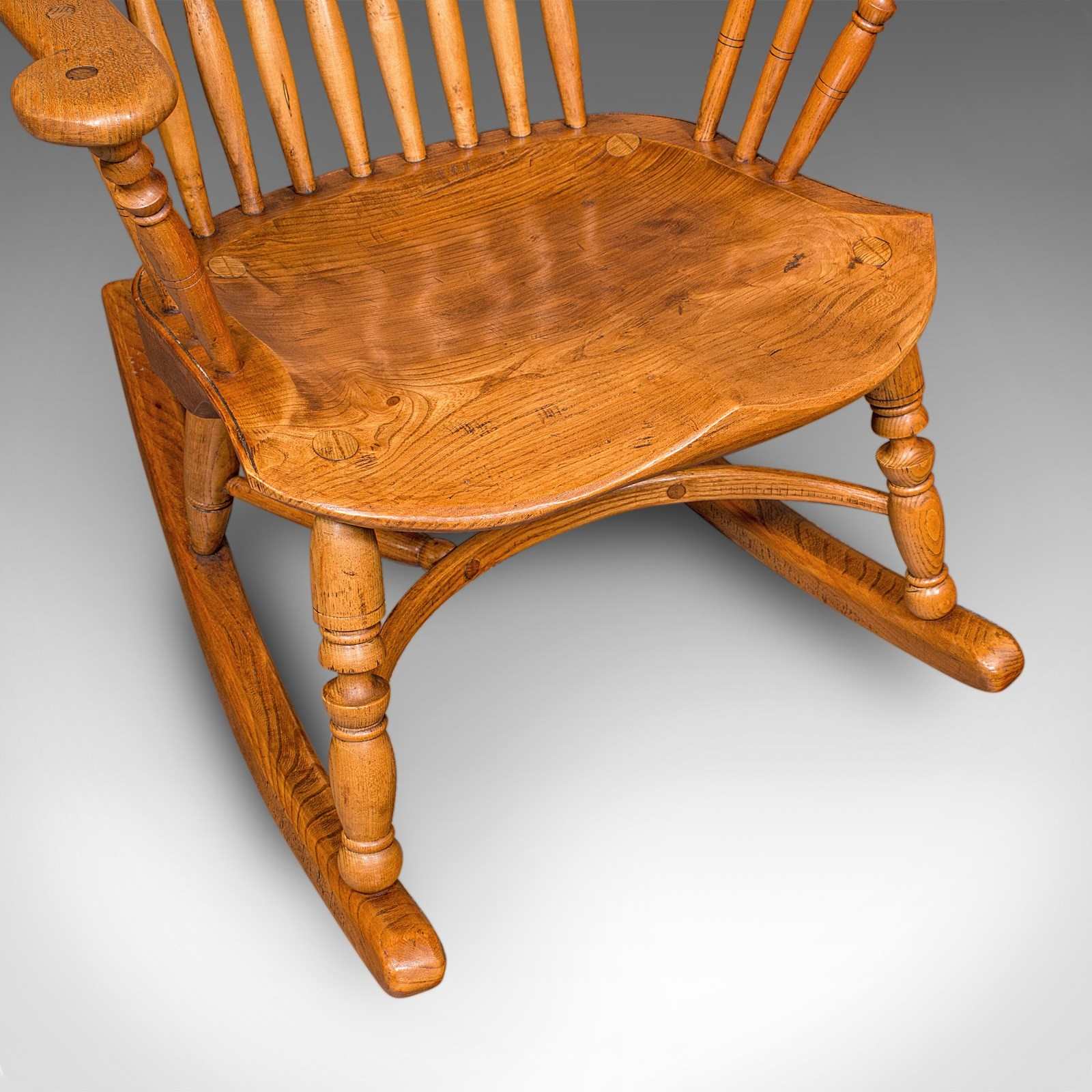 This is an antique Windsor rocking chair, an English, elm and ash porch or fireside rocker, dating to the late Victorian period, circa 1900.
