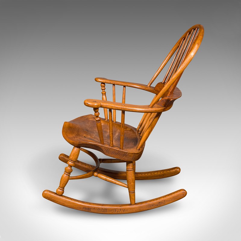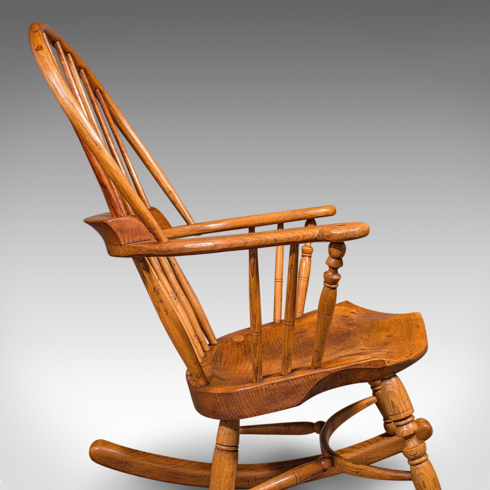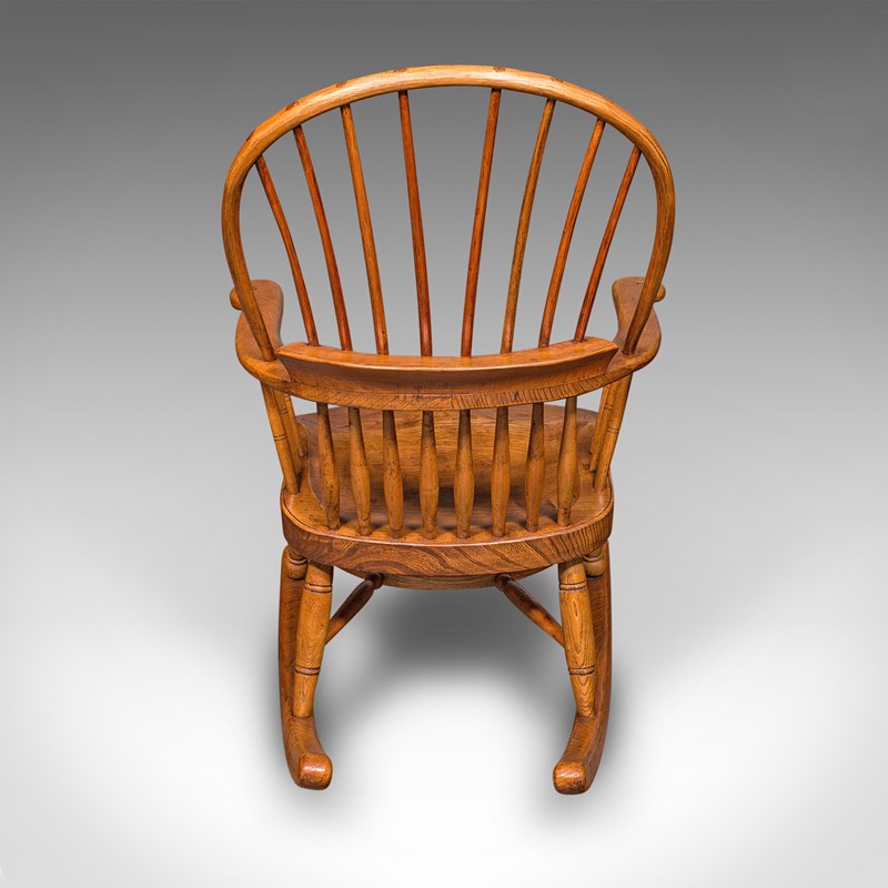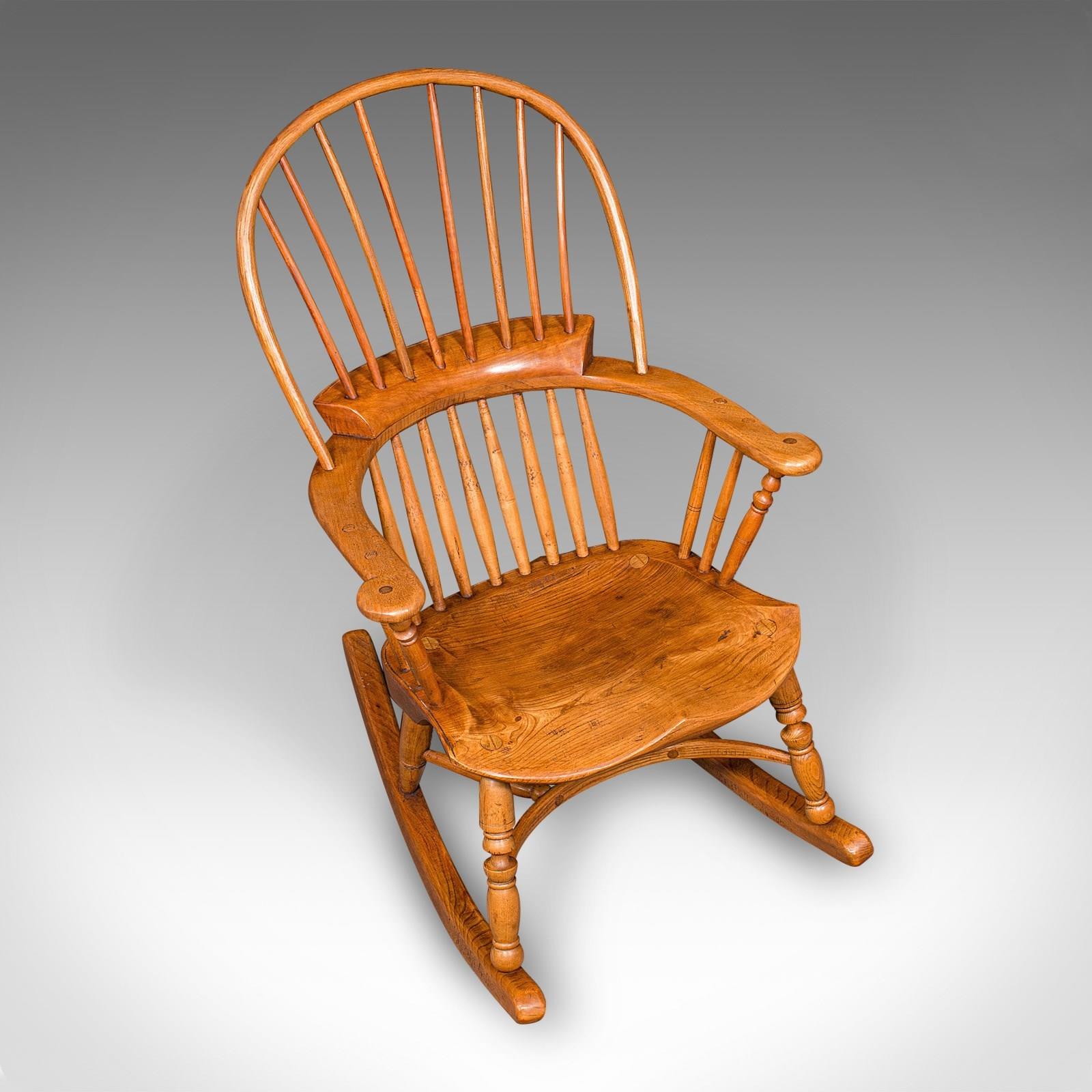 This is an antique Windsor rocking chair, an English, elm and ash porch or fireside rocker, dating to the late Victorian period, circa 1900.
