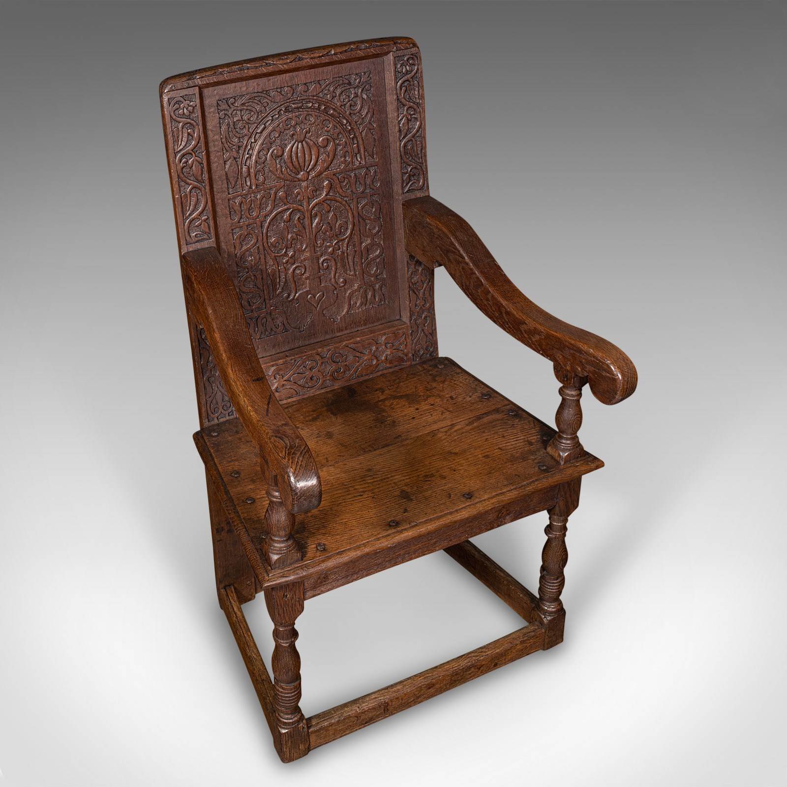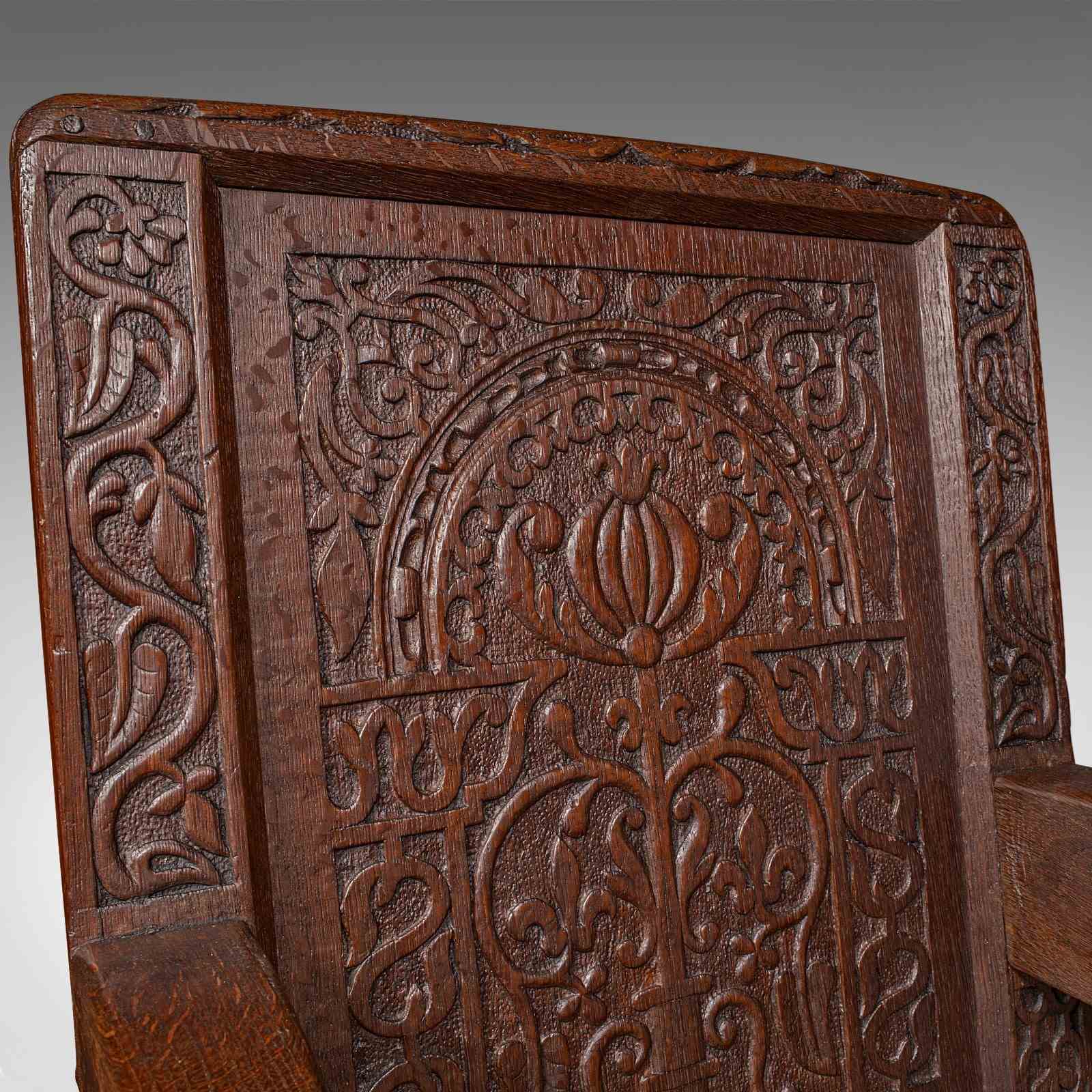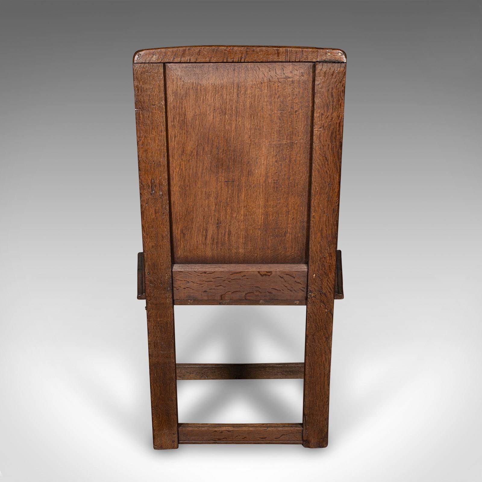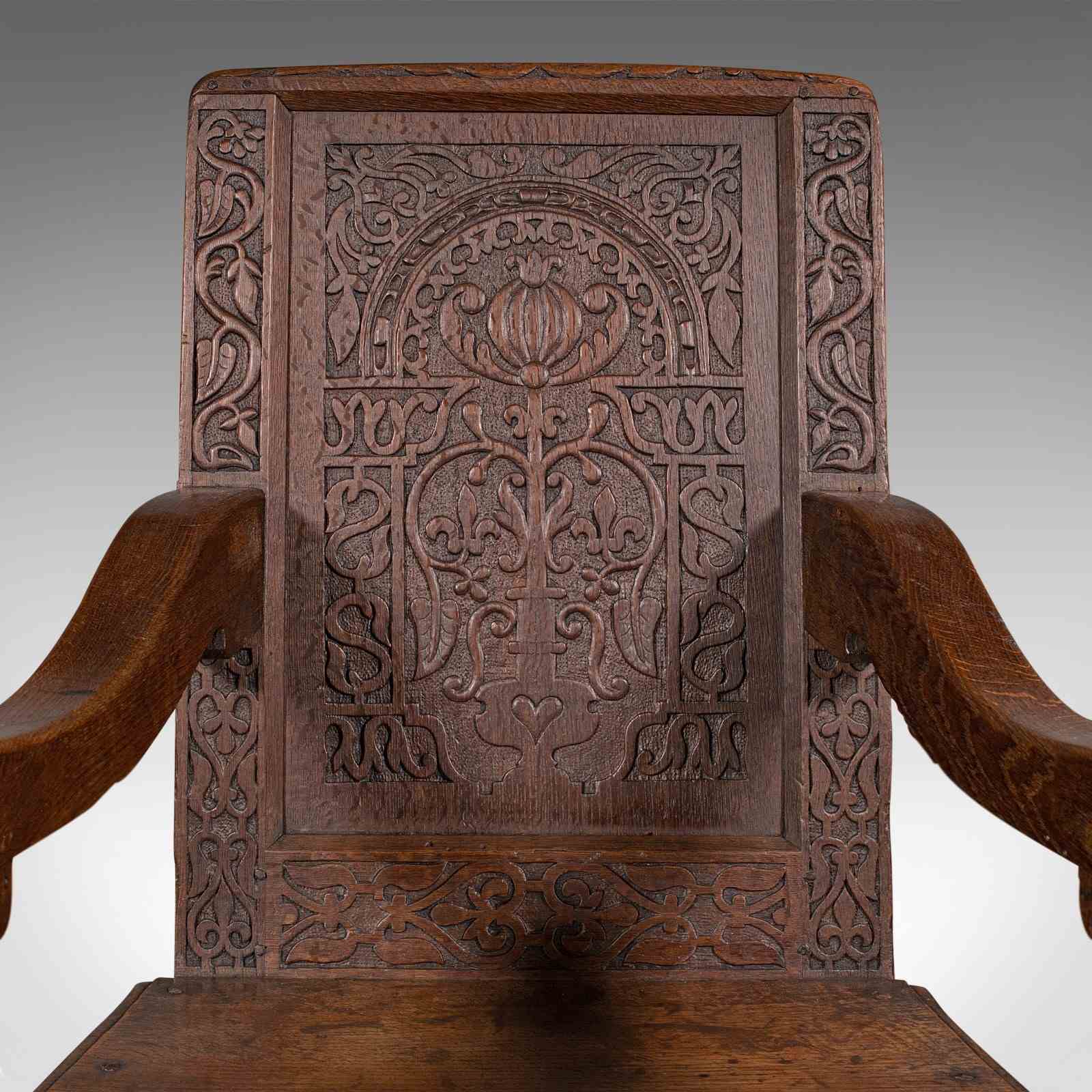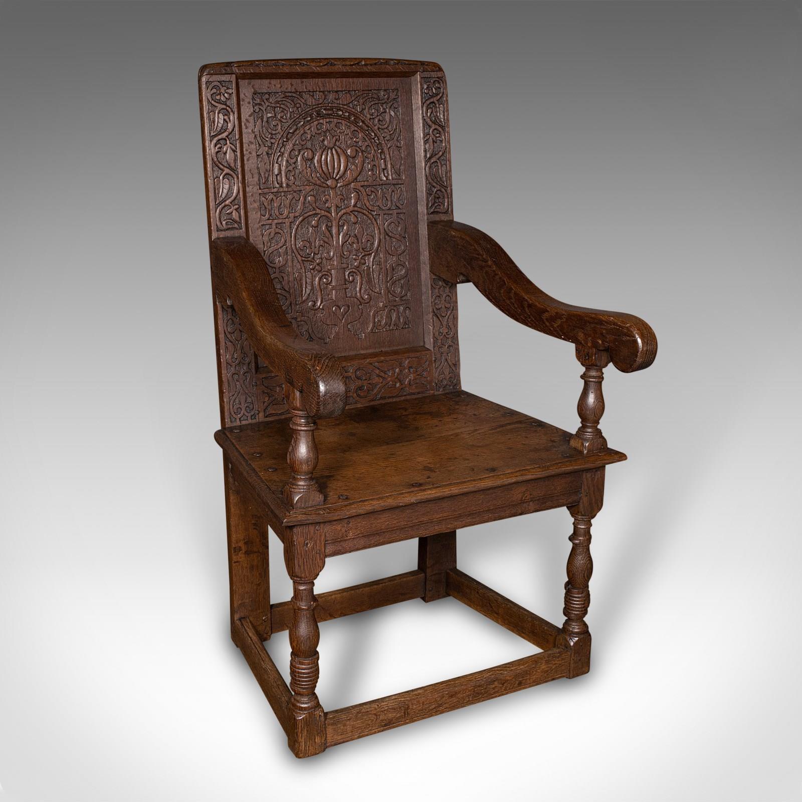 This is an antique Wainscote armchair. A Scottish, oak carved throne chair, dating to the mid Georgian period and later, circa 1750.
