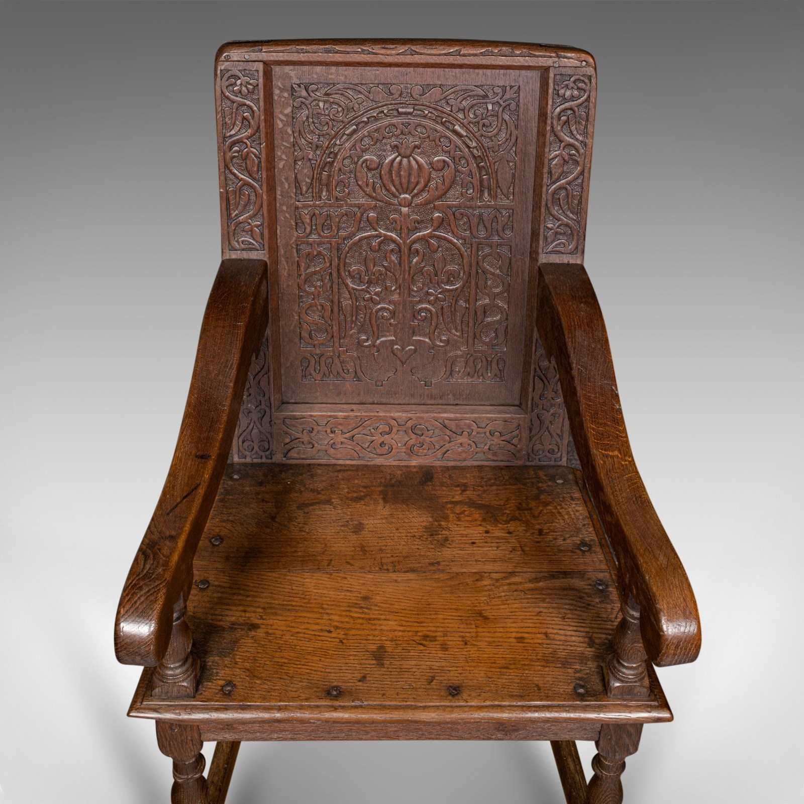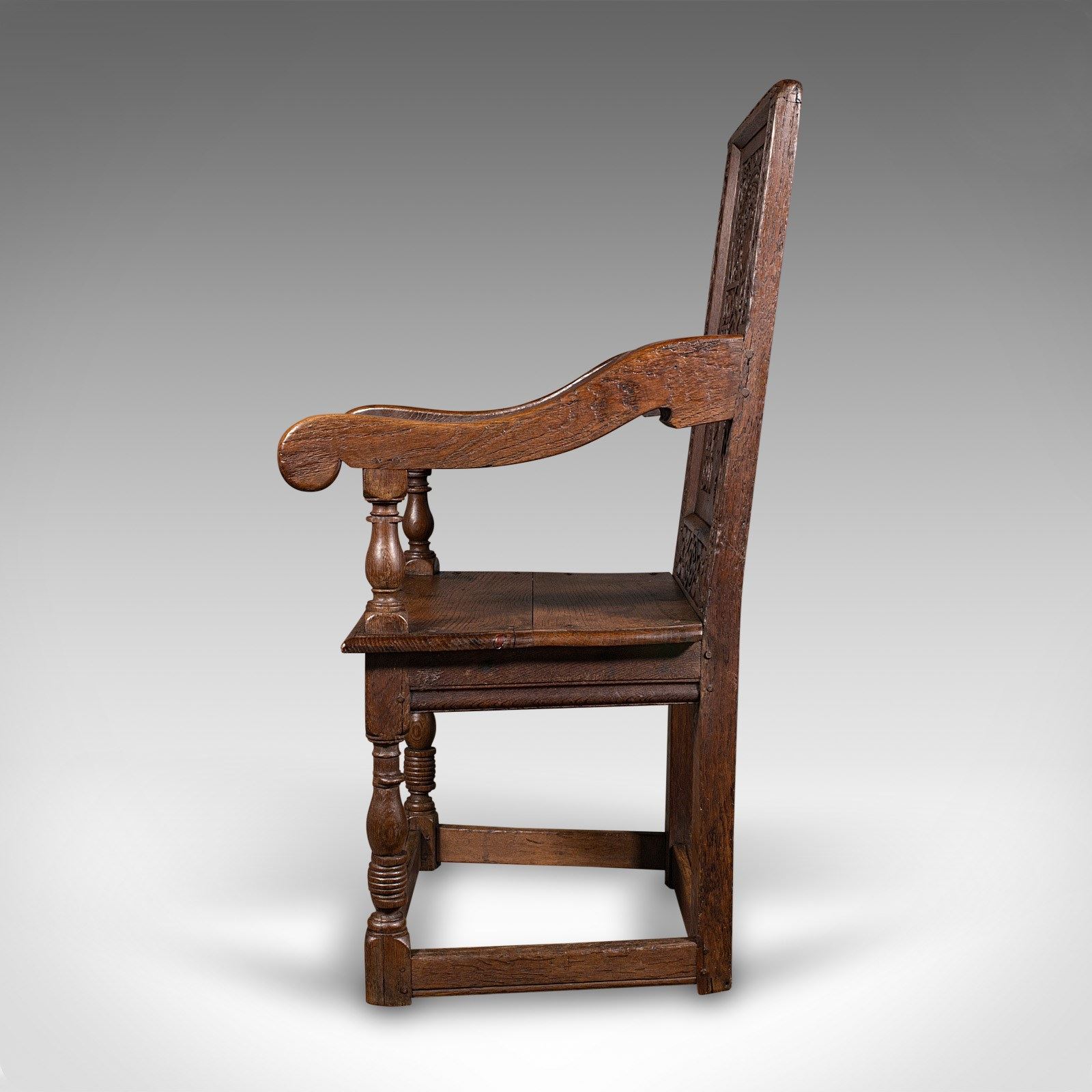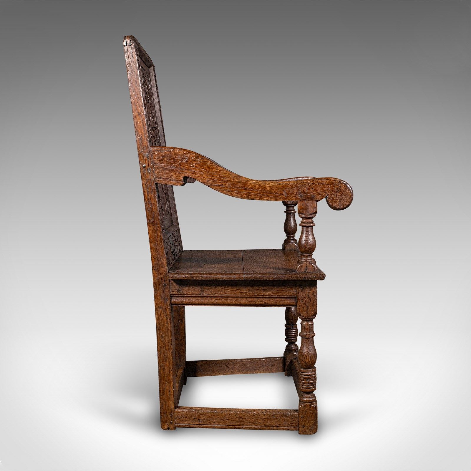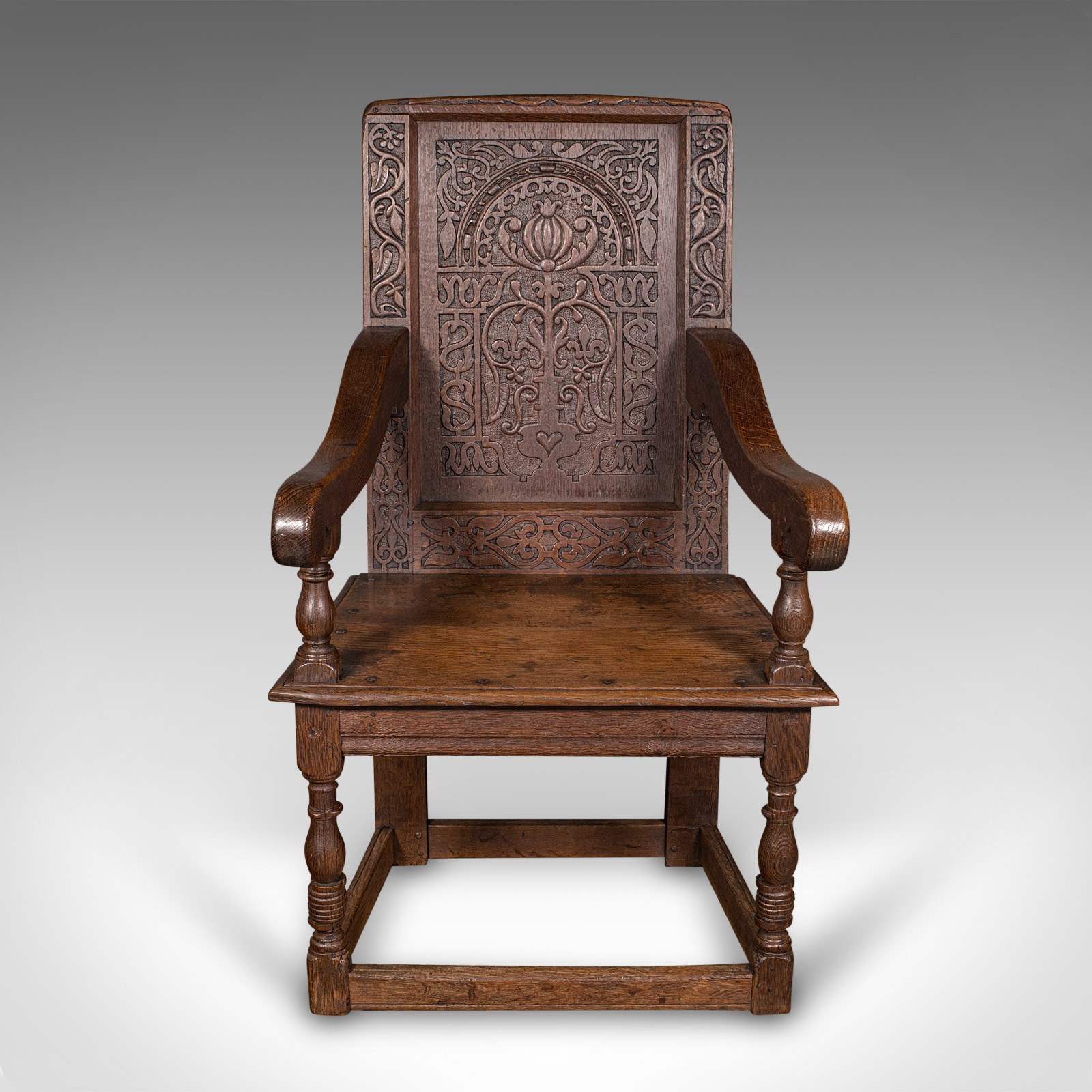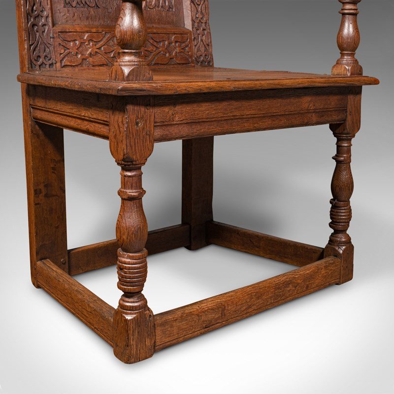 This is an antique Wainscote armchair. A Scottish, oak carved throne chair, dating to the mid Georgian period and later, circa 1750.