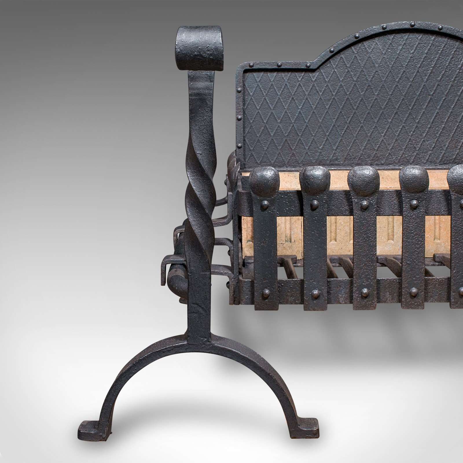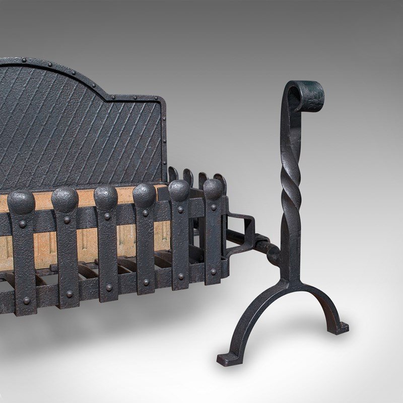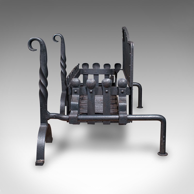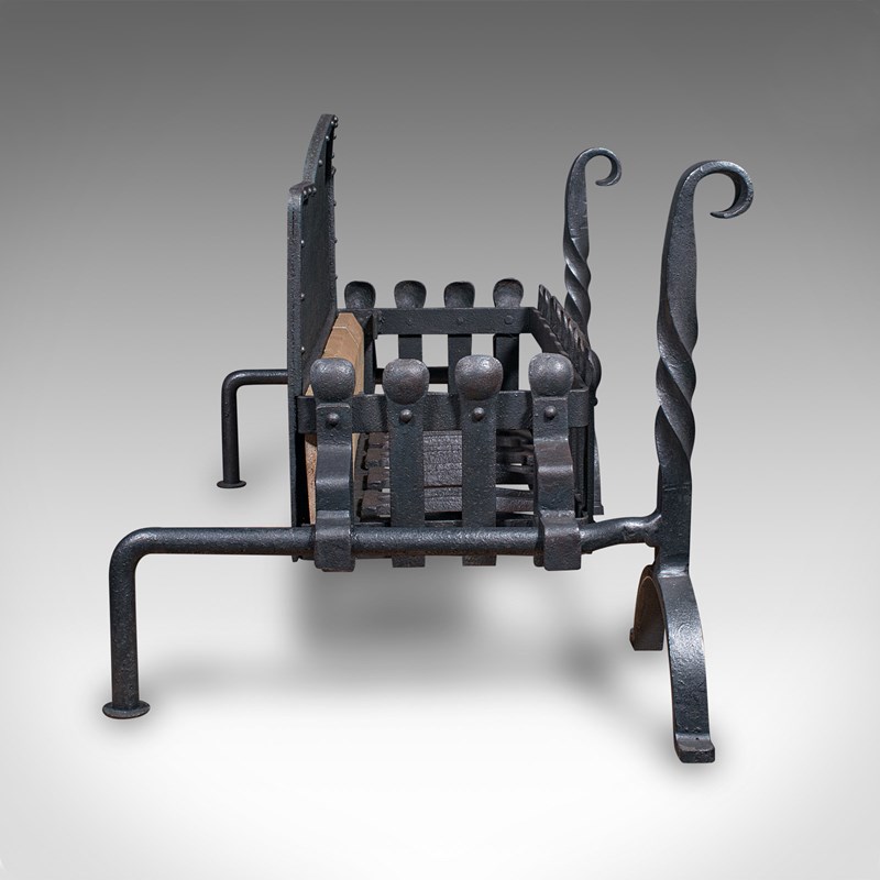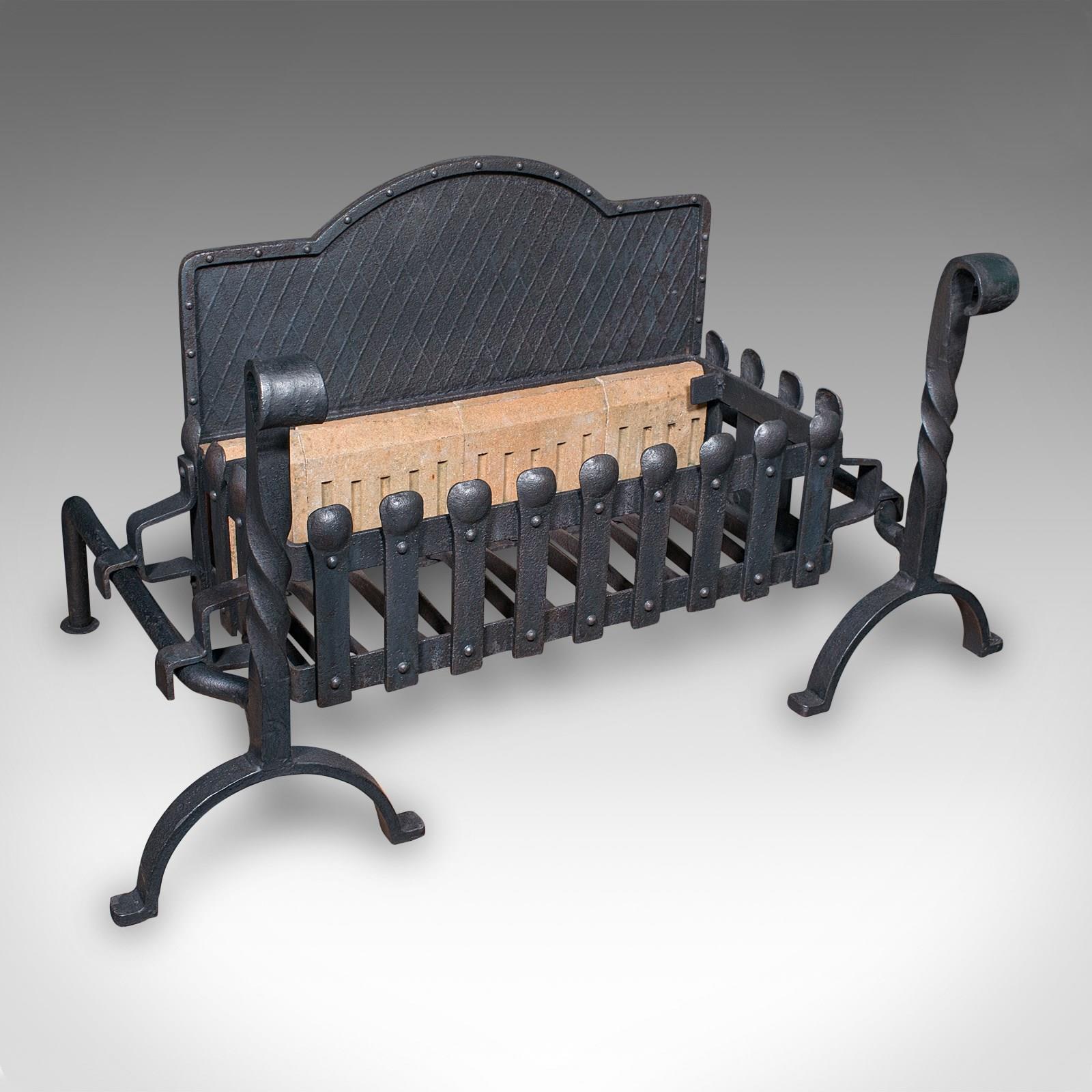 This is a large antique fireplace set. An English, cast iron inglenook fire basket with a pair of andirons, dating to the early Victorian period, circa 1850. A superb country house ensemble, offering generous scale and a wonderfully self-contained fireplace solution for the larger hearth.