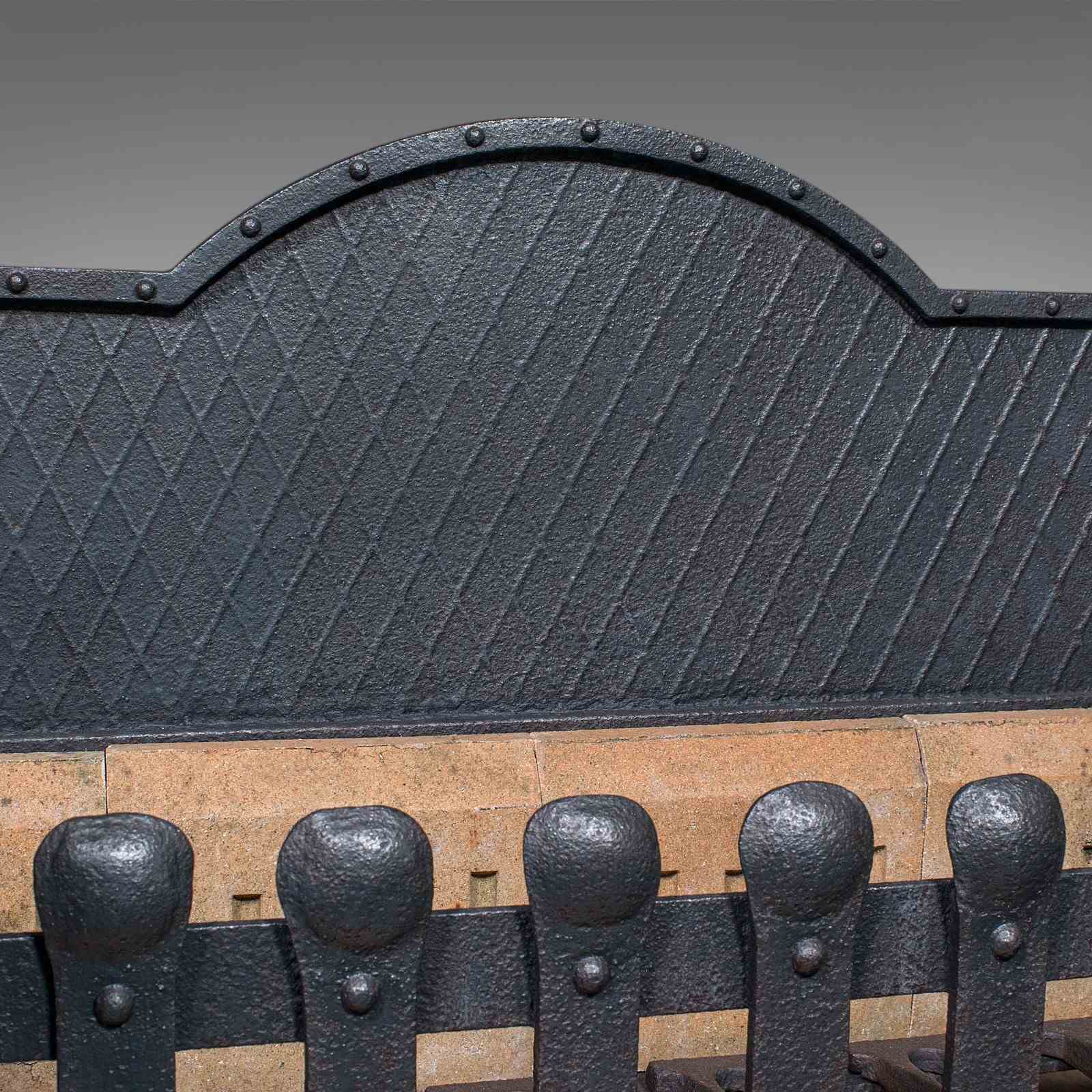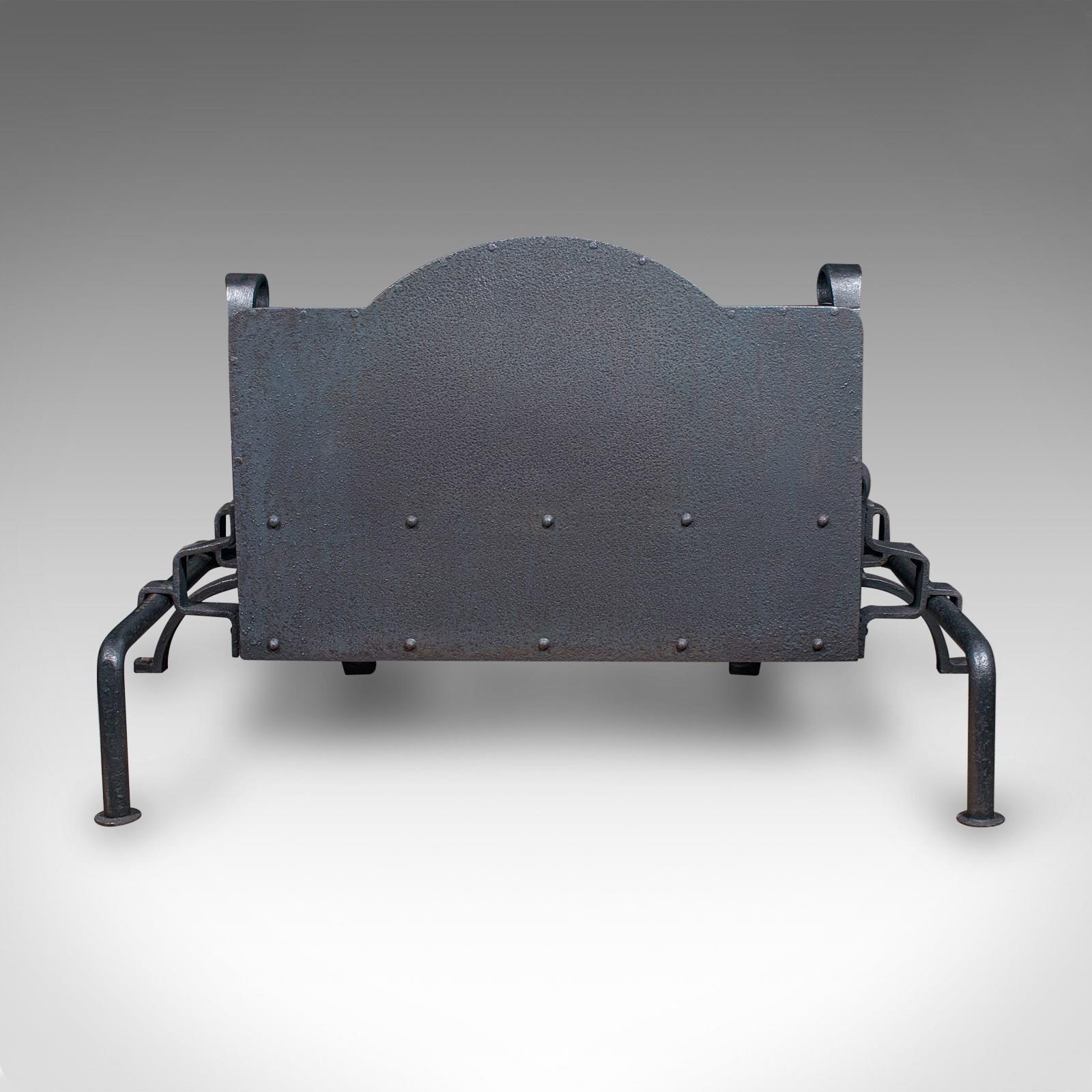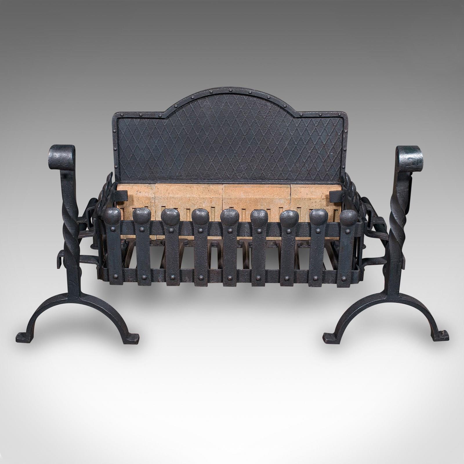 This is a large antique fireplace set. An English, cast iron inglenook fire basket with a pair of andirons, dating to the early Victorian period, circa 1850. A superb country house ensemble, offering generous scale and a wonderfully self-contained fireplace solution for the larger hearth.