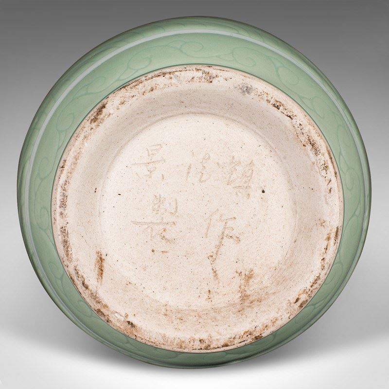 This is a large antique flower bouquet vase. A Chinese, Celadon ceramic display urn, dating to the late Victorian period, circa 1900.