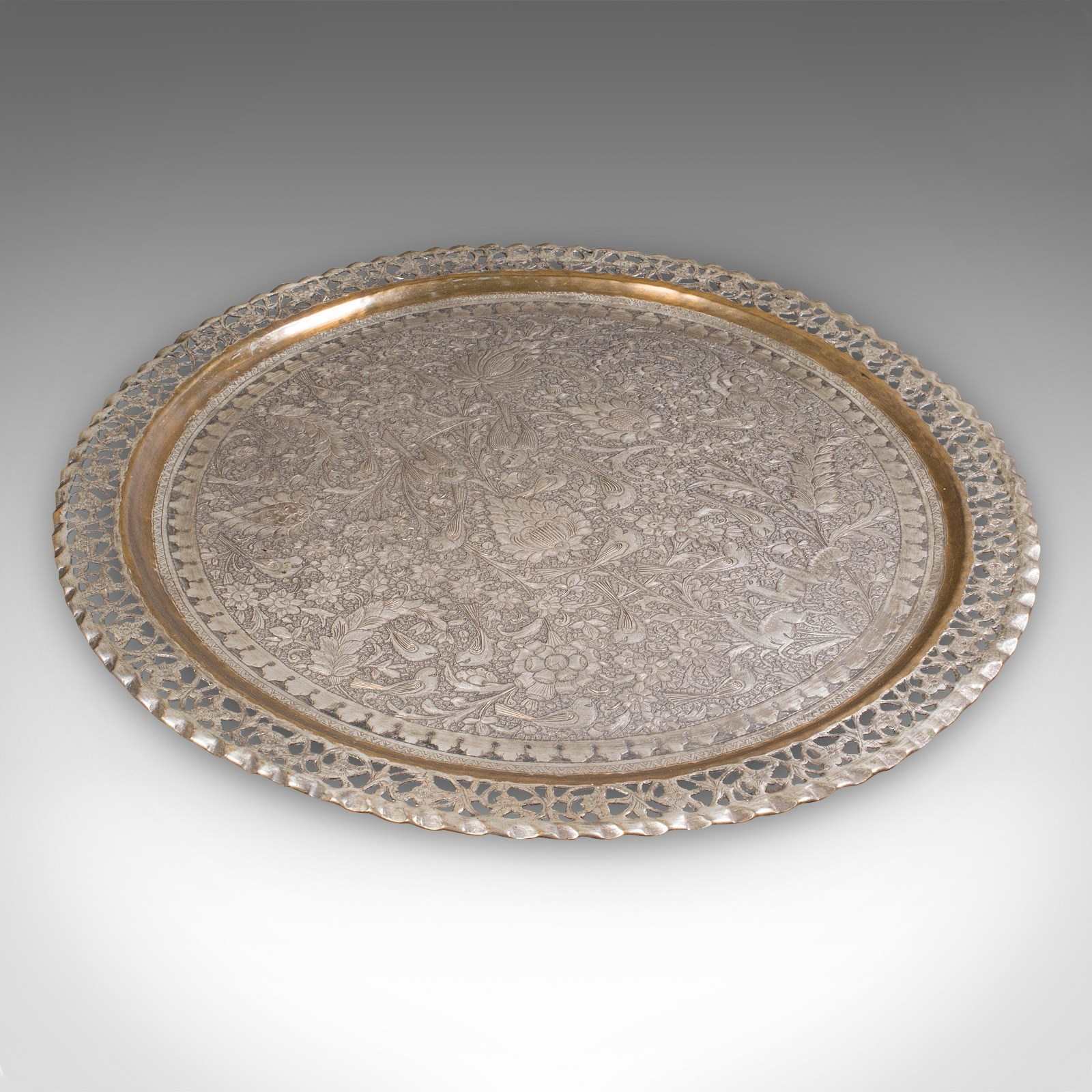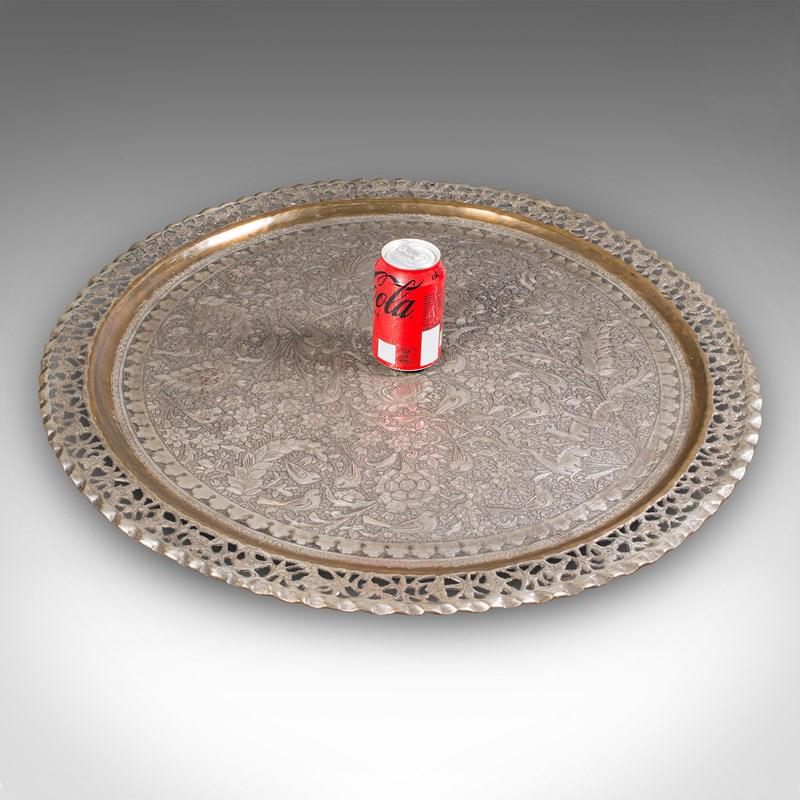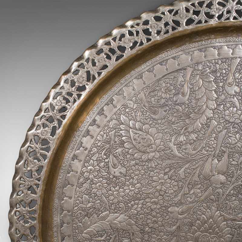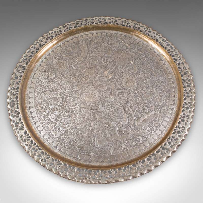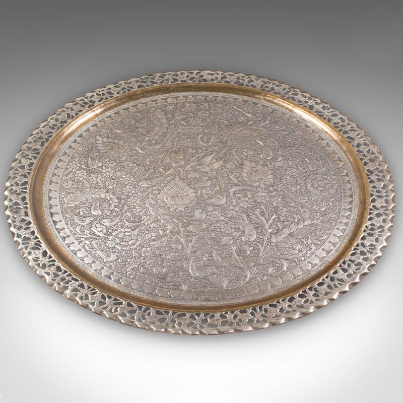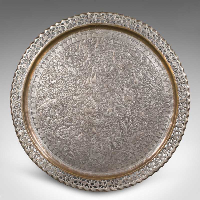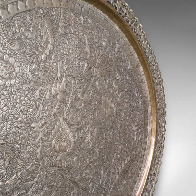 Large Antique Kashmiri Serving Tray, Indian, Silvered Brass, Platter, Victorian