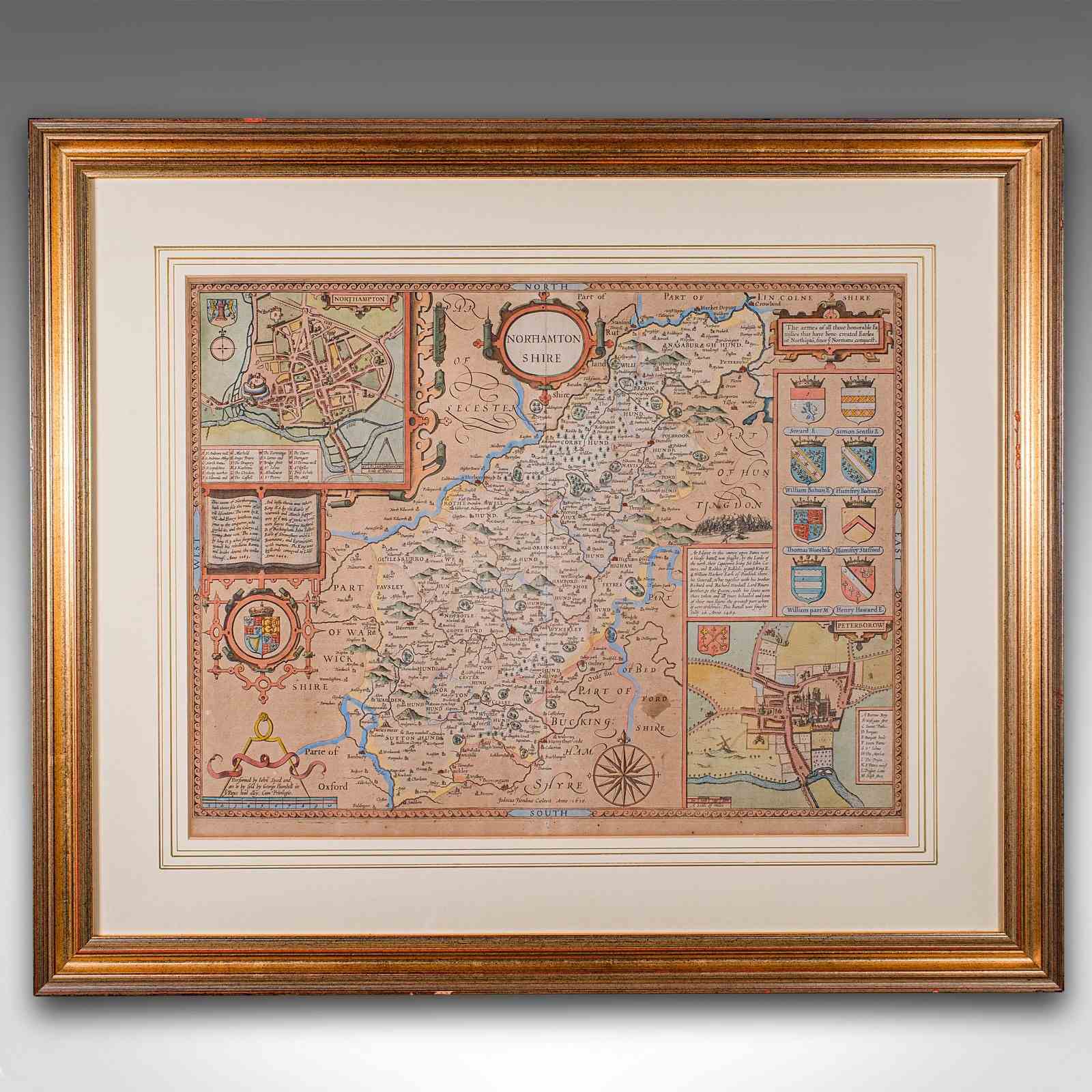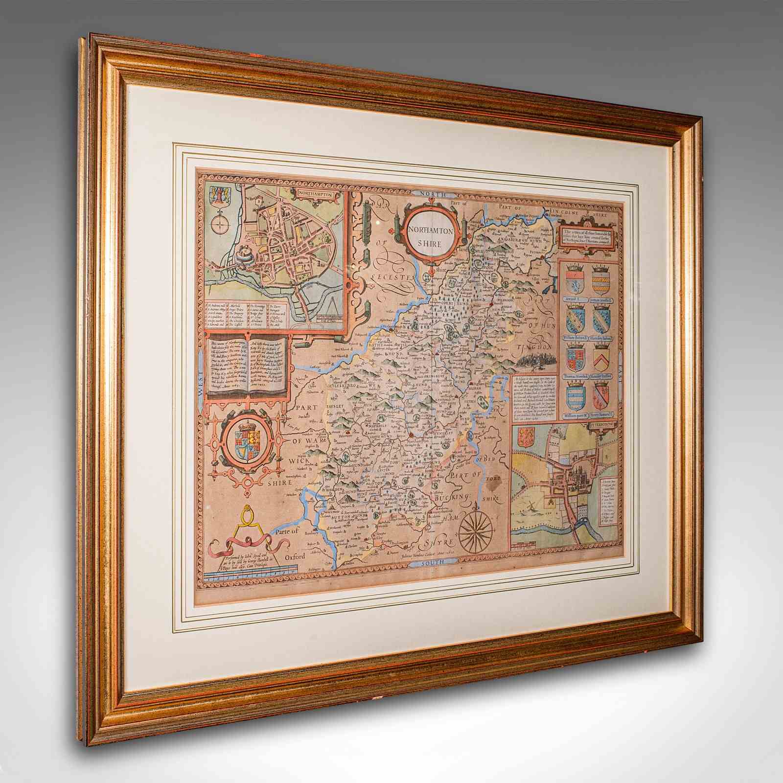 This is a large antique lithography map of Northamptonshire. An English, framed atlas engraving of cartographic interest by John Speed, dating to the early 17th century and later.