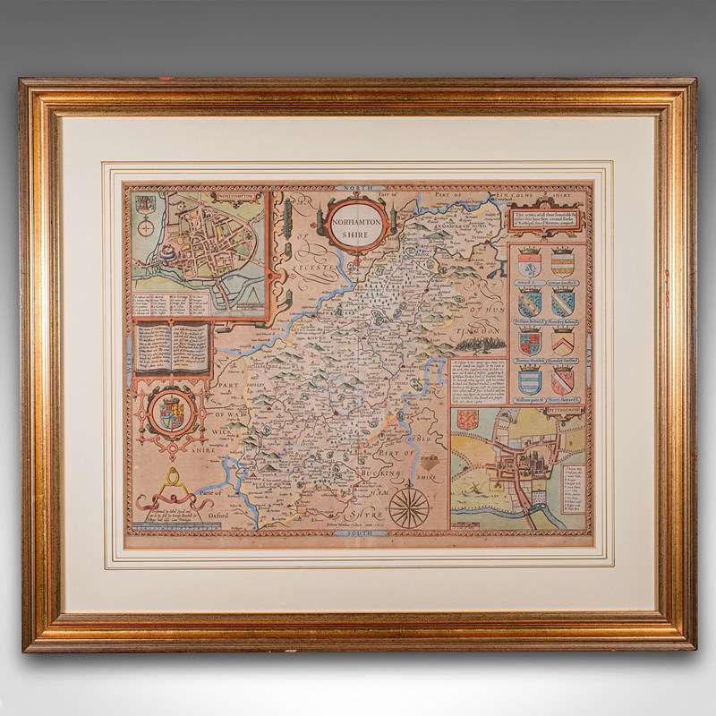 Large Antique Lithography Map, Northamptonshire, Framed Cartography, John Speed