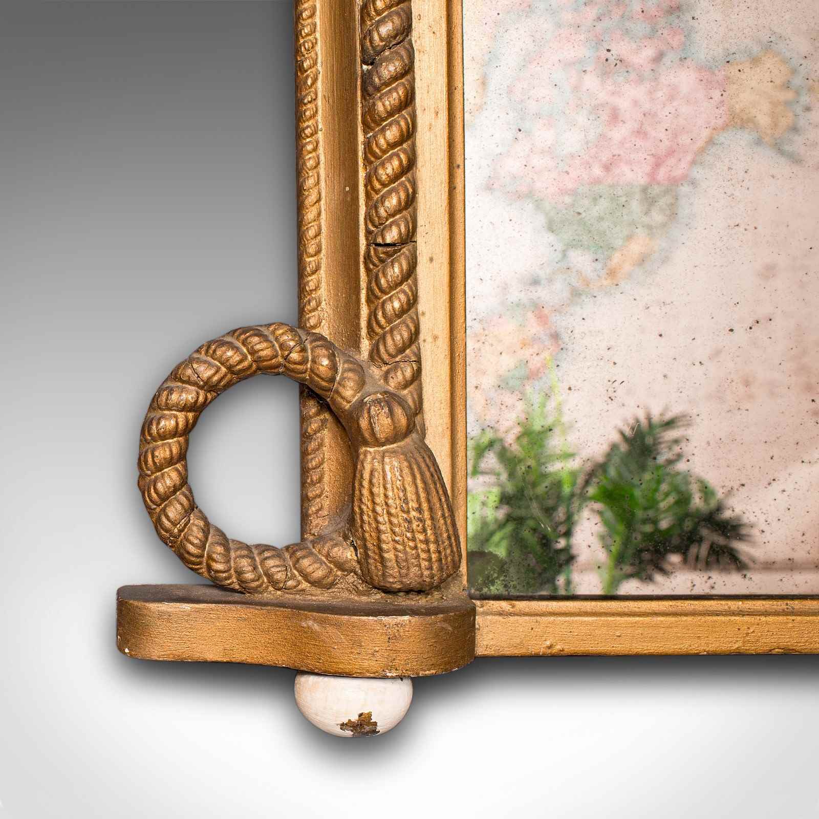 This is a large antique overmantle mirror. An English, giltwood and mercury glass lounge mirror, presenting distinctive nautical taste, dating to the early Victorian period, circa 1850.