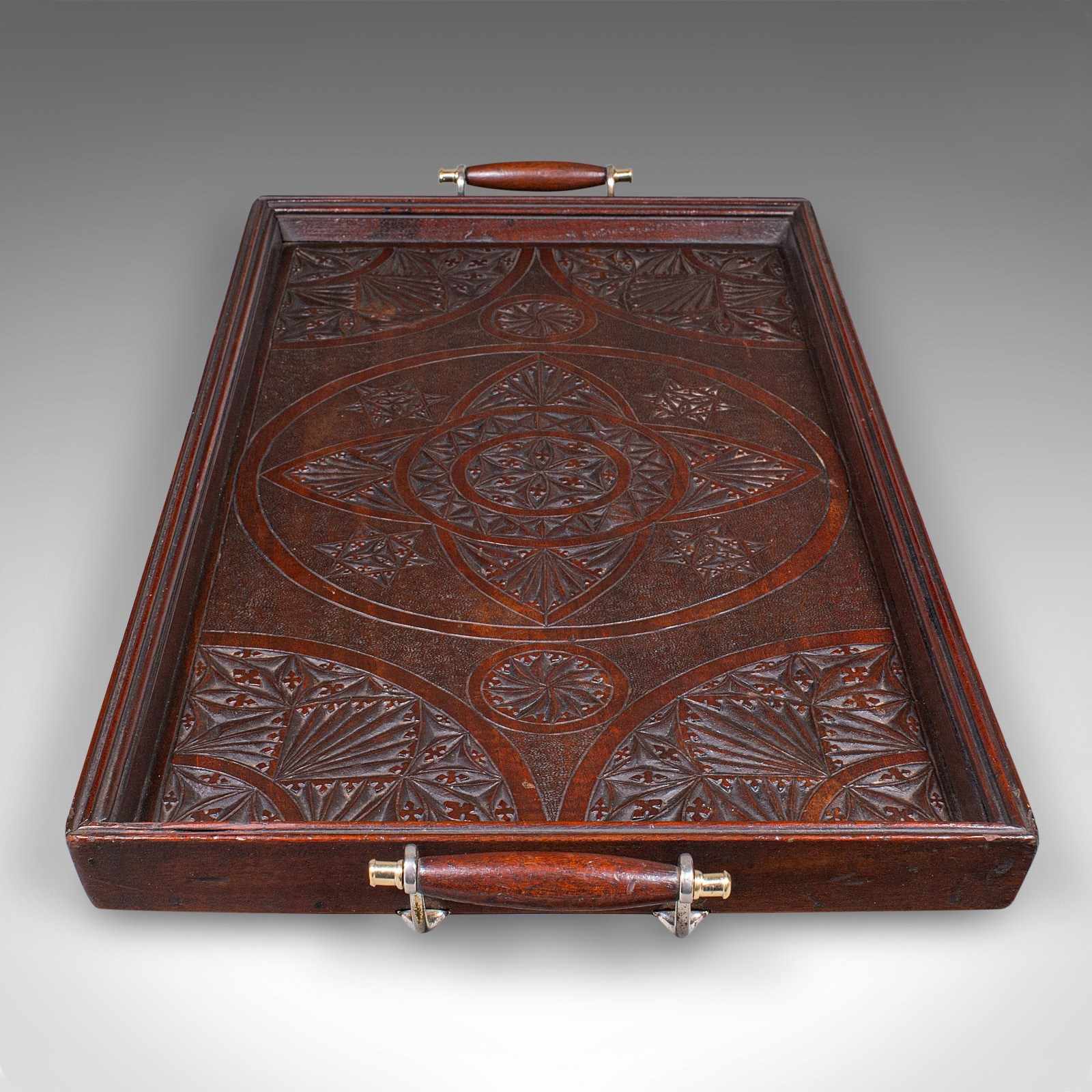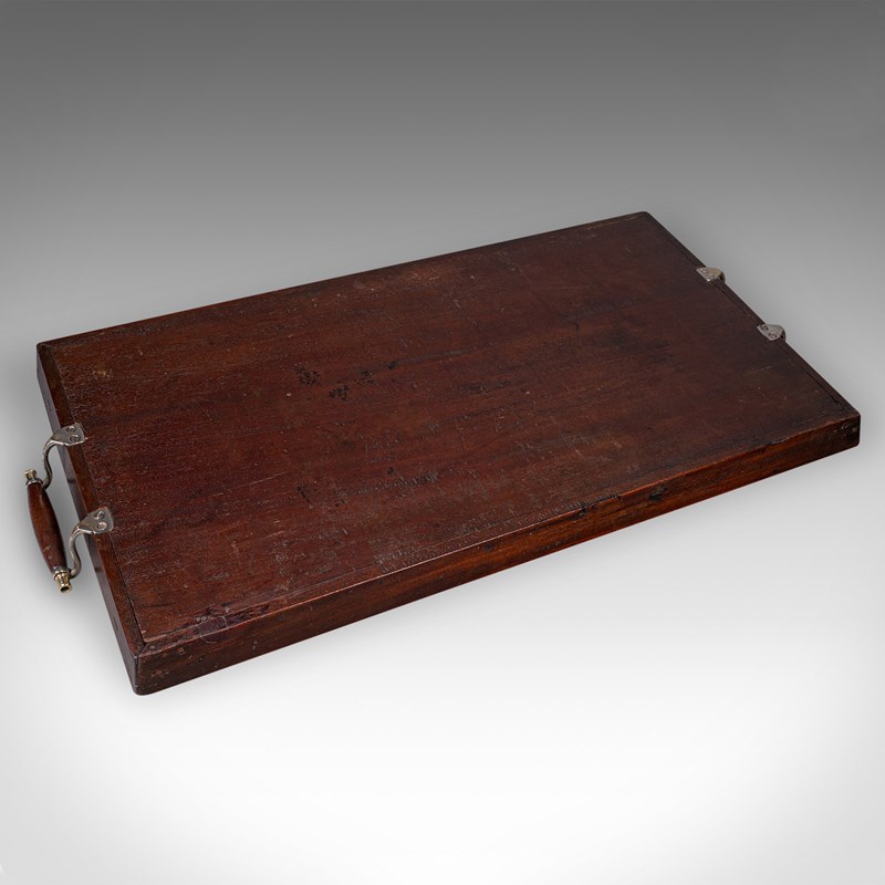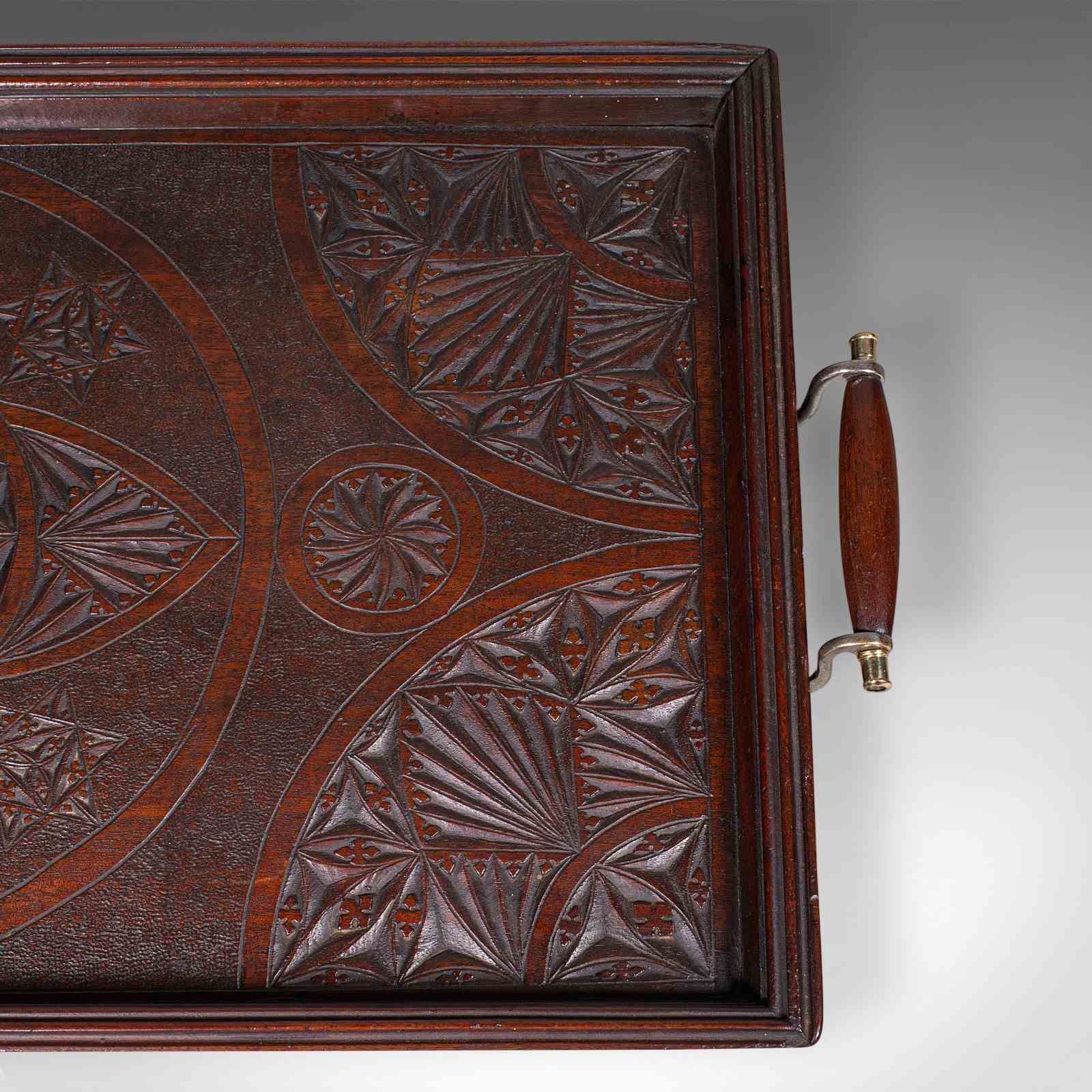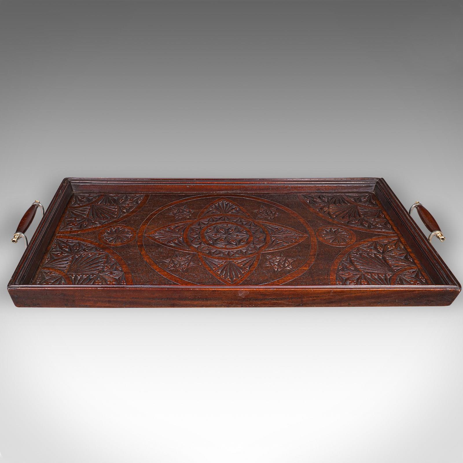 This is a large antique presentation tray. An English, mahogany afternoon tea serving platter, dating to the Edwardian period, circa 1910. Of fine proportion and quality craftsmanship, this piece combines practical function with elegant decorative appeal.