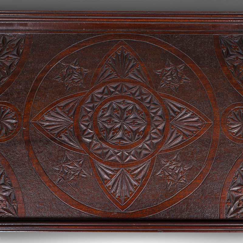 Relief carved centre features a foliate motif medallion framed by demi-lune panels
