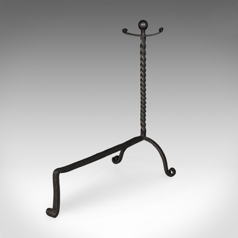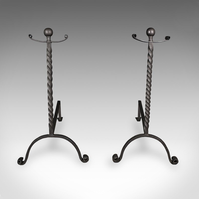 This is a smart pair of antique andirons, with appealing twist detail and of useful size for larger fire baskets. Delivered ready for the home.
