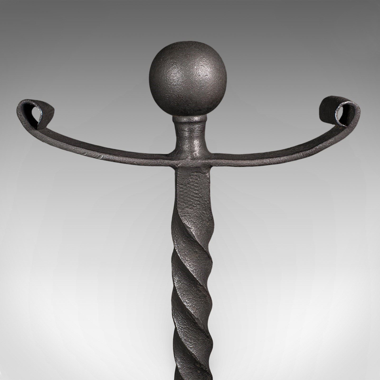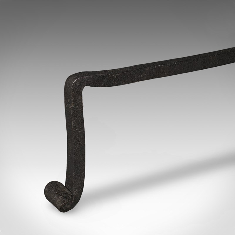 This is a large pair of antique fireplace andirons. An English, wrought iron fire dog, dating to the Victorian period, circa 1860.