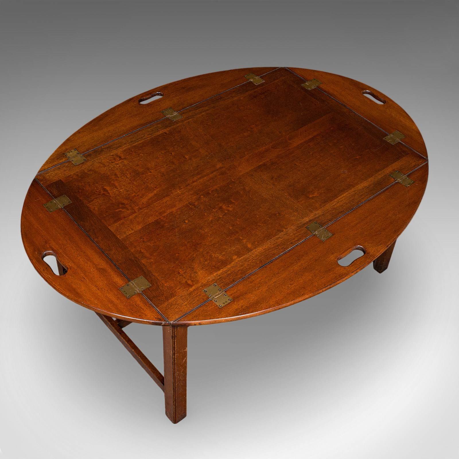 This is a large vintage butler's tray table. An English, mahogany and brass drop-flap serving stand, dating to the Art Deco period, circa 1930. A highly versatile serving piece with excellent colour and generous proportion.