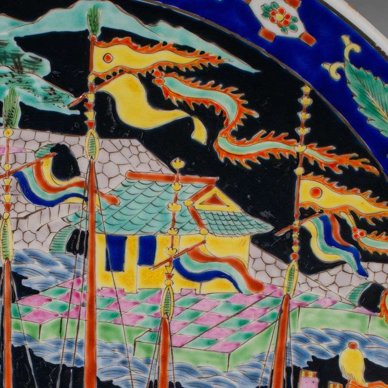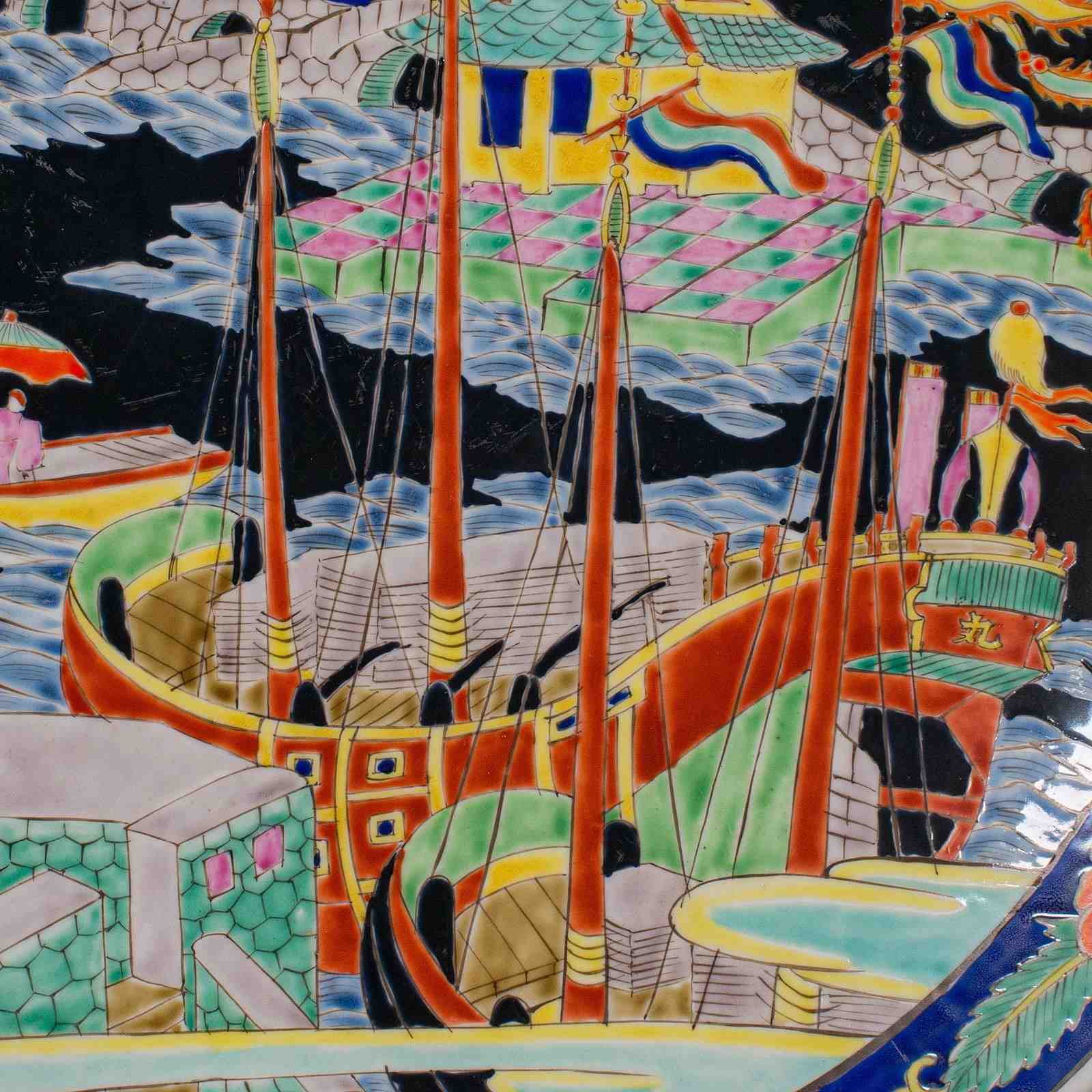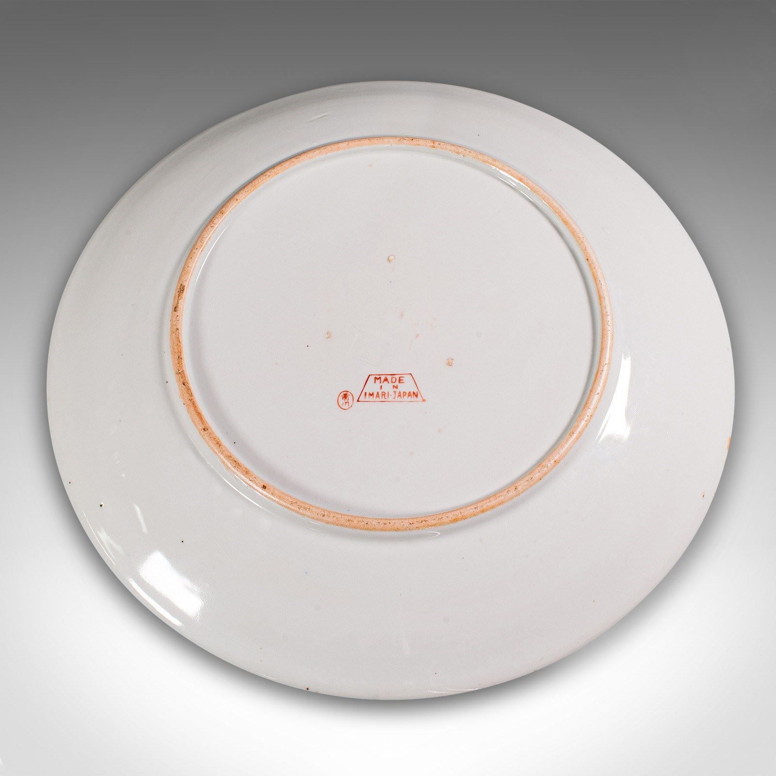 This is a large vintage Imari plate. A Japanese, ceramic decorative charger, dating to the Art Deco period, circa 1930.