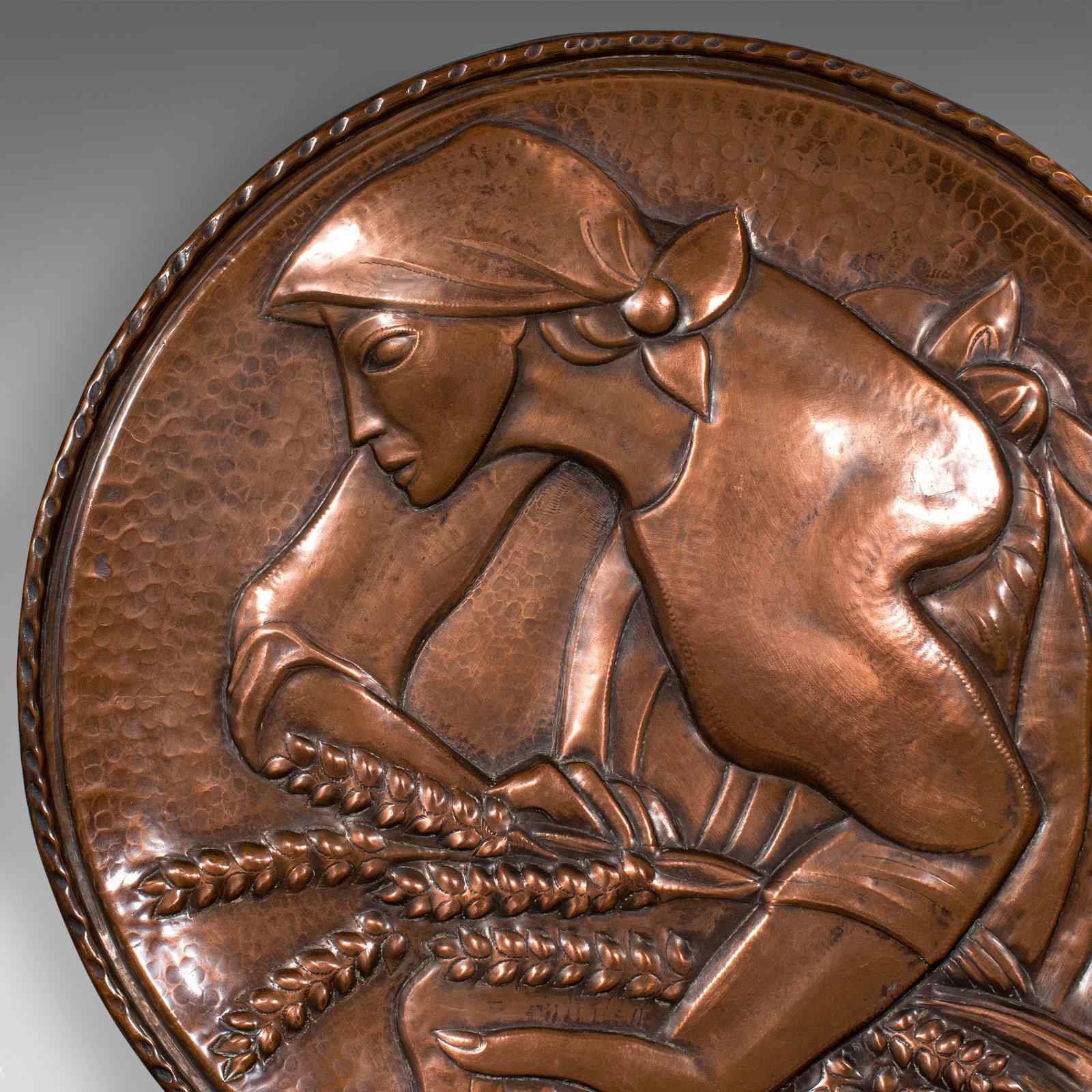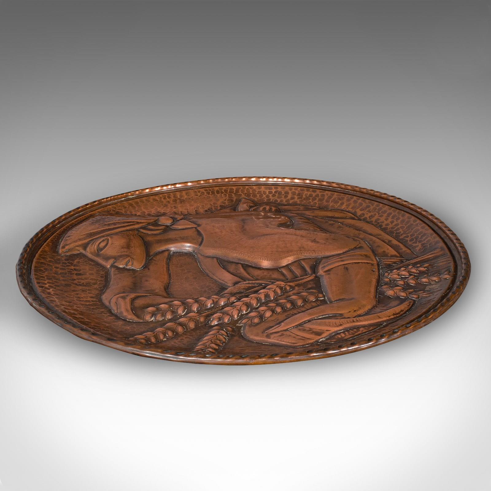 This is a large vintage relief charger. A Belgian, hand beaten copper decorative harvest tray, dating to the early 20th century, circa 1930.