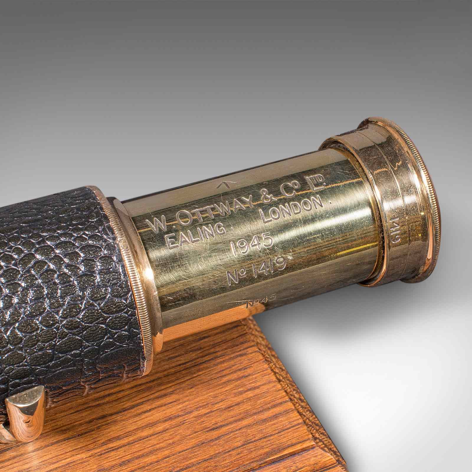 This is a large vintage WWII telescope, an English brass terrestrial instrument by Ottway & Co of London, dated 1945 and marked with the military broad arrow.