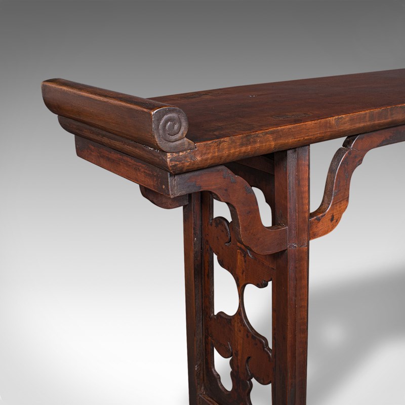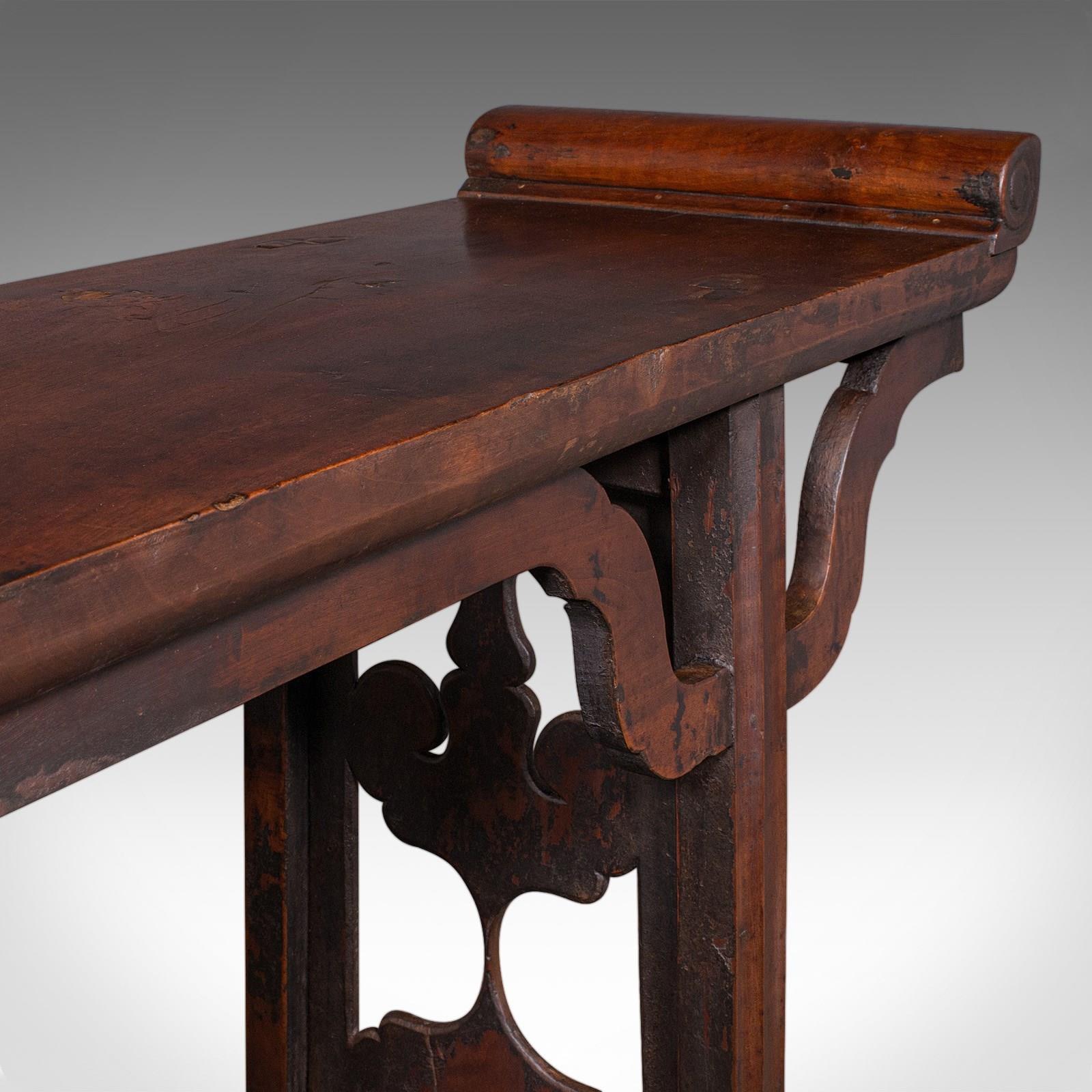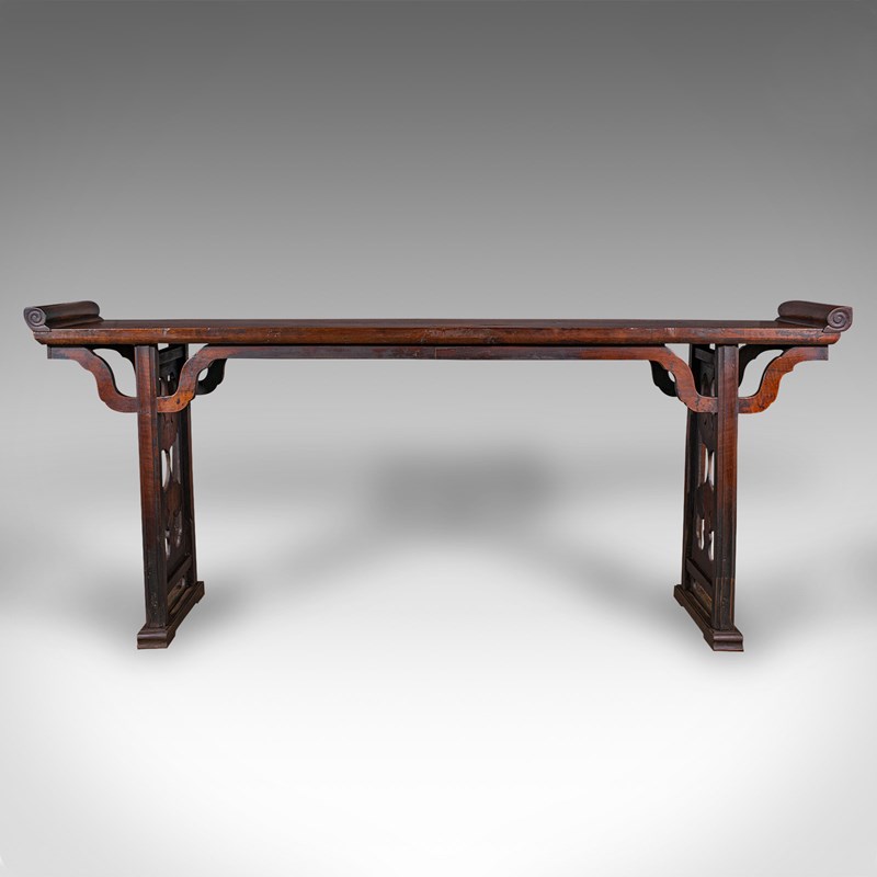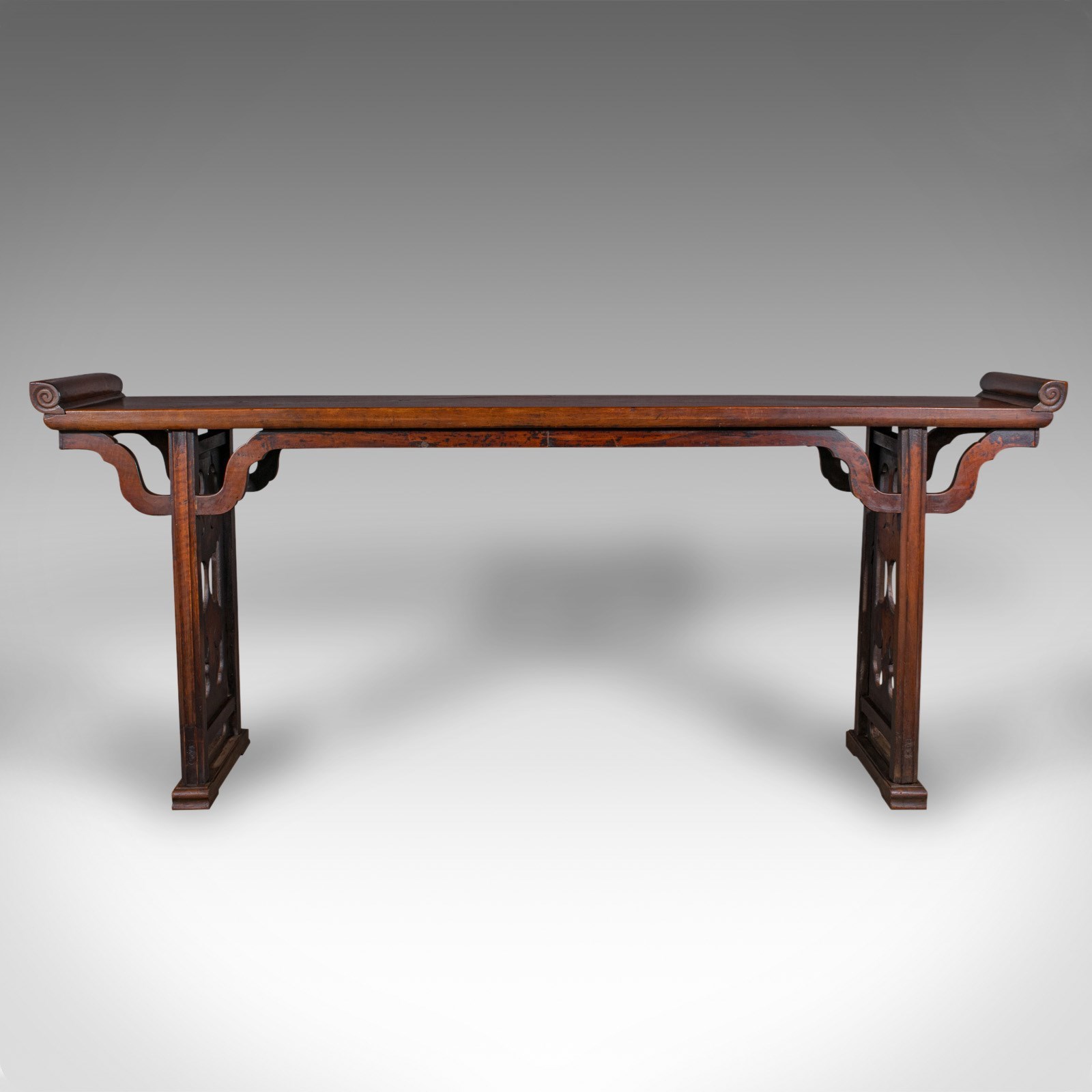 This is a long antique altar table. An Oriental, Asian Elm hallway, display or serving table, dating to the early Victorian period, circa 1850. Graced with commanding proportion and classical elegance, this piece exemplifies the decorative finesse of Qing dynasty aesthetics.