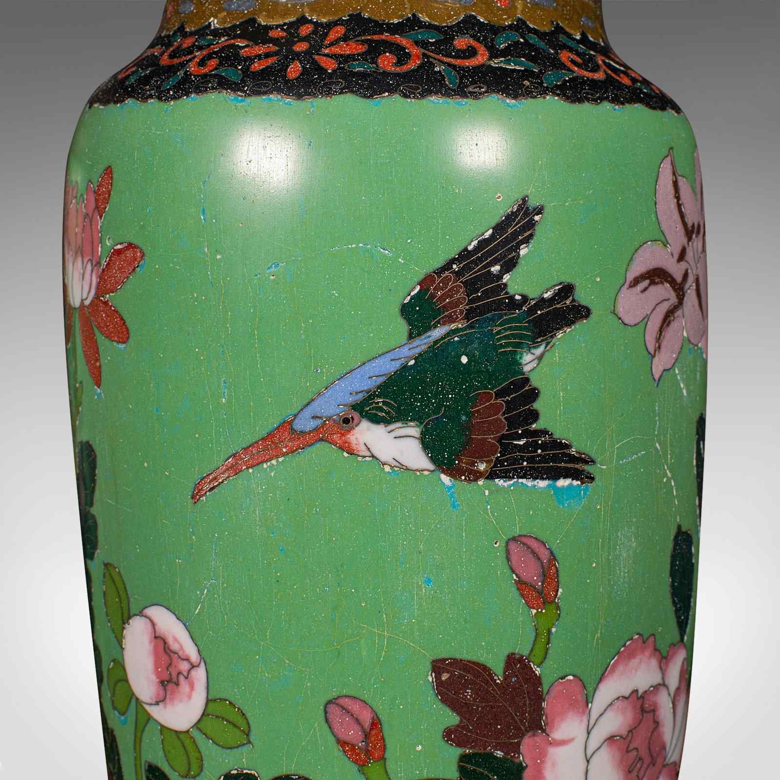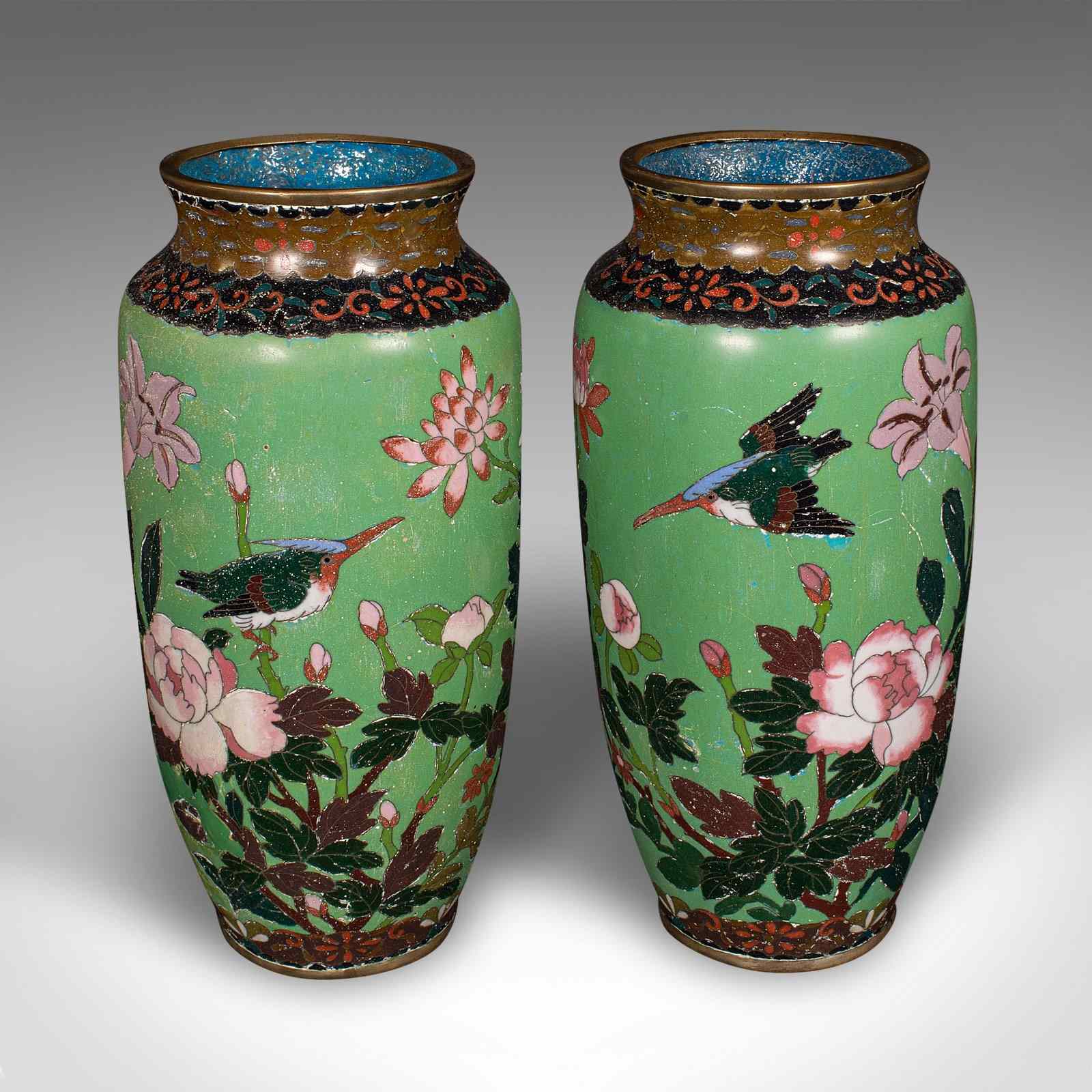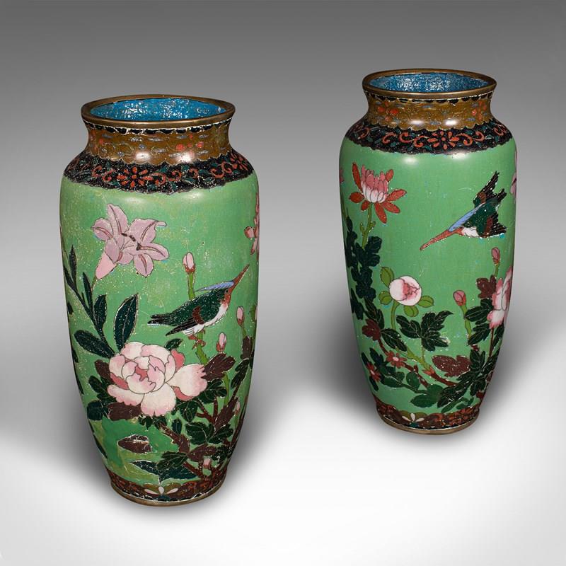 This is an appealing pair of antique baluster vases, with a charming Japanese decorative finish in cloisonné. Delivered ready to display.