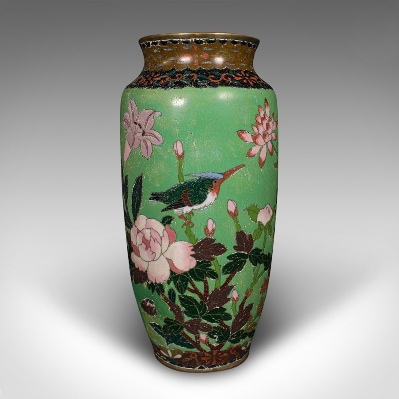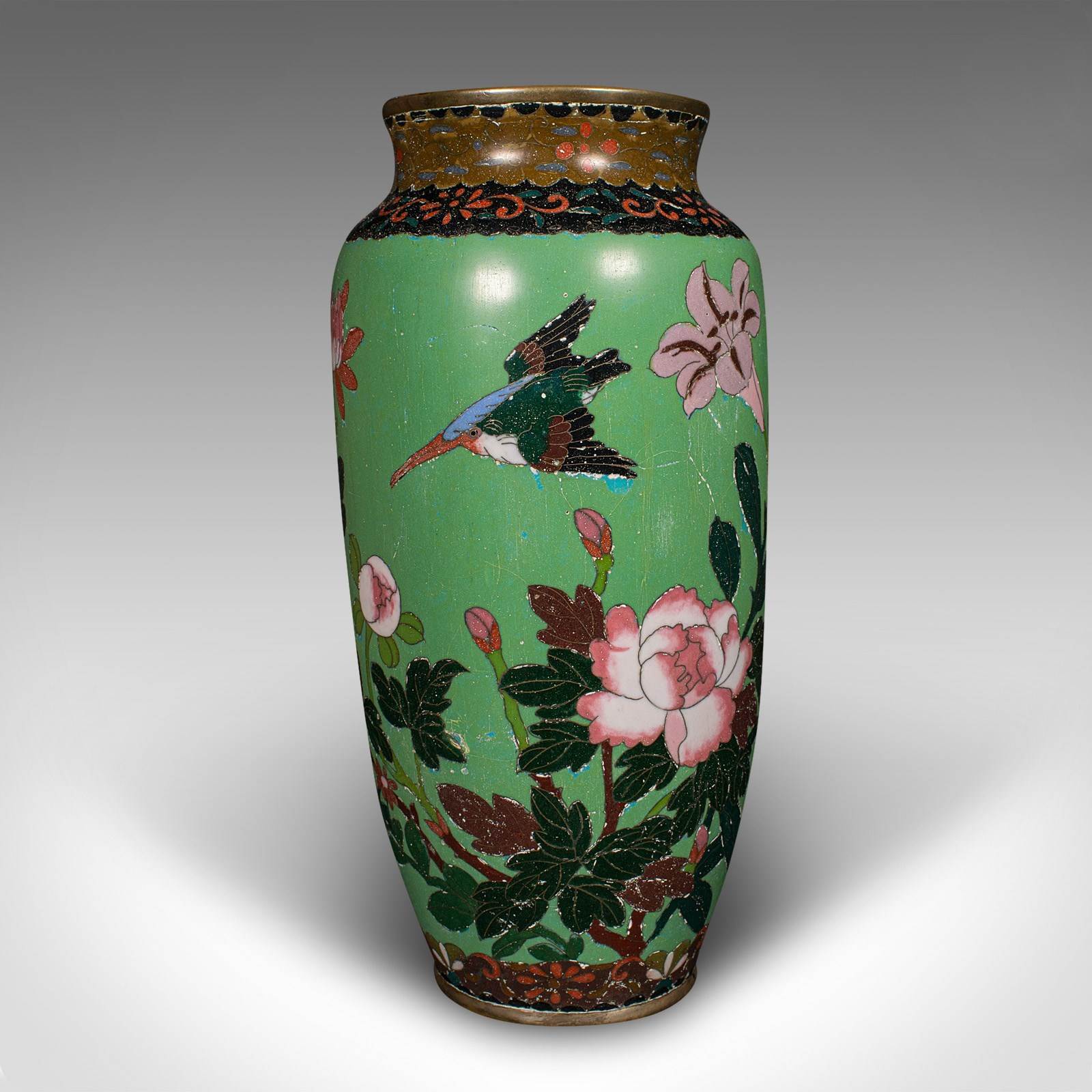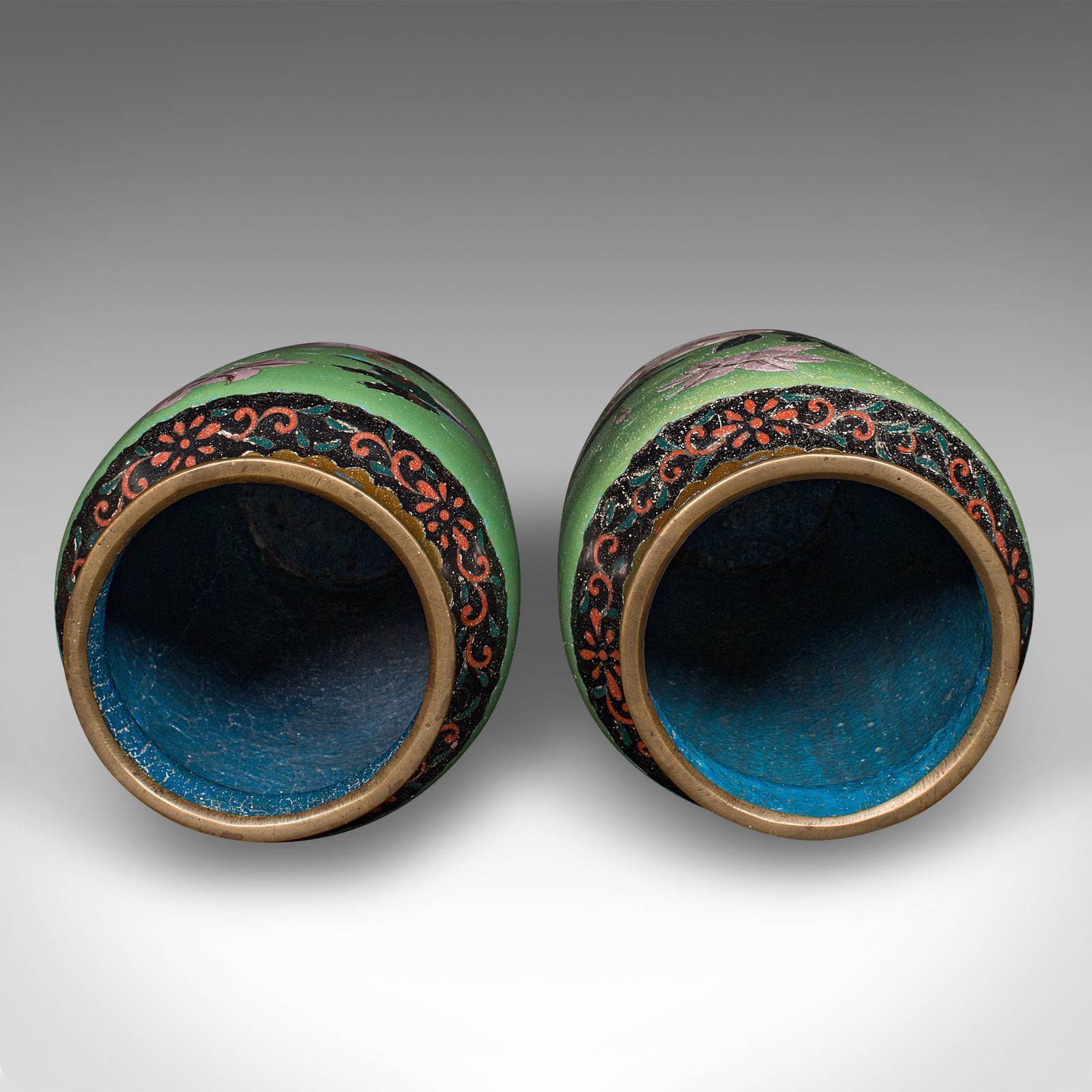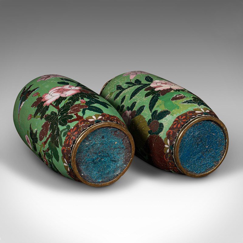 This is an appealing pair of antique baluster vases, with a charming Japanese decorative finish in cloisonné. Delivered ready to display.