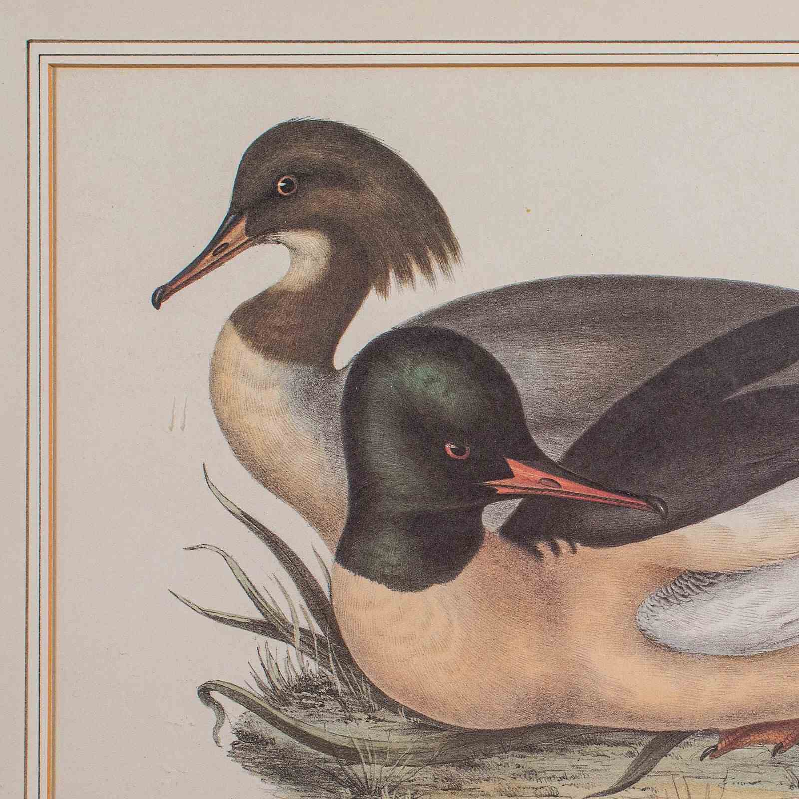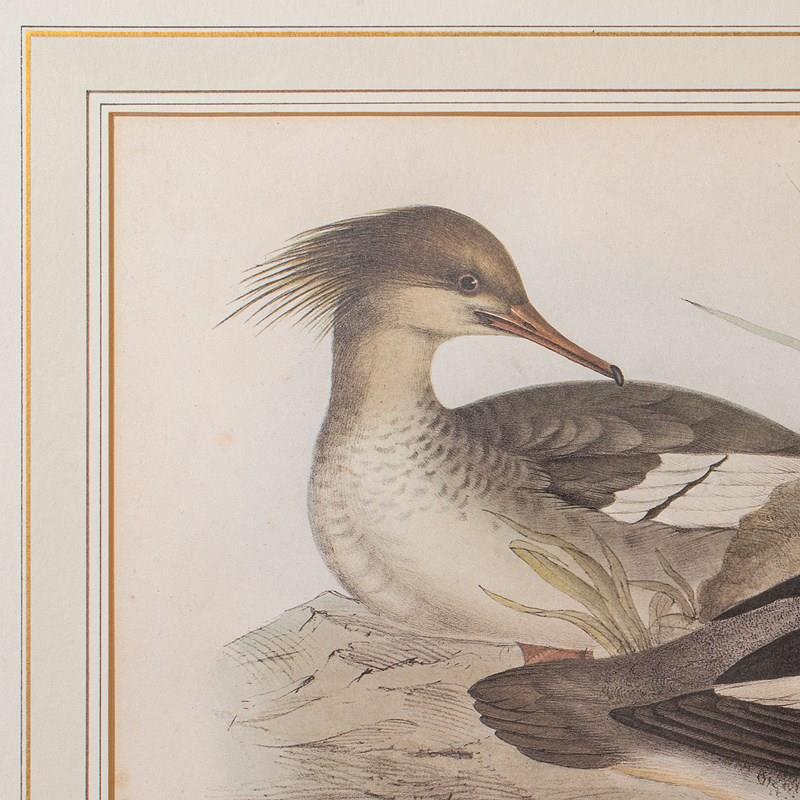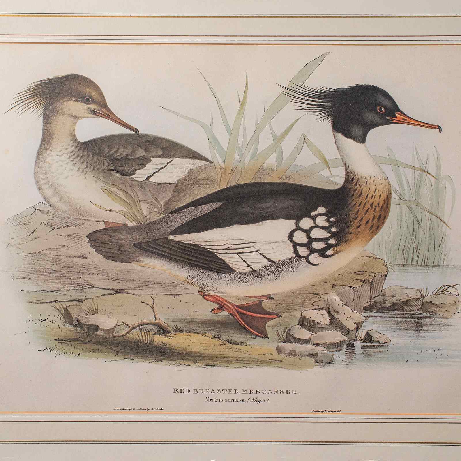 This is a pair of antique duck pictures. An English, framed print of a Red Breasted Merganser and Goosander by John and Elisabeth Gould (1785 - 1851), dating to the early Victorian period, circa 1850.