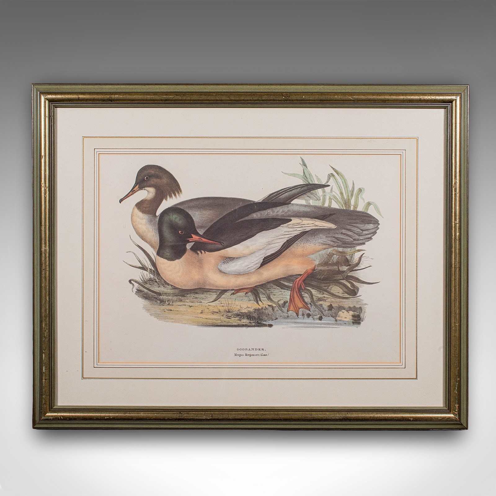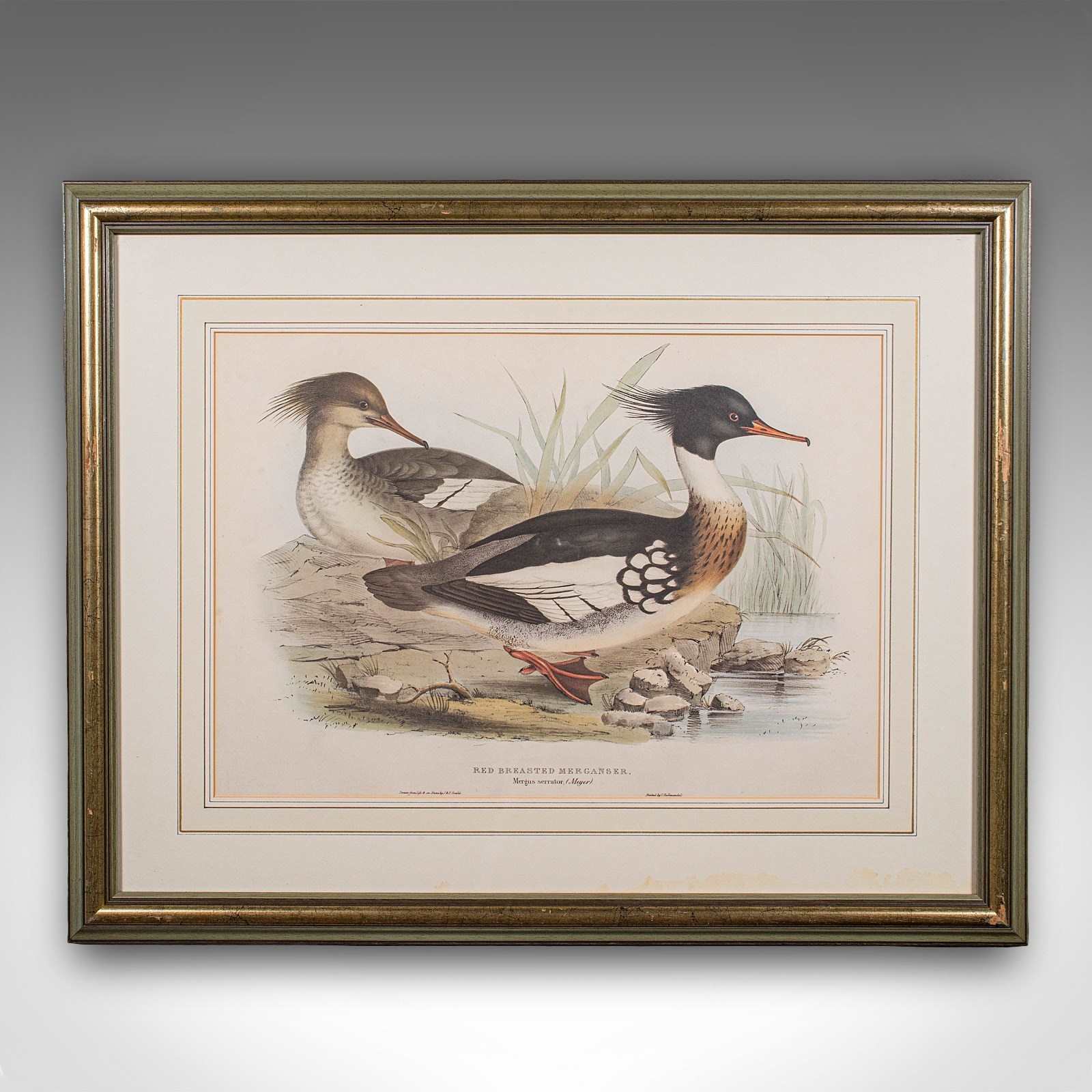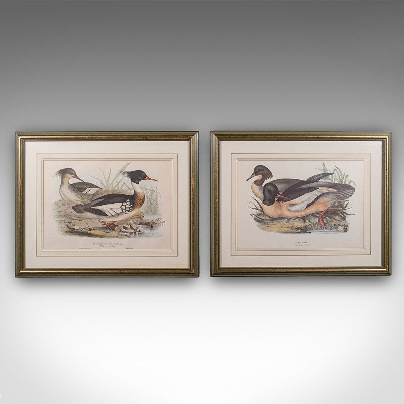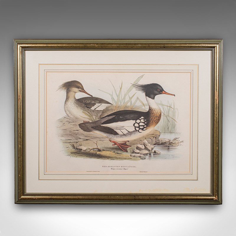 This is a pair of antique duck pictures. An English, framed print of a Red Breasted Merganser and Goosander by John and Elisabeth Gould (1785 - 1851), dating to the early Victorian period, circa 1850.