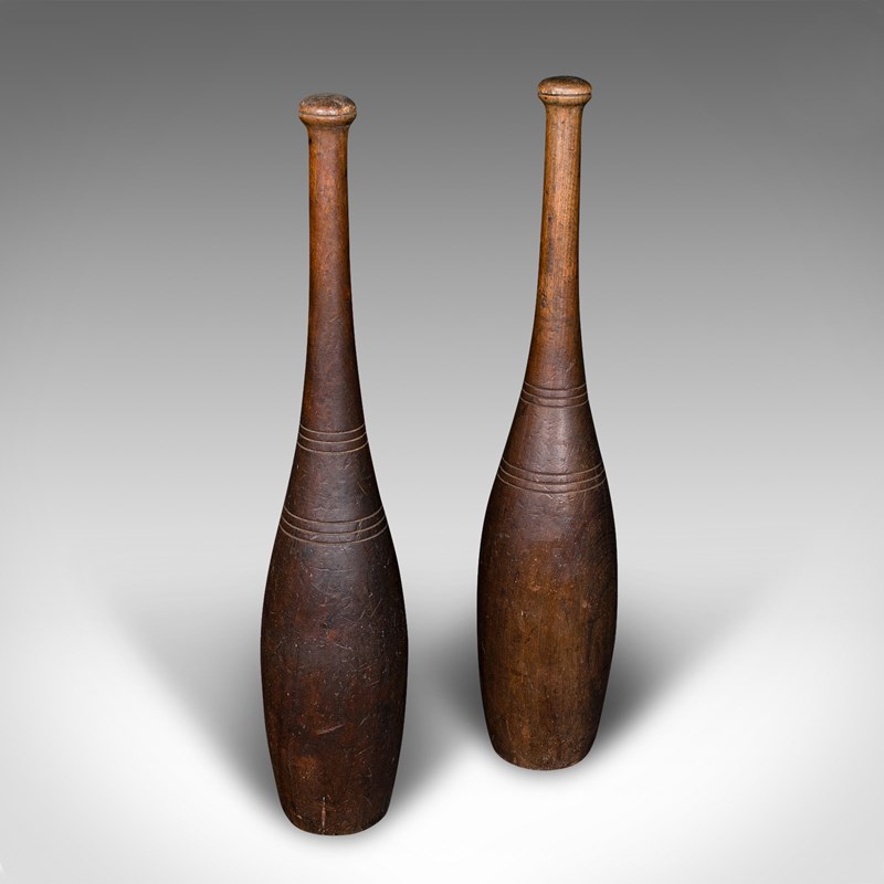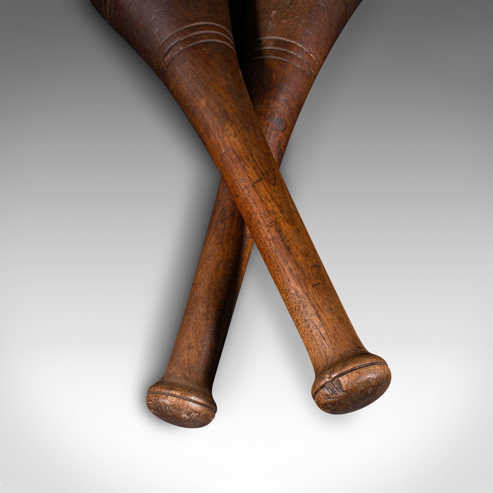 This is a pair of antique exercise clubs. An English, weighted beech fitness aid, dating to the early 20th century, circa 1920.