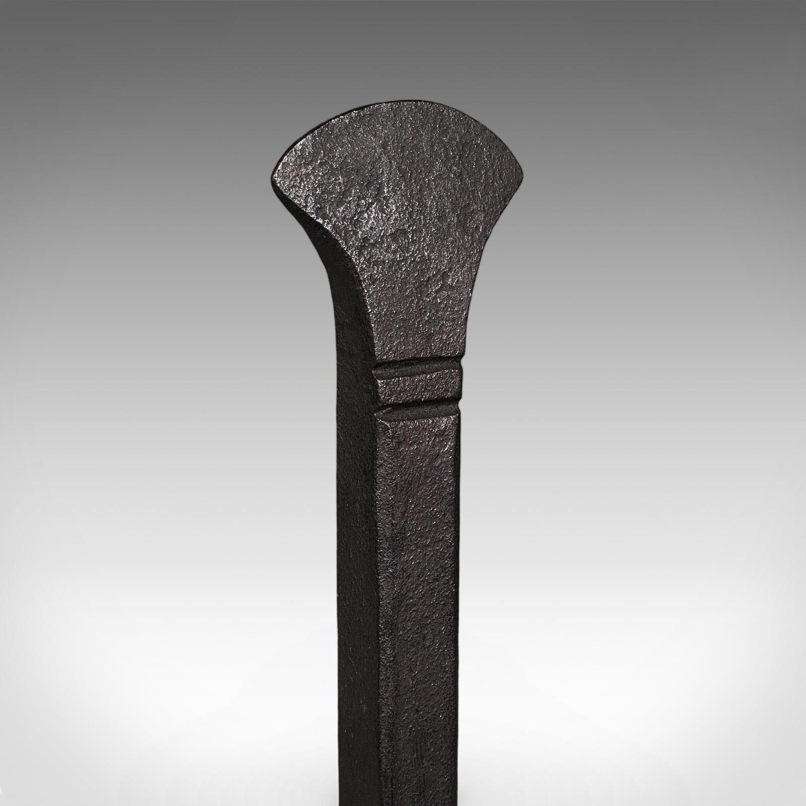 This is a pair of antique fire dogs. An English, wrought iron fireplace andiron, dating to the Victorian period, circa 1900.
