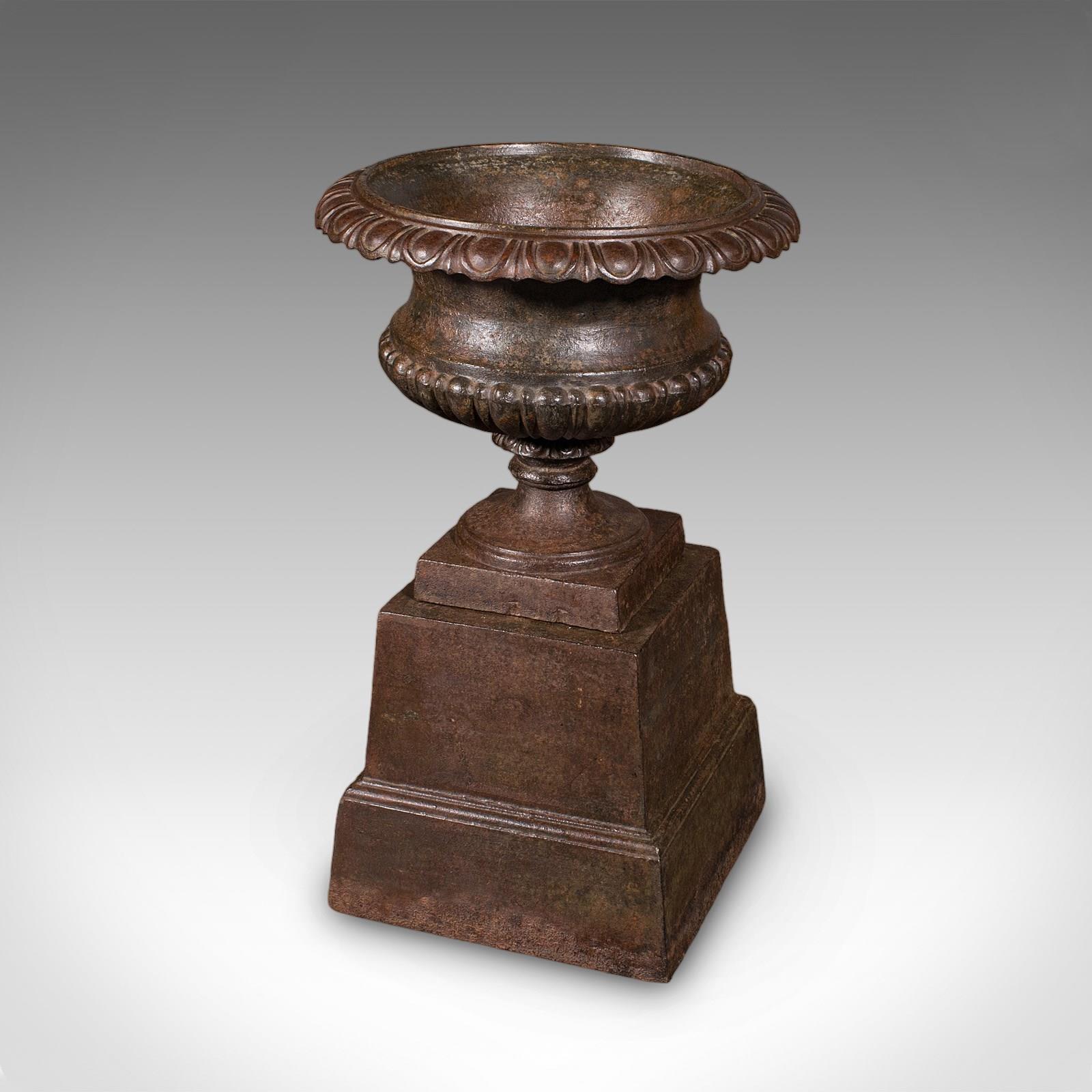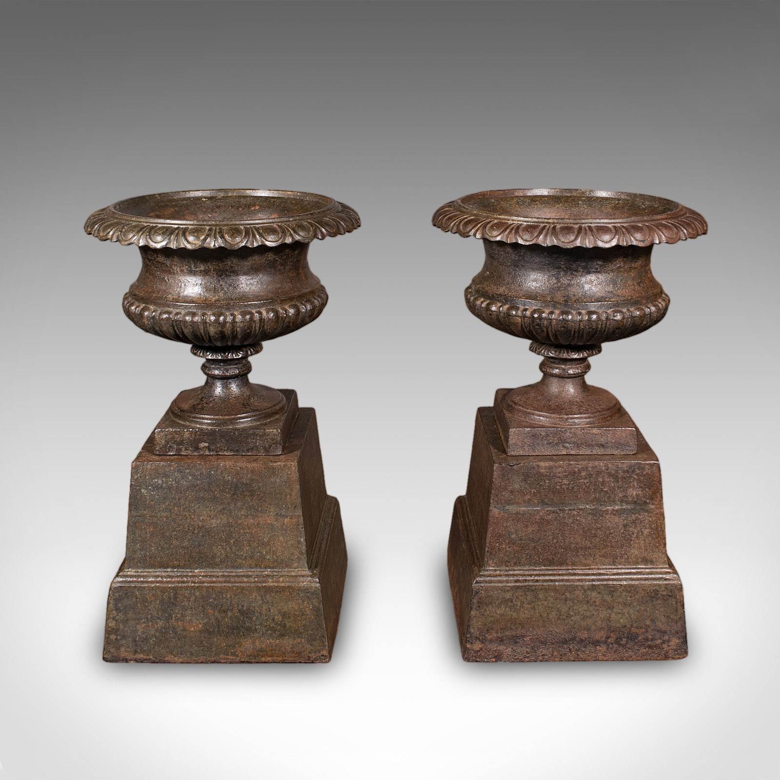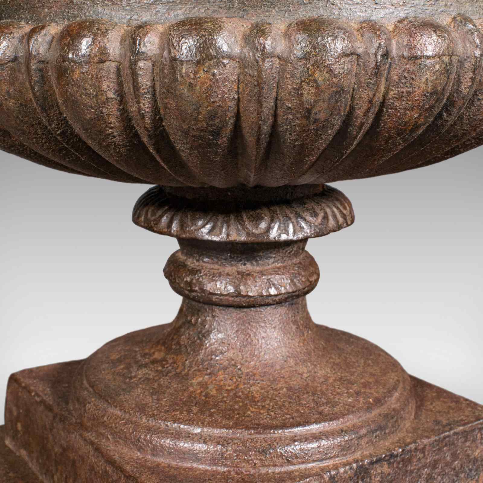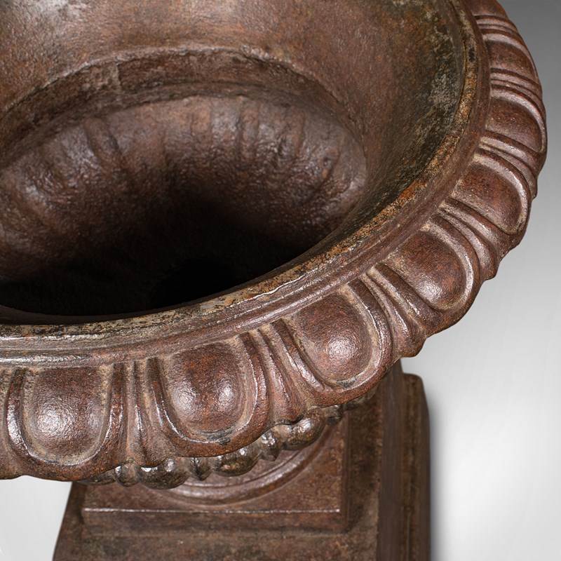 This is a large pair of antique garden planters. An English, cast iron outdoor display urn from the time of the Great Exhibition, dating to the Victorian period, circa 1850.