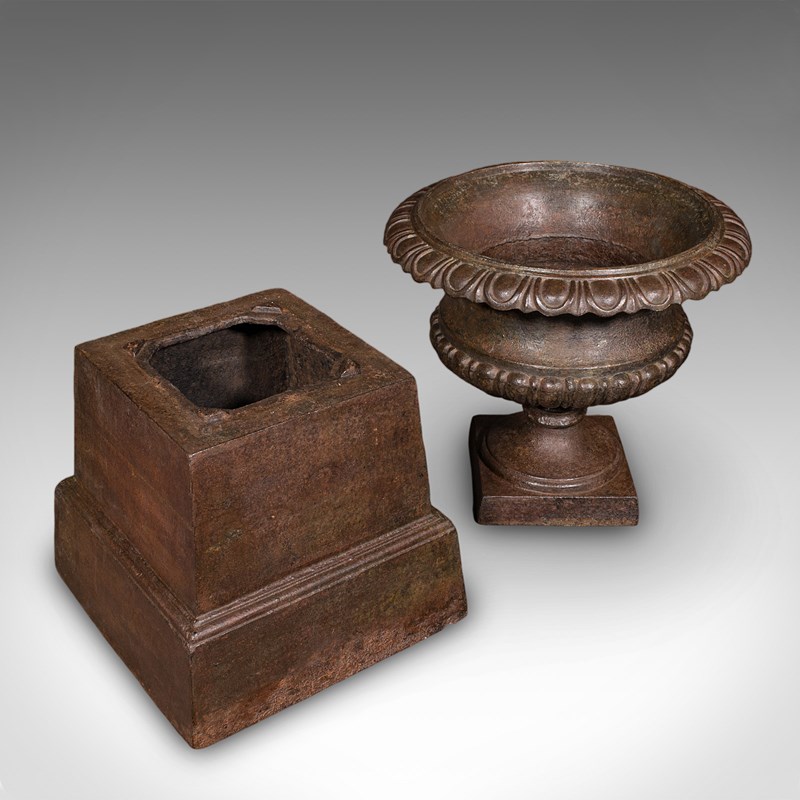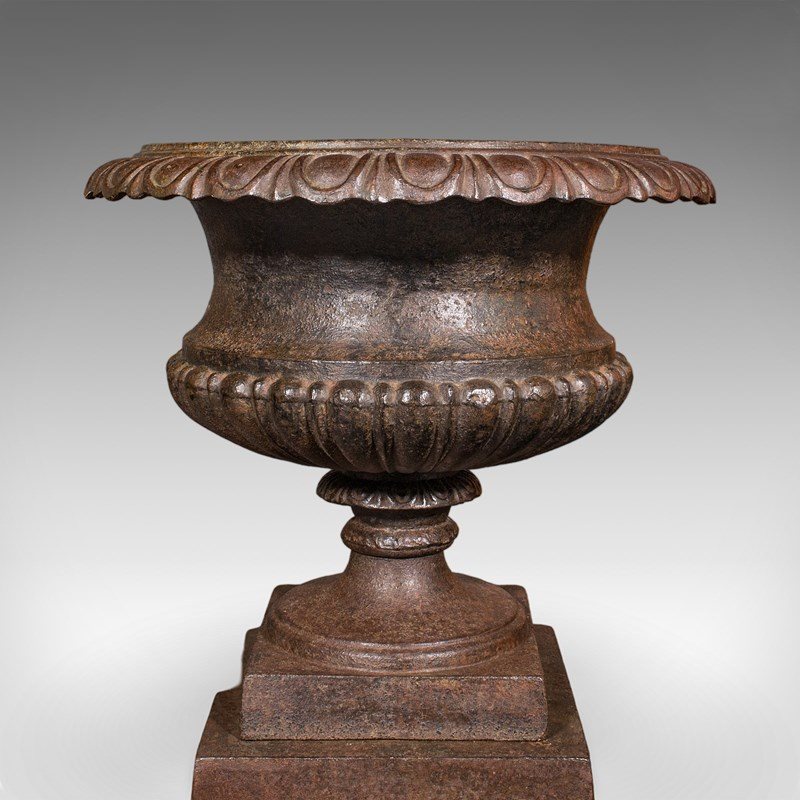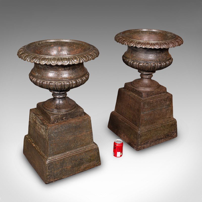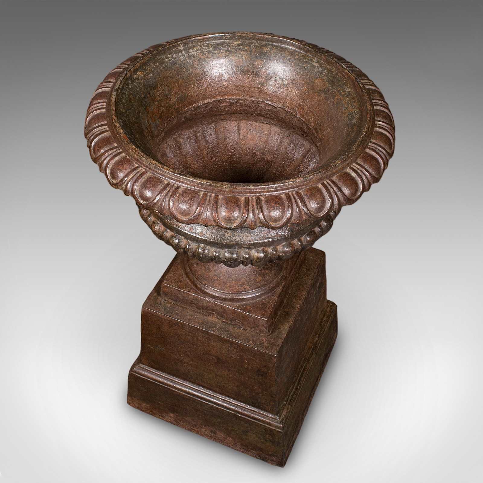 This is a large pair of antique garden planters. An English, cast iron outdoor display urn from the time of the Great Exhibition, dating to the Victorian period, circa 1850.