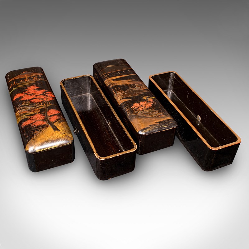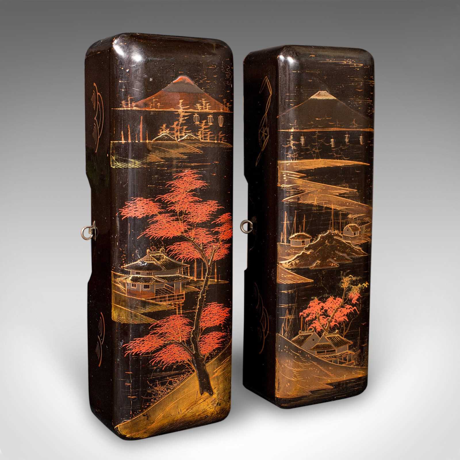 A fine pair of late Victorian Japanese glove boxes, brimming with character and artistry — perfect for collectors of oriental antiques or to grace a well-appointed dressing table. Delivered ready for the home.