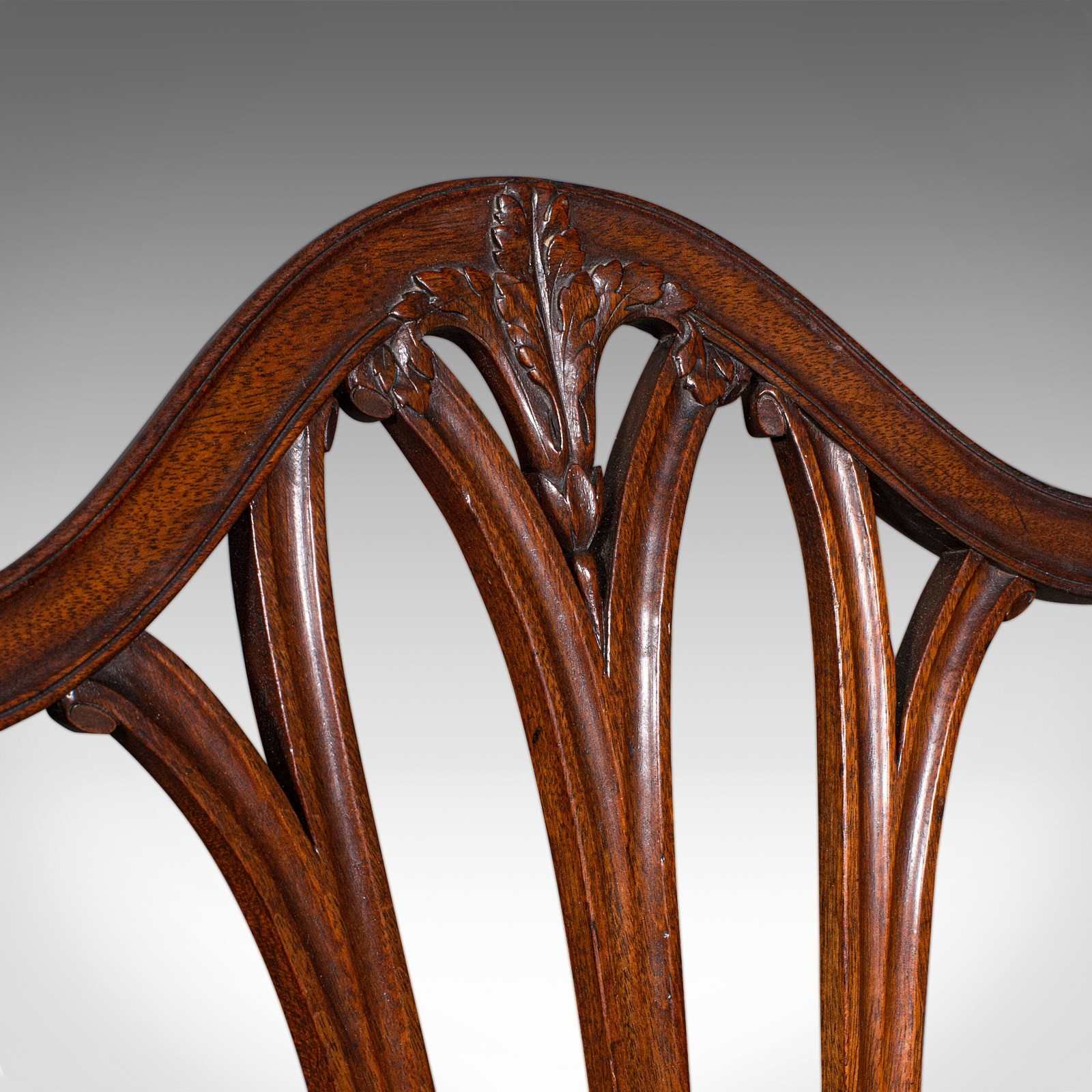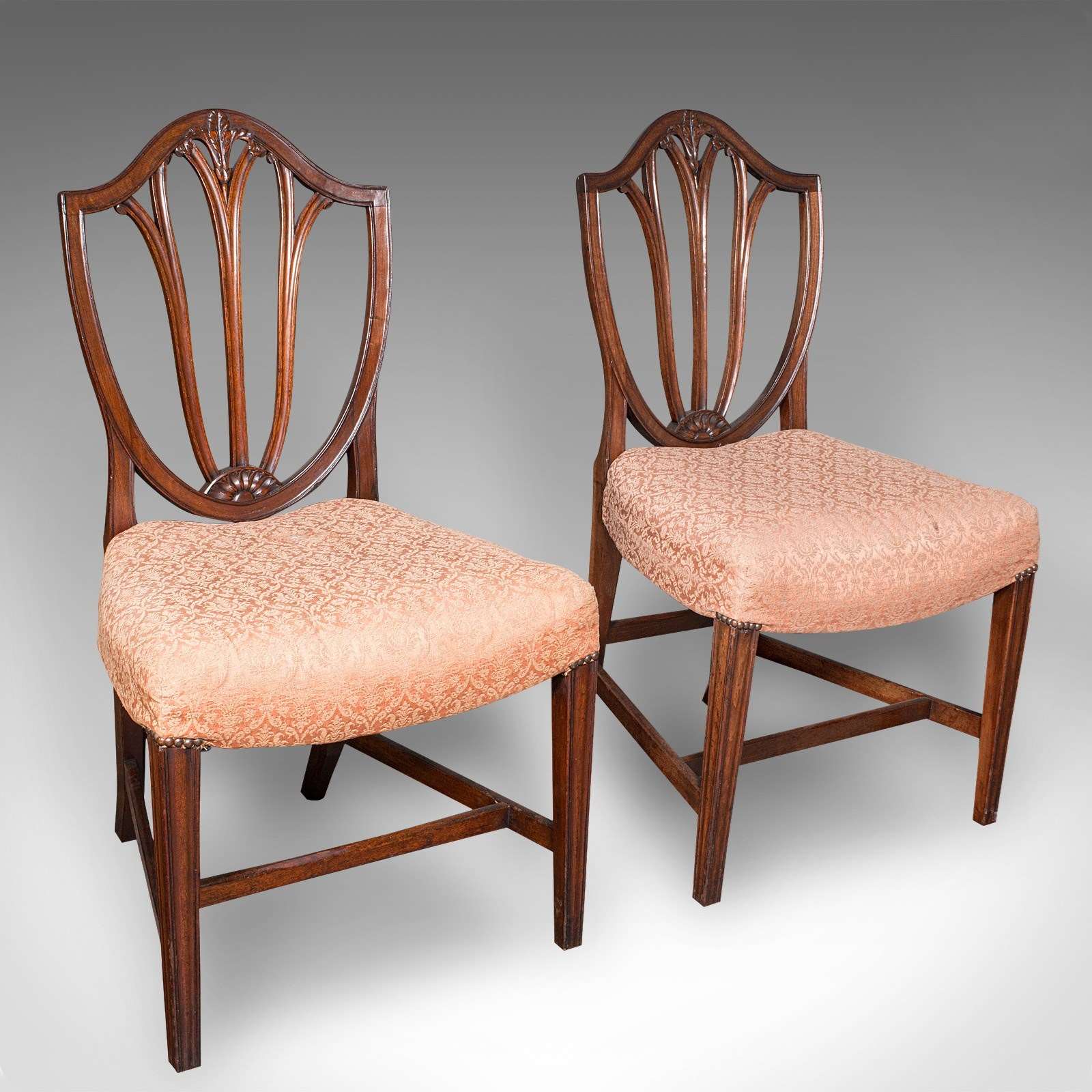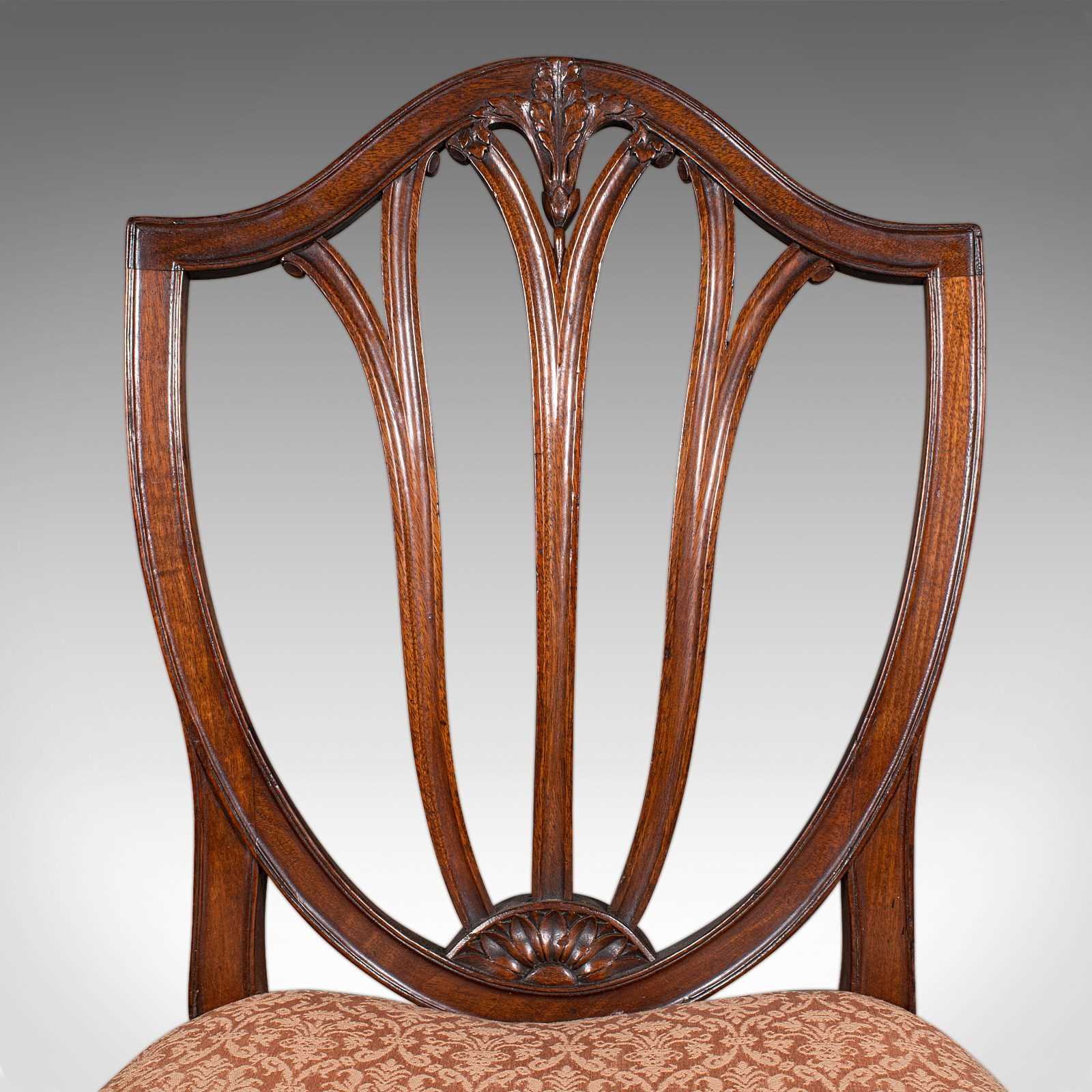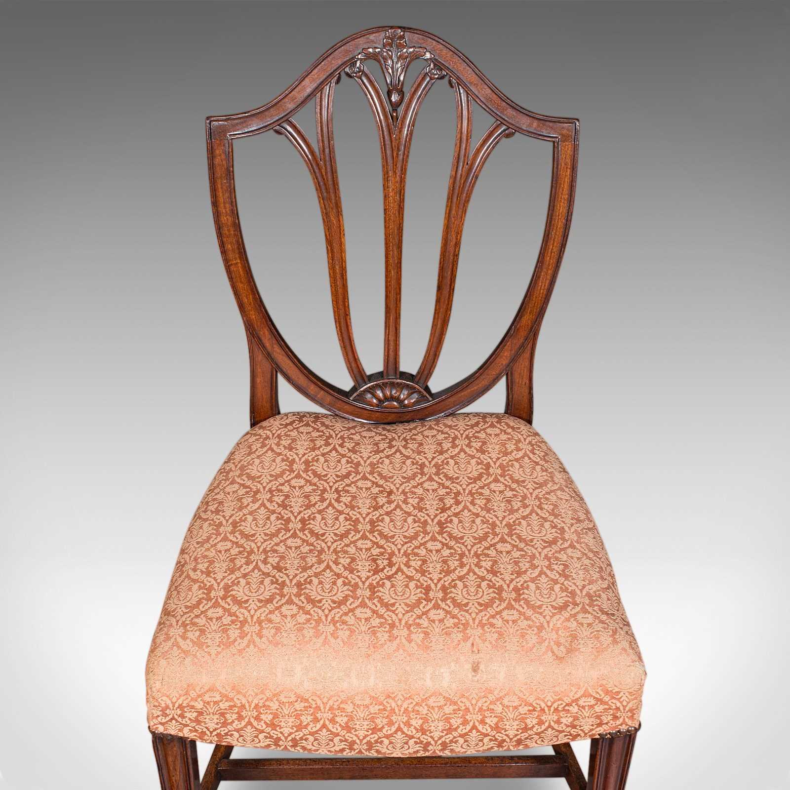This is a fascinating pair of antique Hepplewhite taste side chairs, ready to accentuate a reception hall of a fine country house, or accents at the side of a room. Solid joints and construction, delivered ready for the home.
