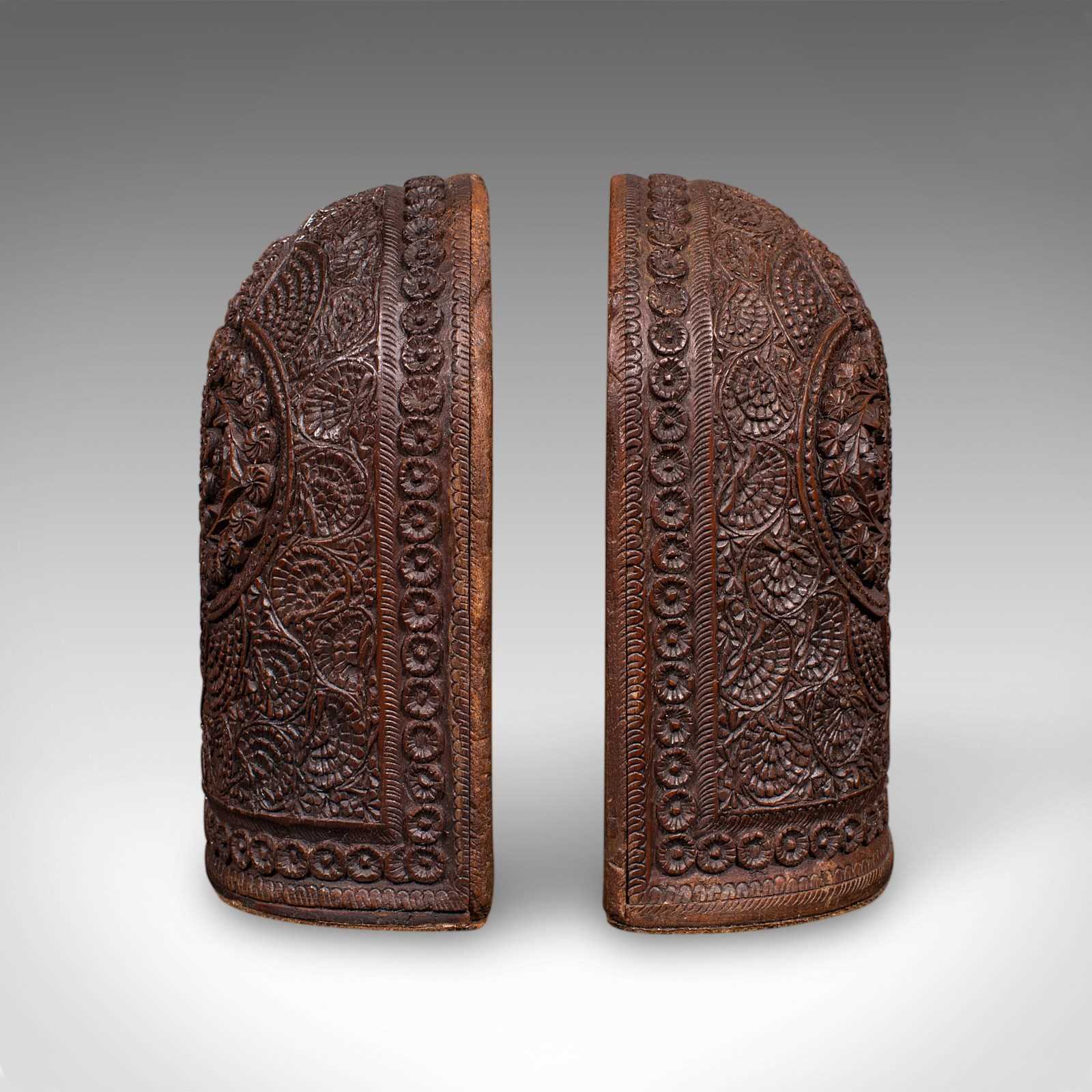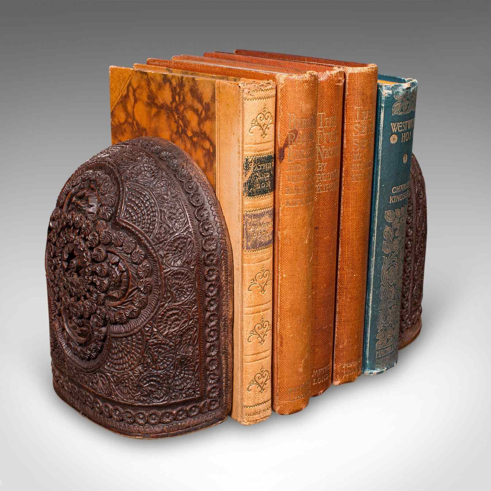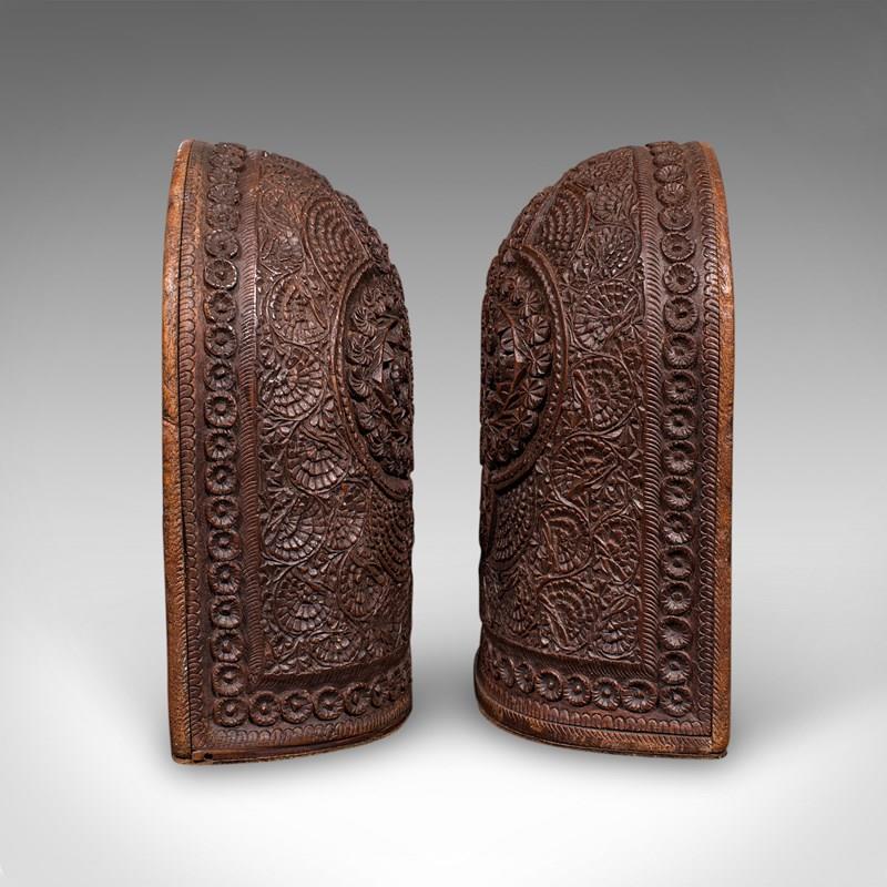 This is a pair of antique ornate bookends. An Anglo-Indian, carved beech book rest, dating to the late Victorian period, circa 1900. Displaying exceptional decorative appeal and fine craftsmanship, they make for a distinctive addition to the bookcase or mantelpiece.