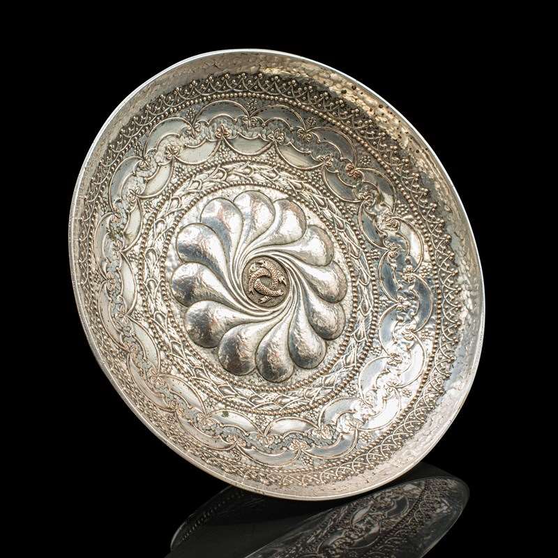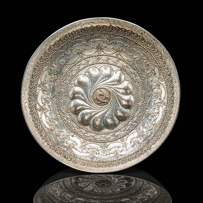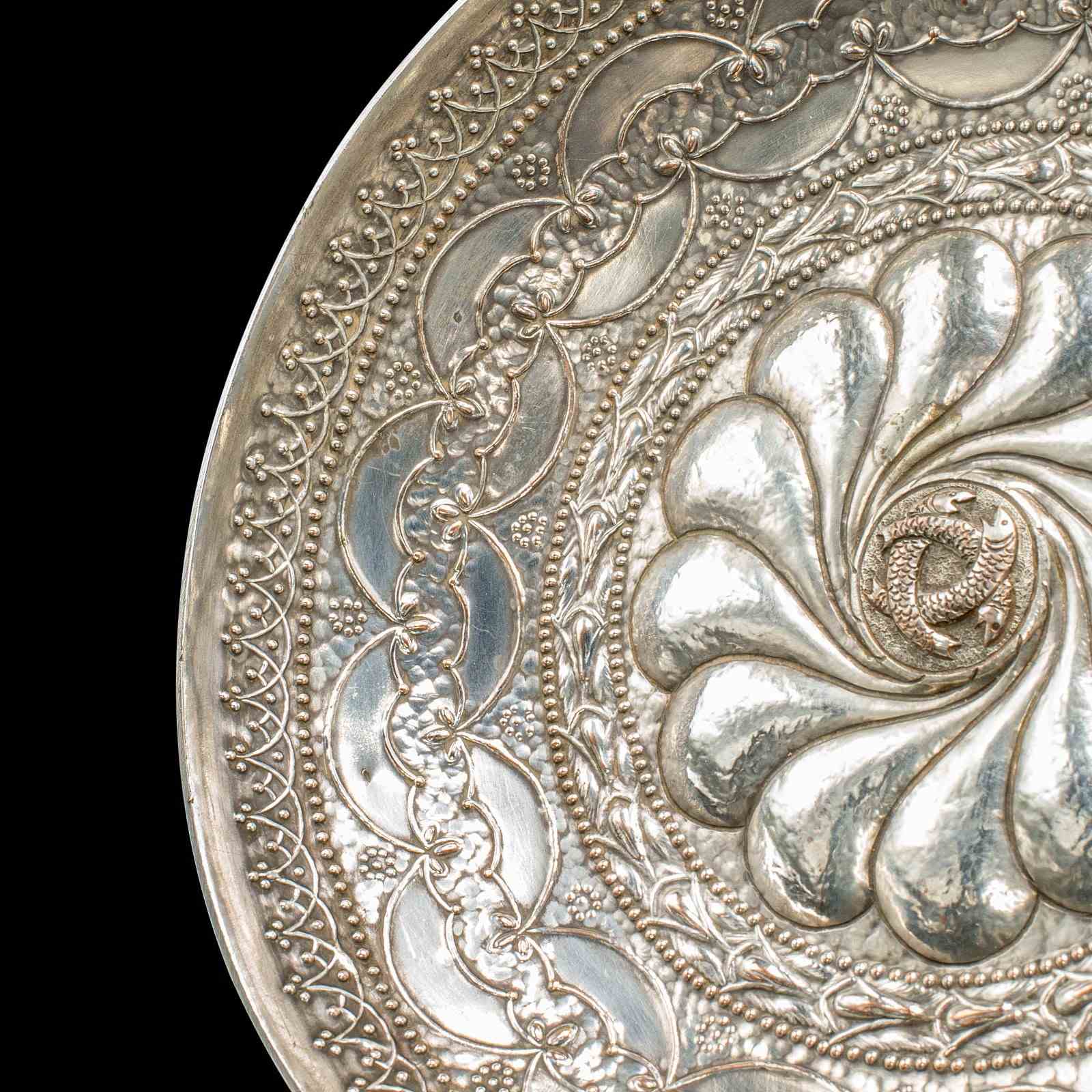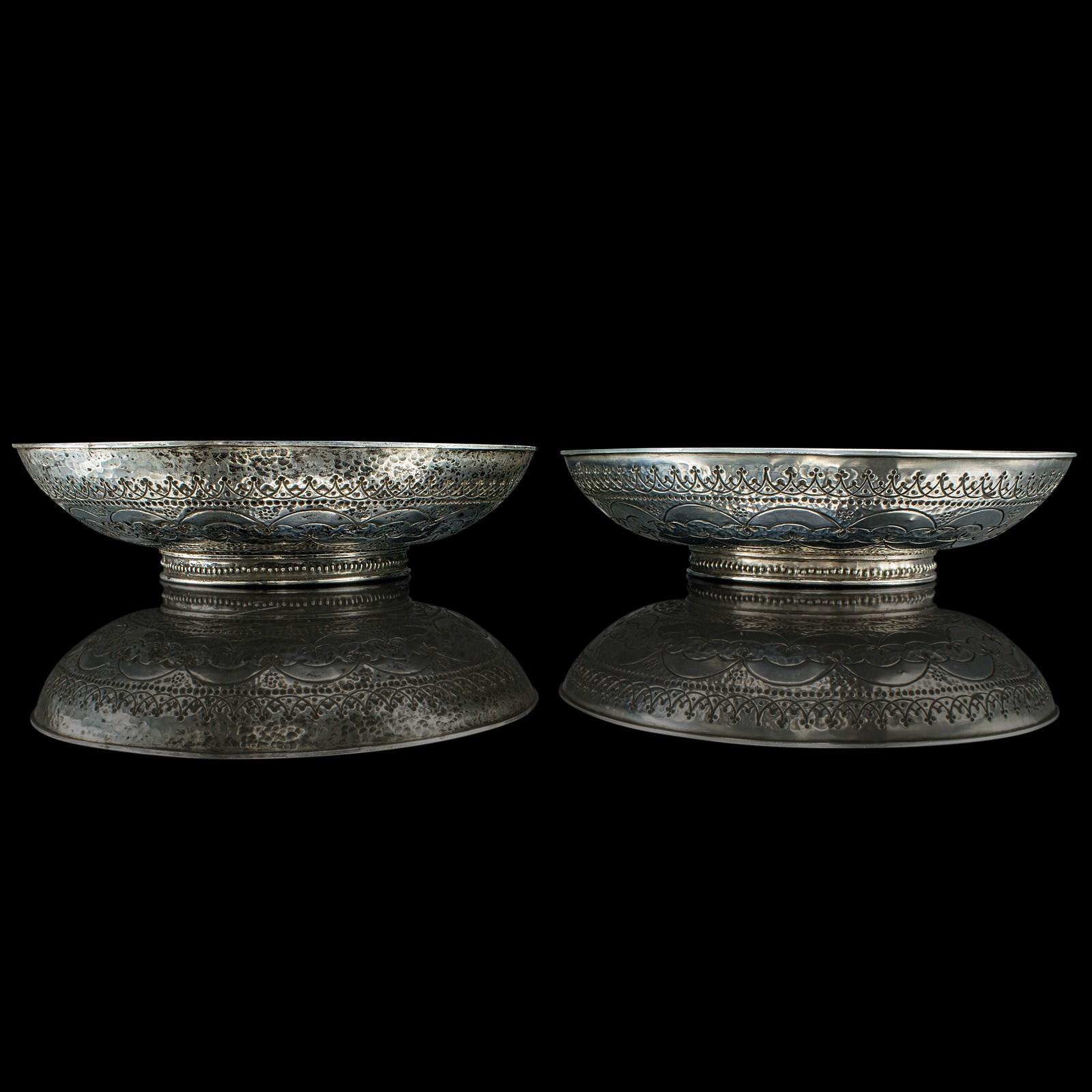 A beautiful example of early Victorian Indian silverwork, these antique presentation dishes present with elegance, symbolism, and decorative charm. Delivered ready for the home.