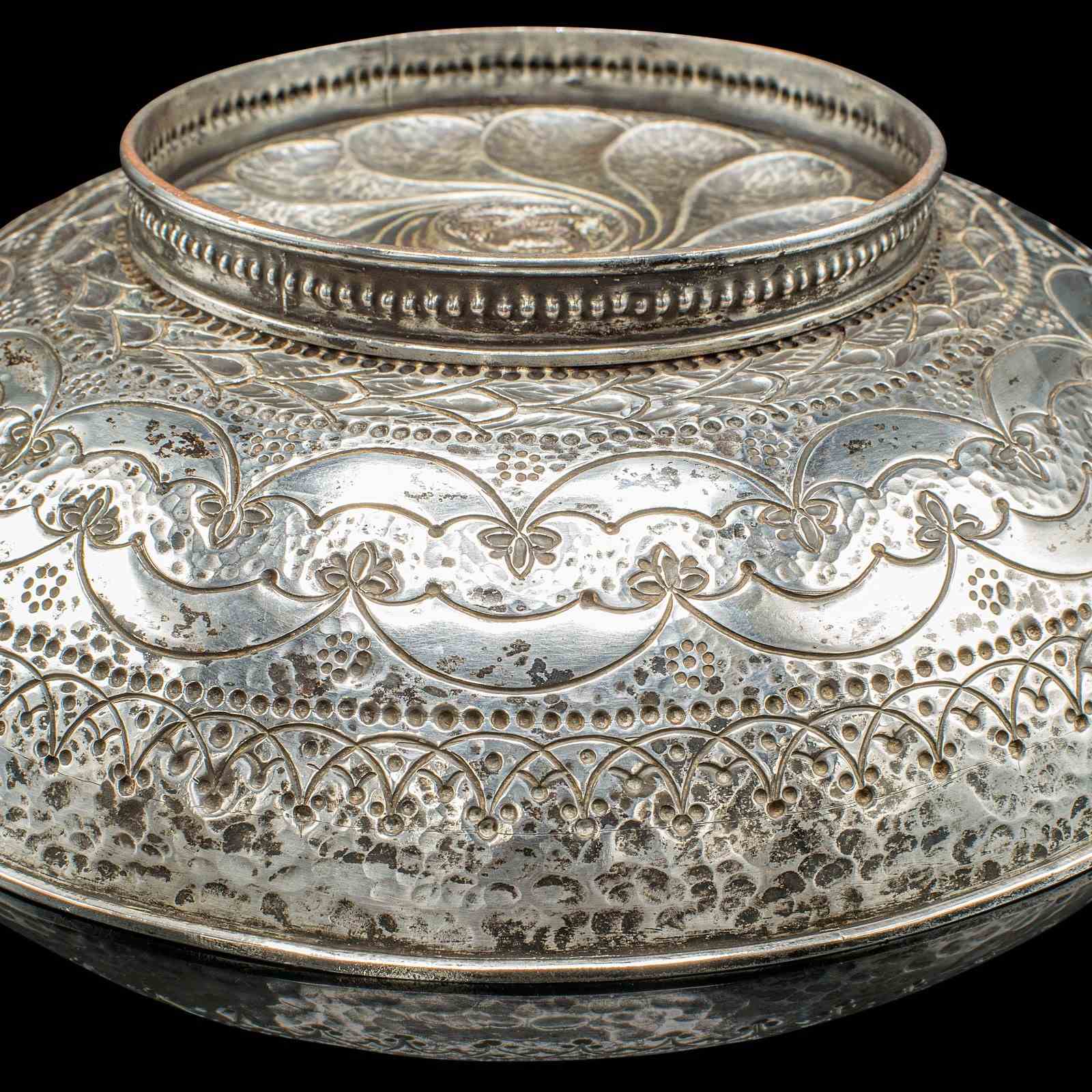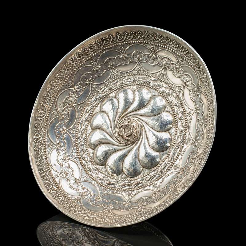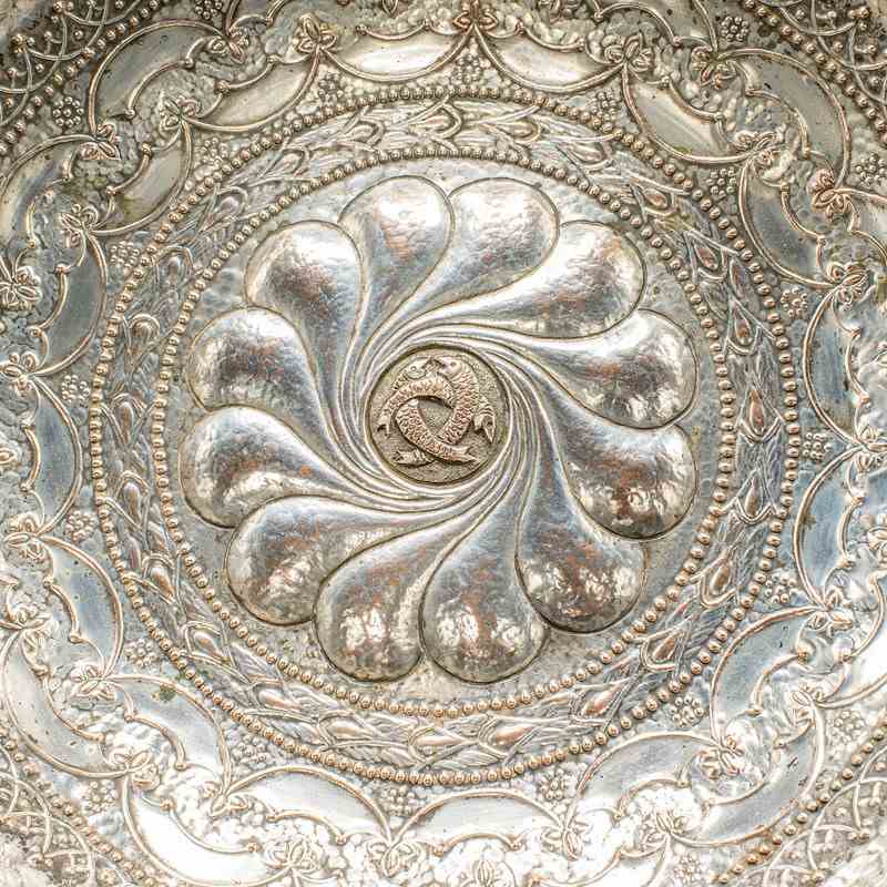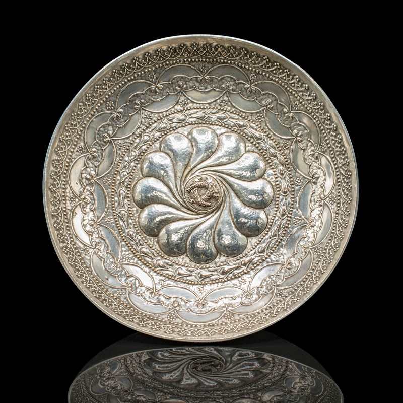 A beautiful example of early Victorian Indian silverwork, these antique presentation dishes present with elegance, symbolism, and decorative charm. Delivered ready for the home.