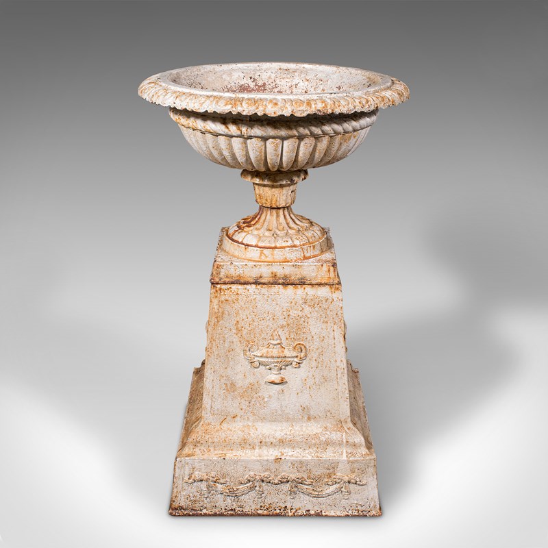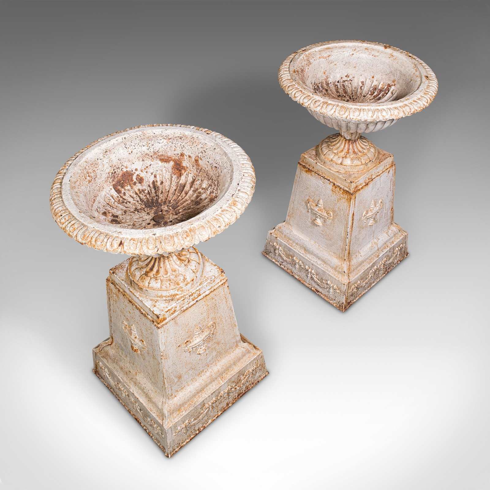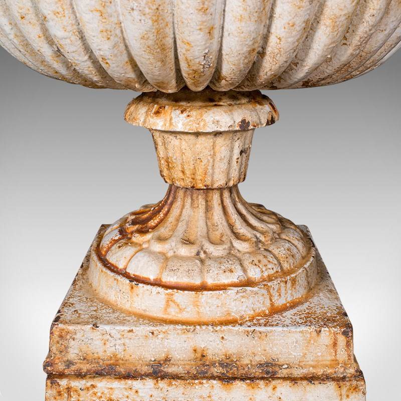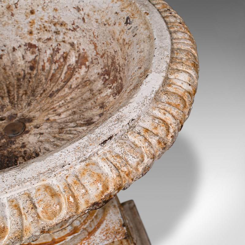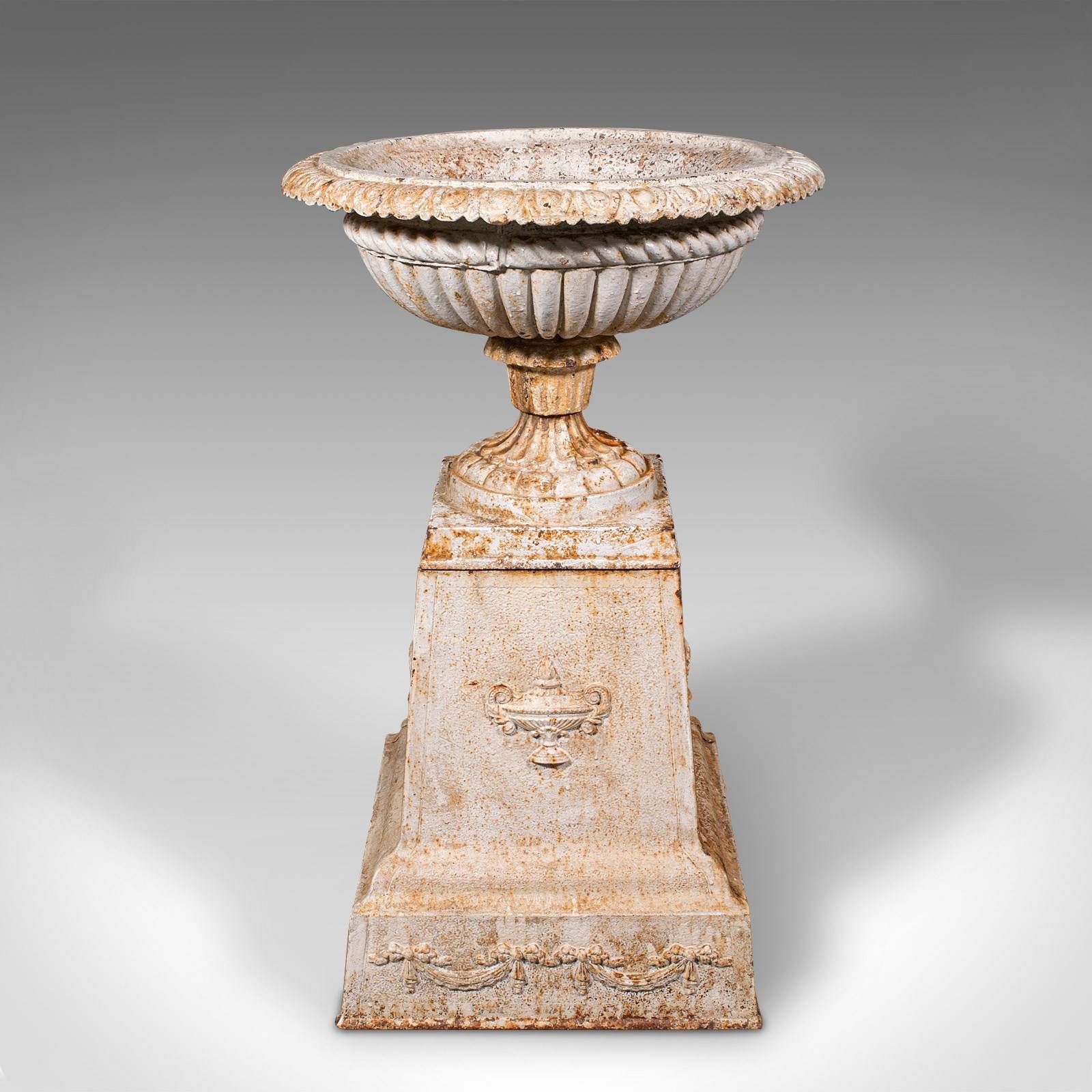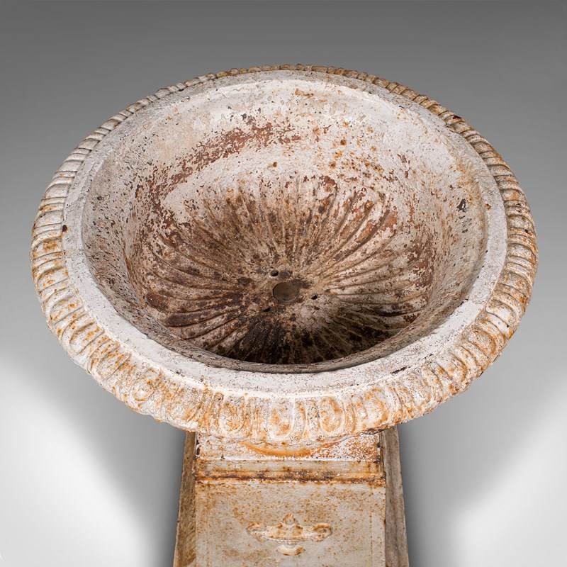 This is a pair of large antique garden planters. An English, cast iron planting bowl on pedestal base, dating to the late Victorian period, circa 1880. A delightfully rare and decorative set of substantial outdoor jardinières, with enduring appeal.