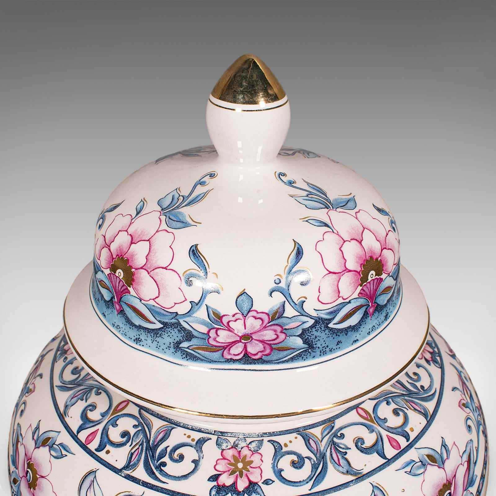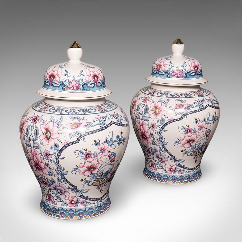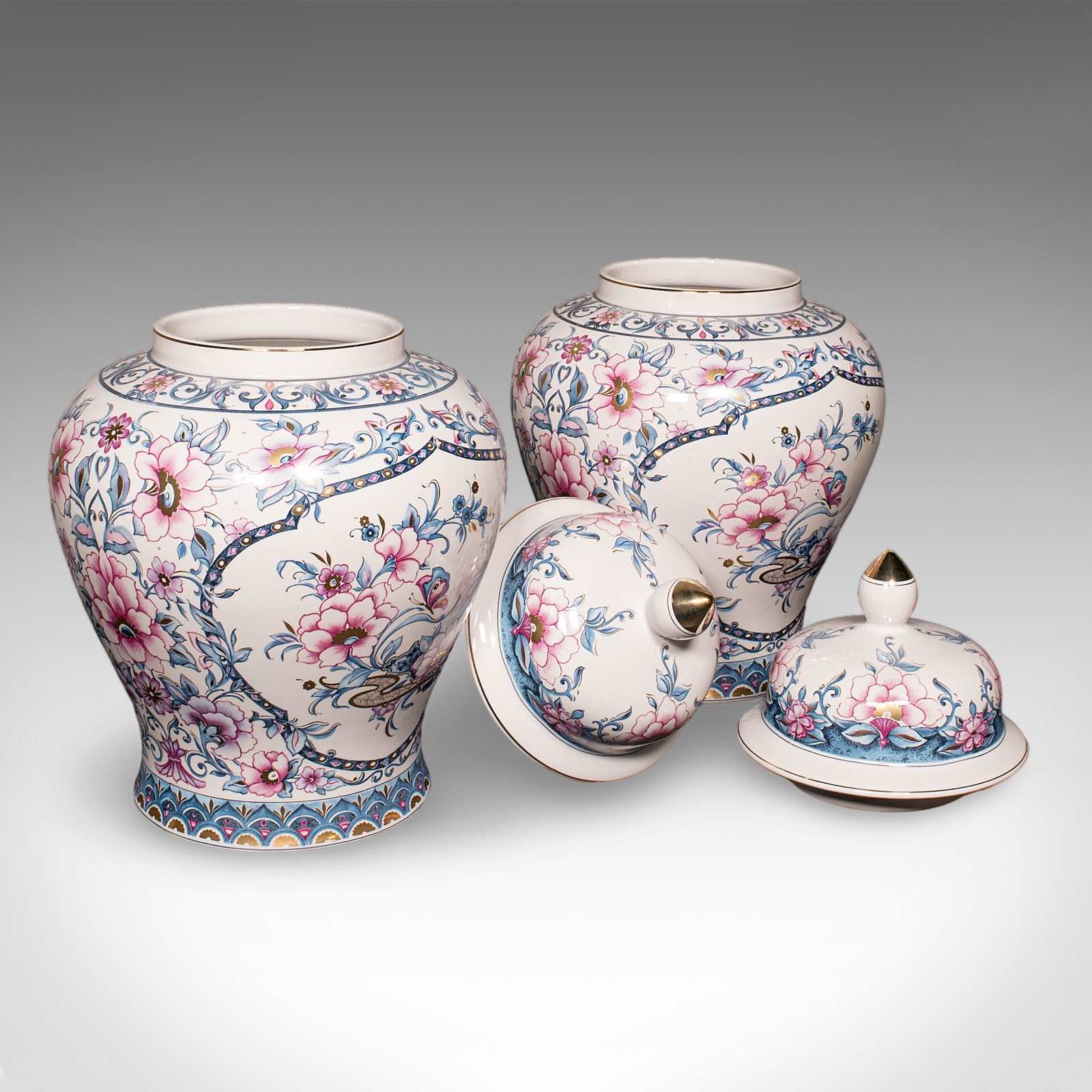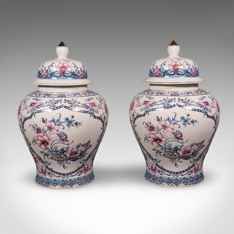 A charming example of late 20th century Italian ceramic artistry, this pair of vintage lidded display vases present fine floral decor across generously sized urn forms. Delivered ready to display.