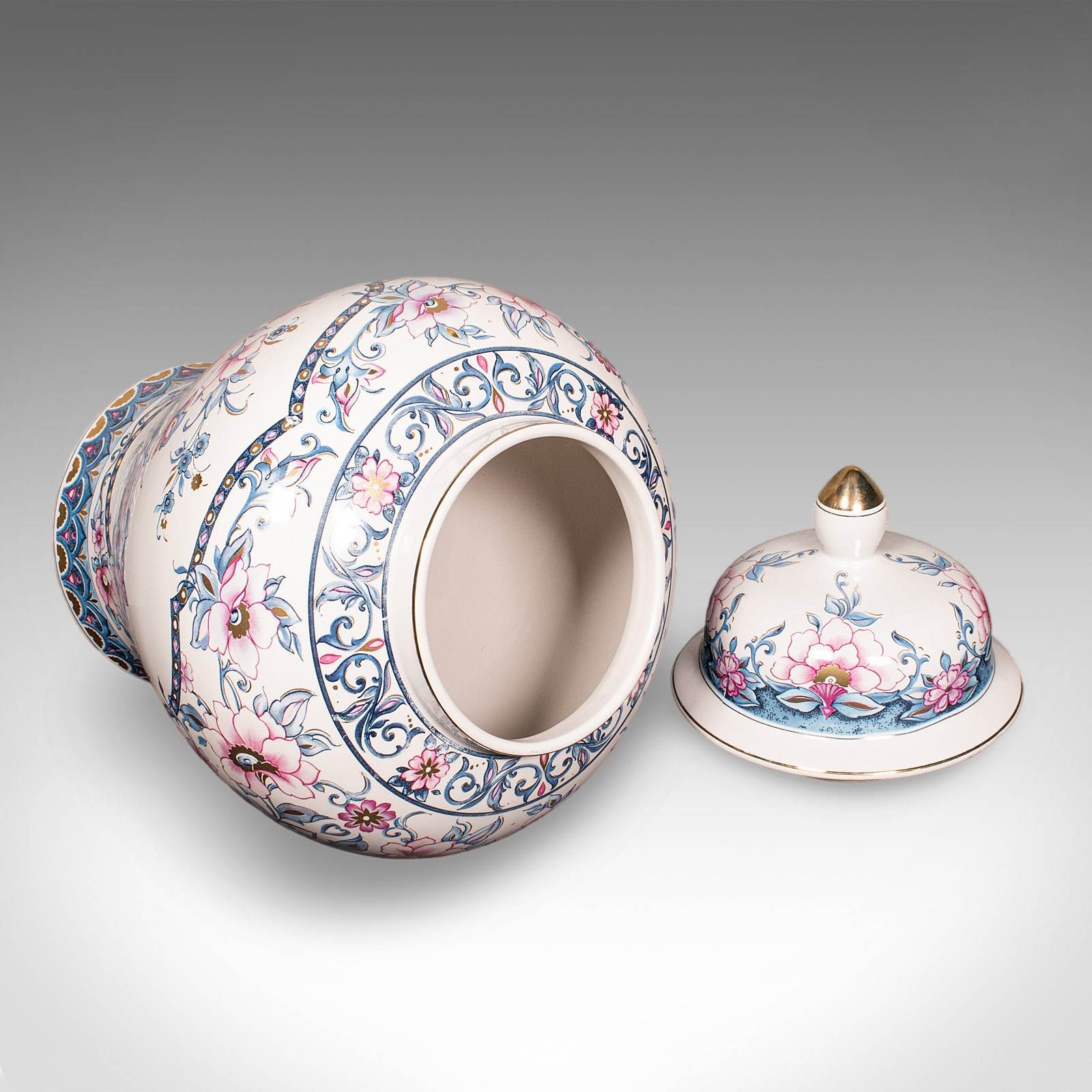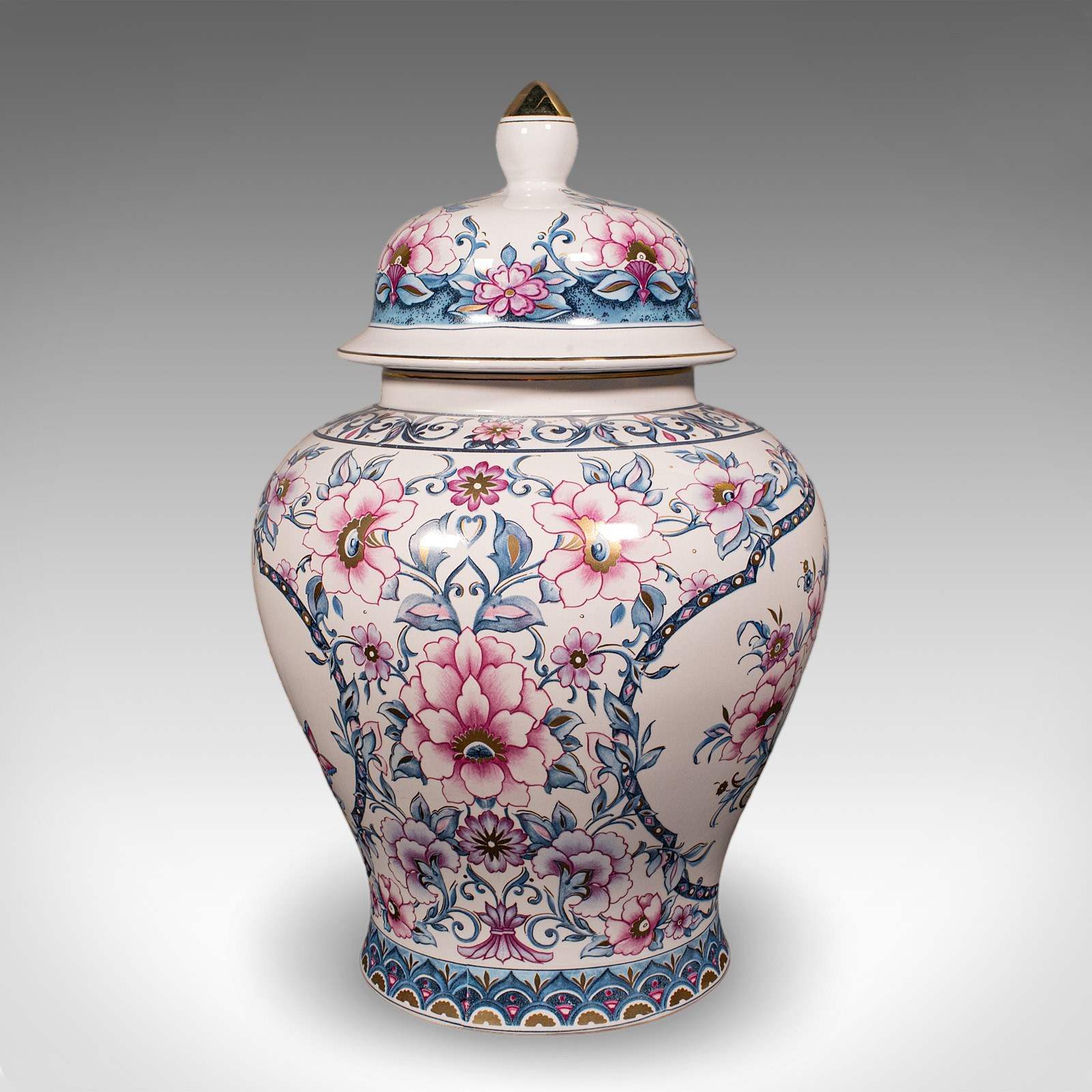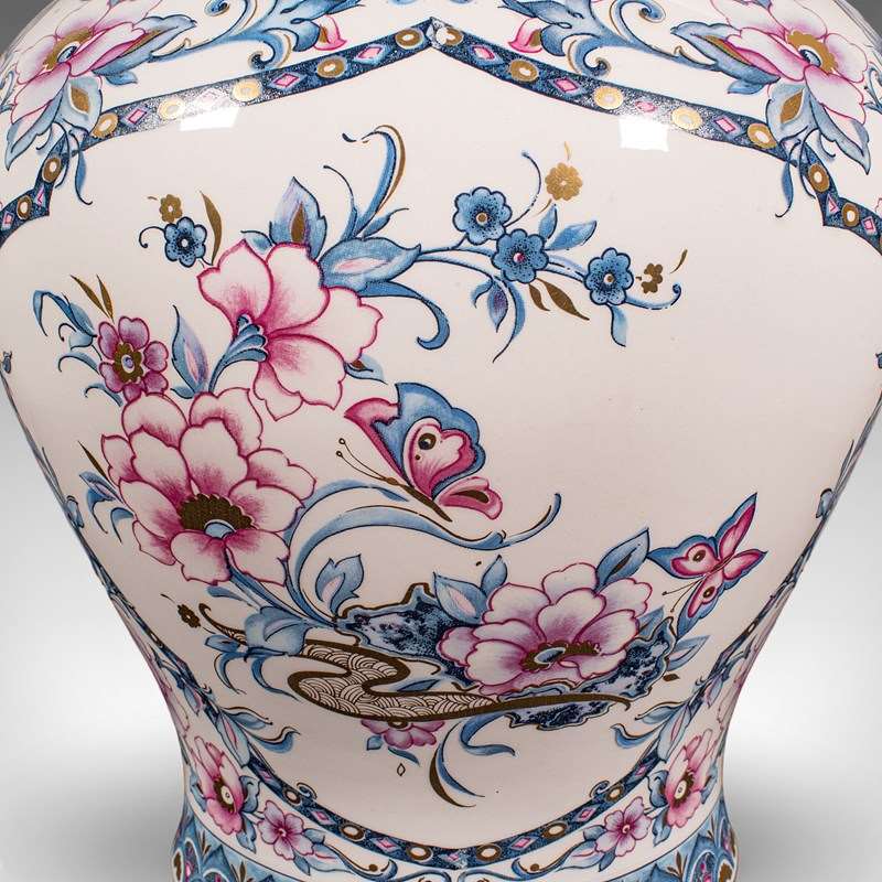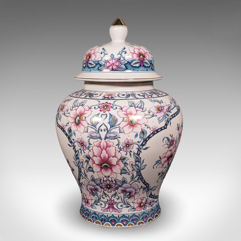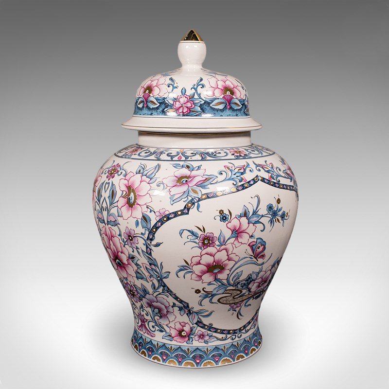 A charming example of late 20th century Italian ceramic artistry, this pair of vintage lidded display vases present fine floral decor across generously sized urn forms. Delivered ready to display.
