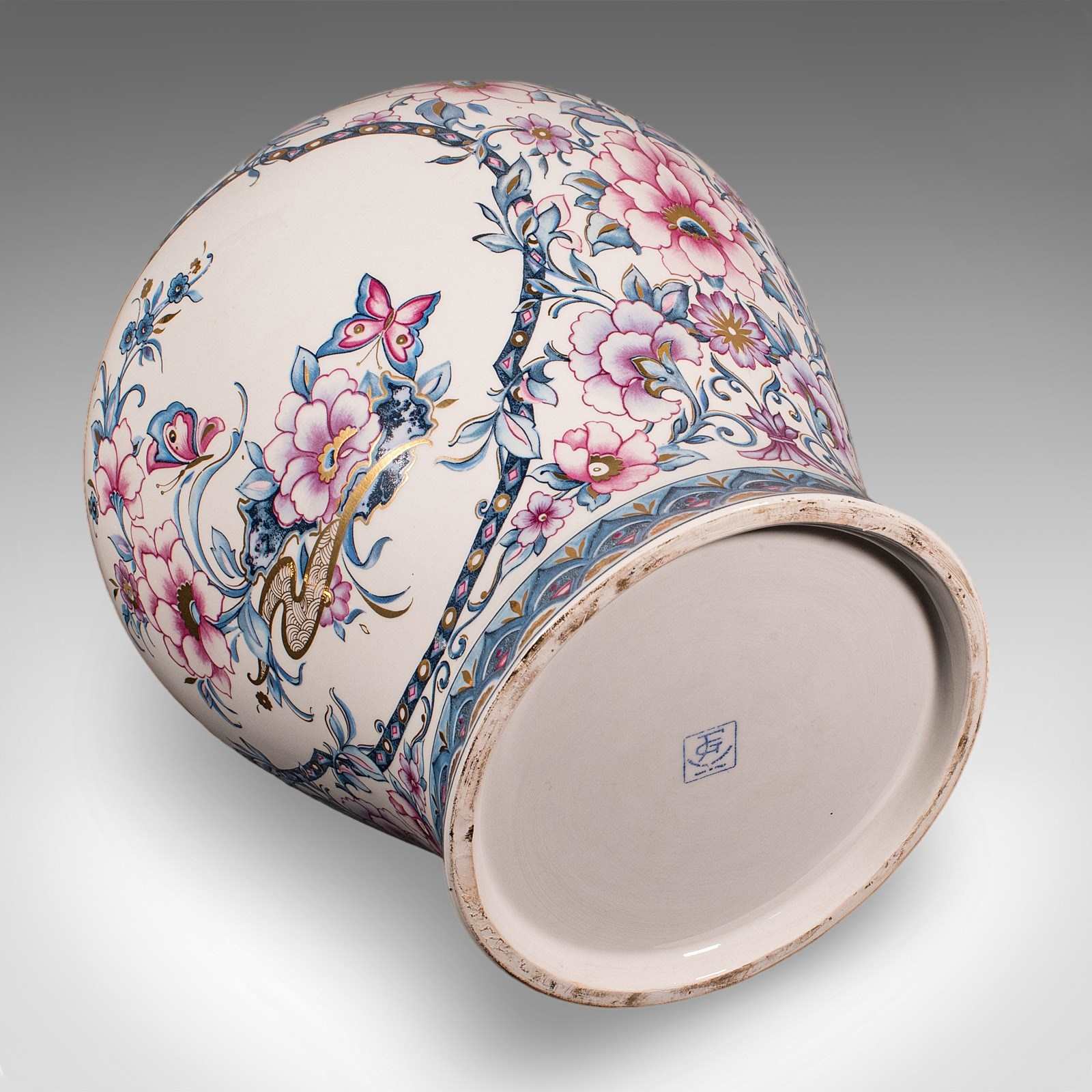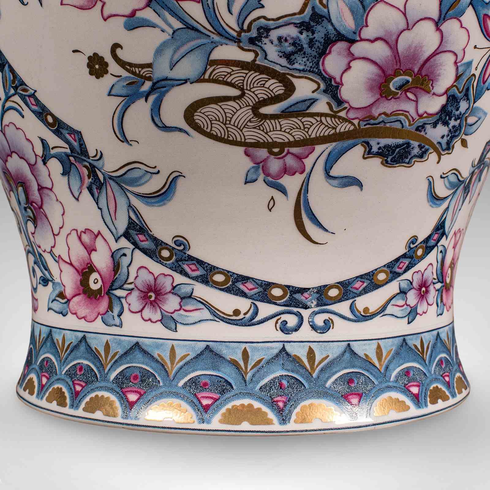 This is a large pair of vintage display vases. An Italian, ceramic and gilt finished baluster urn, dating to the late 20th century, circa 1980. A bold and decorative pair, offering excellent proportion and vibrant floral ornamentation.