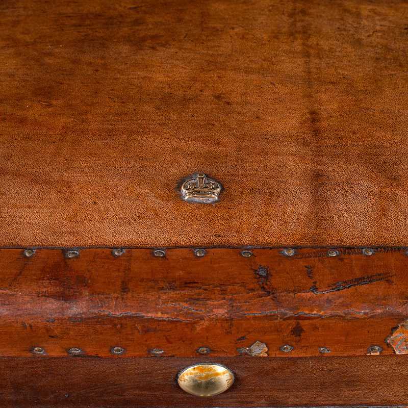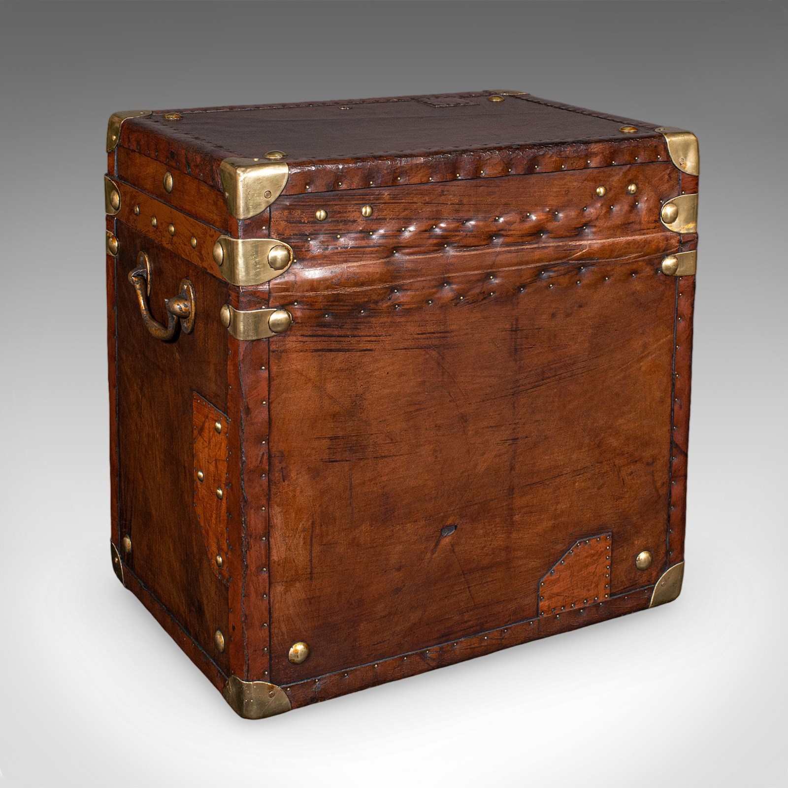 Pair Of Late Vintage Campaign Luggage Trunks, English Leather Bedside Nightstand