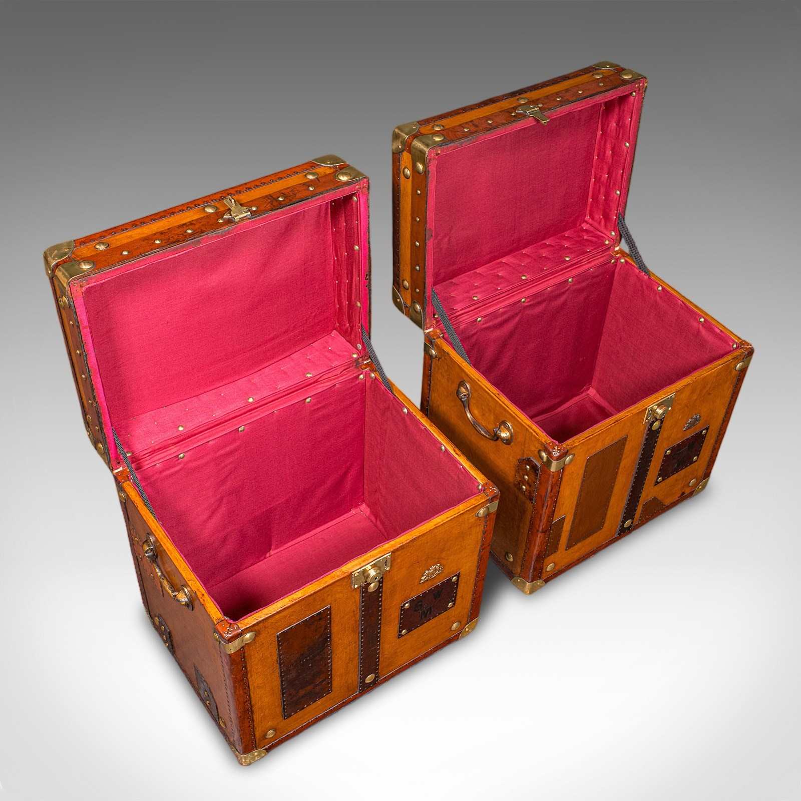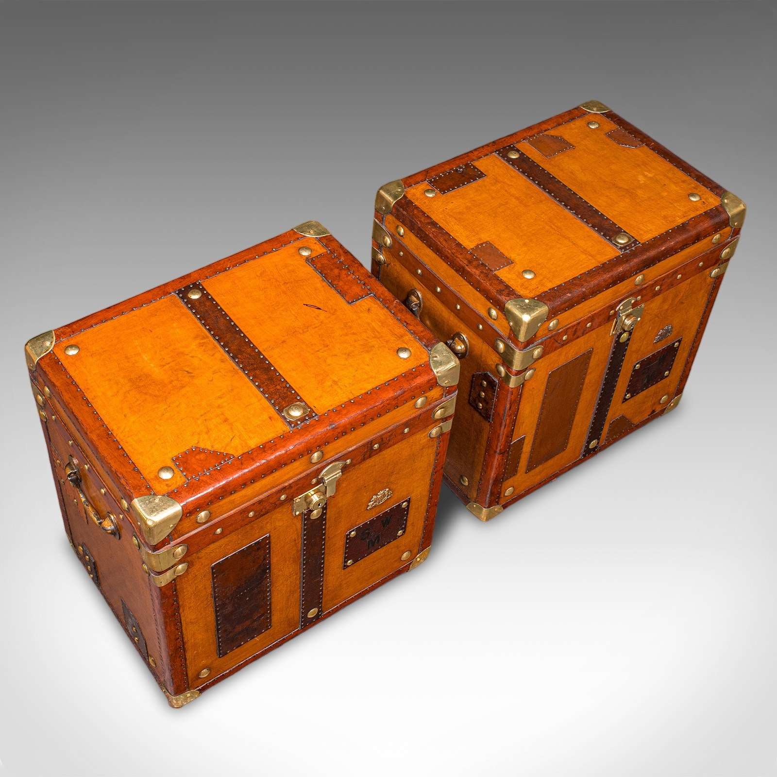 This is a superb pair of late vintage luggage cases, presenting a clean appearance, useful proportion and excellent colour. Offering a fine opportunity to use them as distinctive bedside nightstands or as distinctive travel companions. Delivered ready to enjoy.