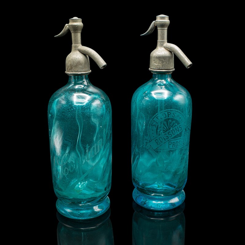 Duo of antique and vintage soda syphons, ideal as decorative display bottles