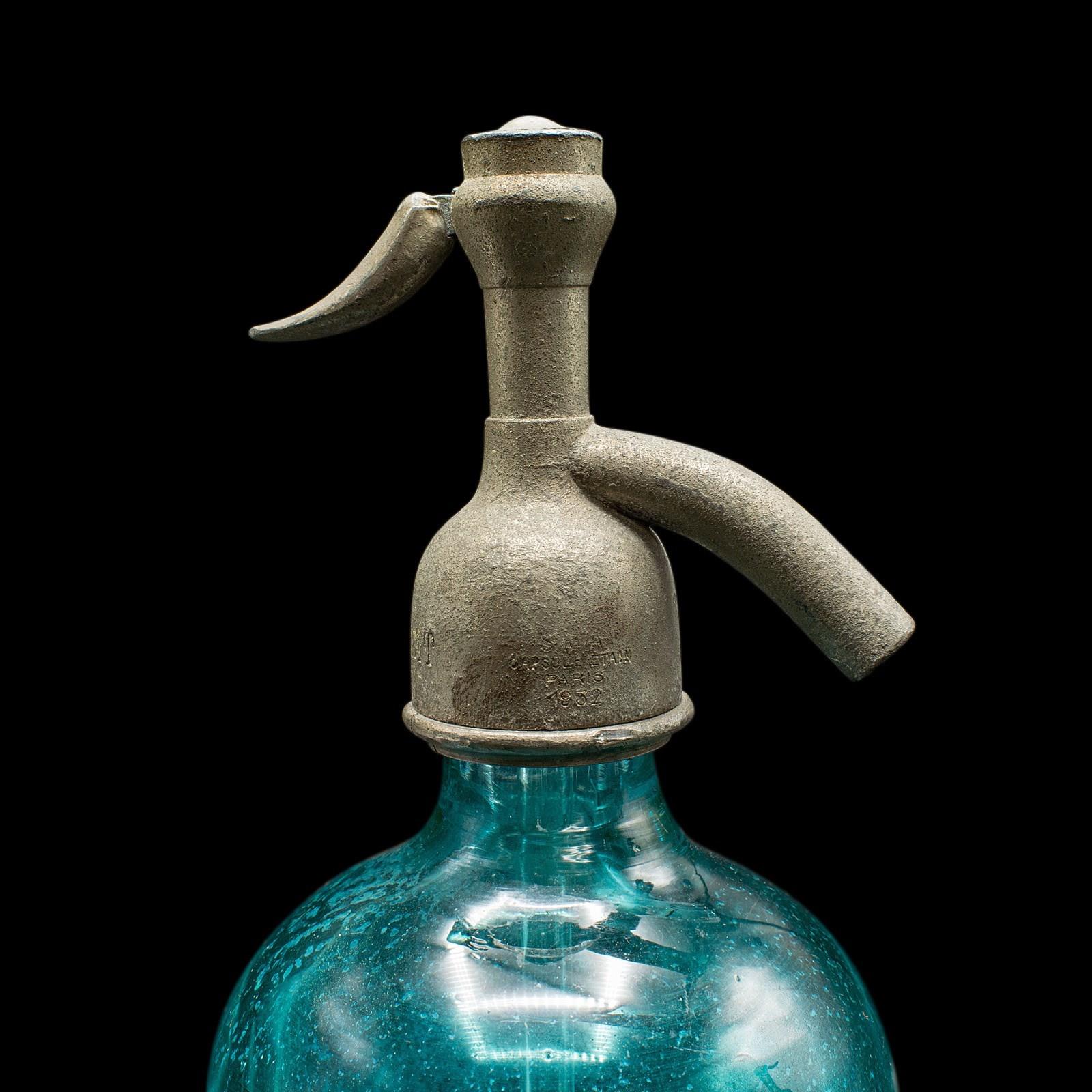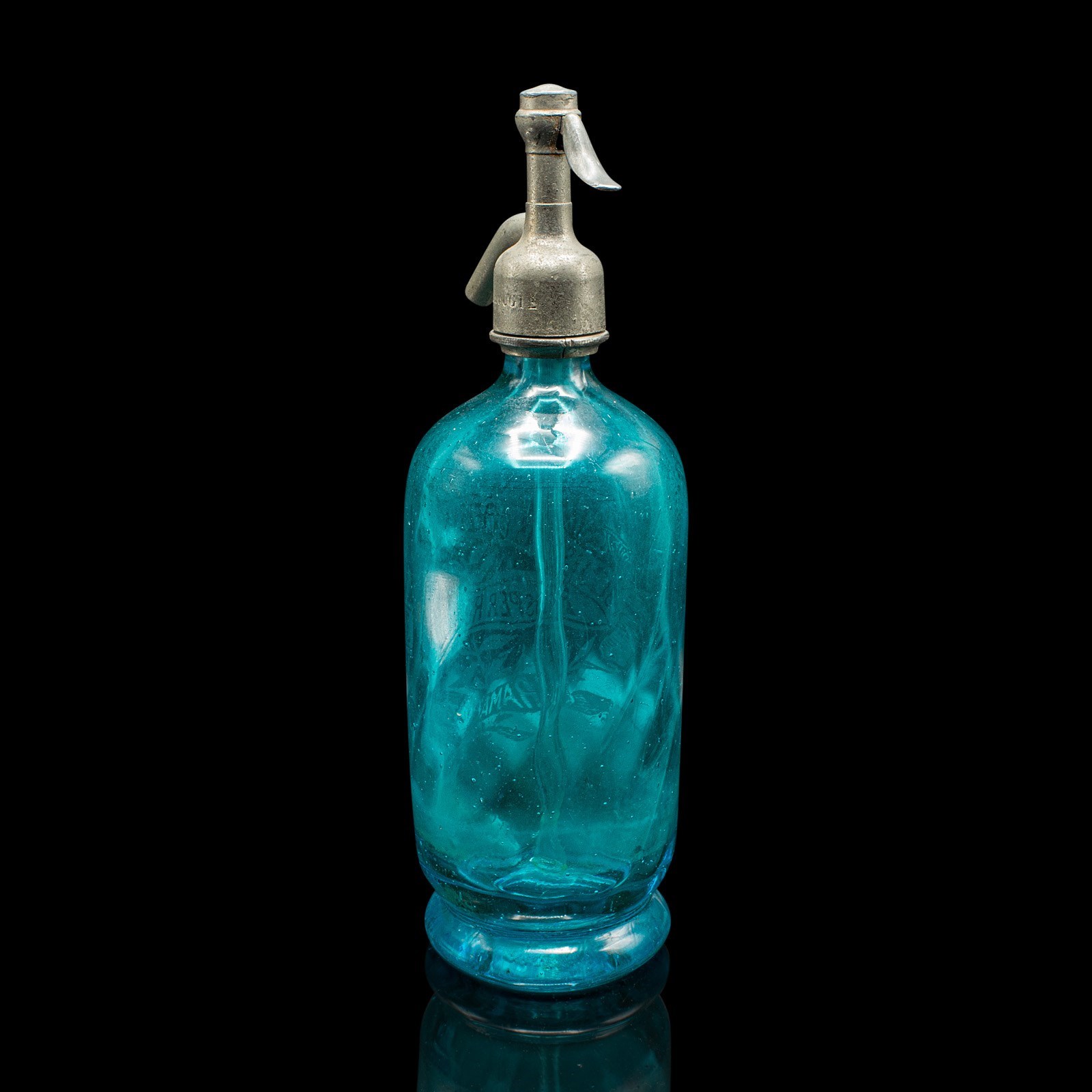 These charming seltzer bottles display beautifully, with their vibrant glass hues, etched branding, and period charm. Substantial in weight and craftsmanship, each bottle features a steel lid with integrated pouring spout, engraved with the dates 1913 and 1932 respectively. The etched labels denote the original seltzer manufacturers, adding authenticity and decorative appeal. Perfect as vintage kitchenware, home bar display pieces, or collectable French glassware.