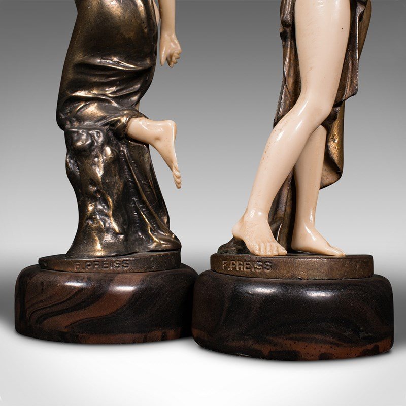 Pair Of Vintage Art Deco Figures, German, Decorative Statuette, After F. Preiss
