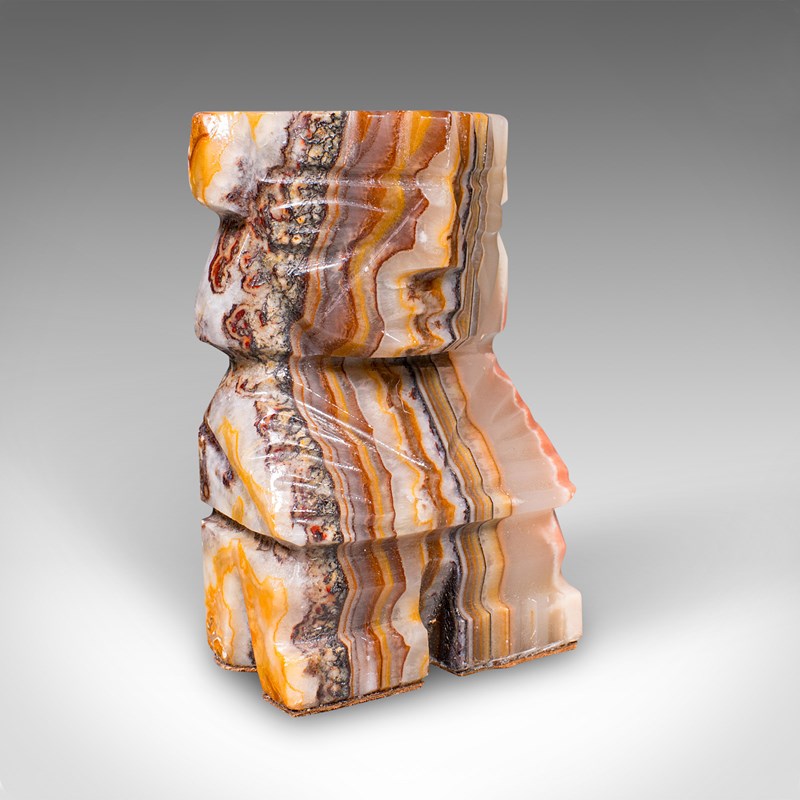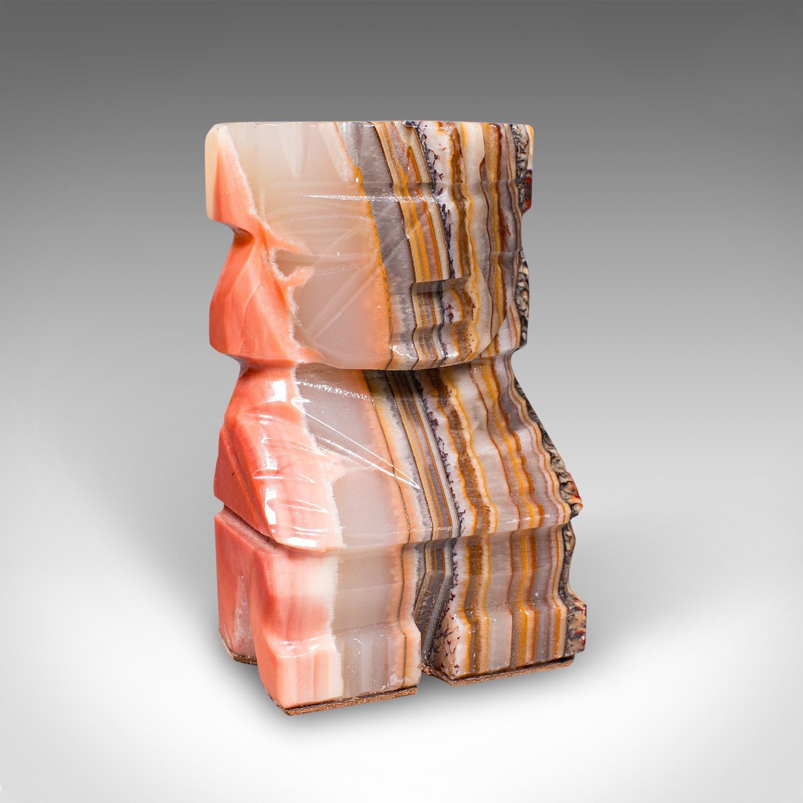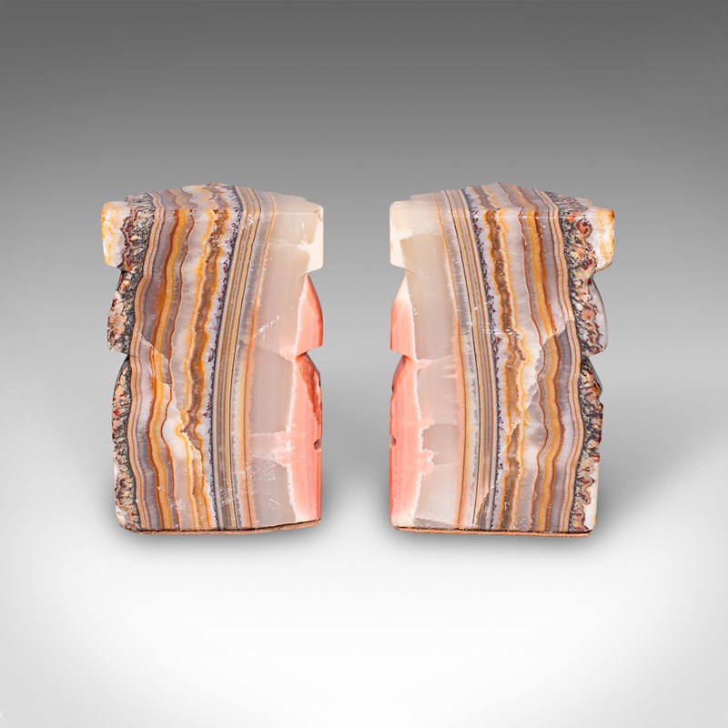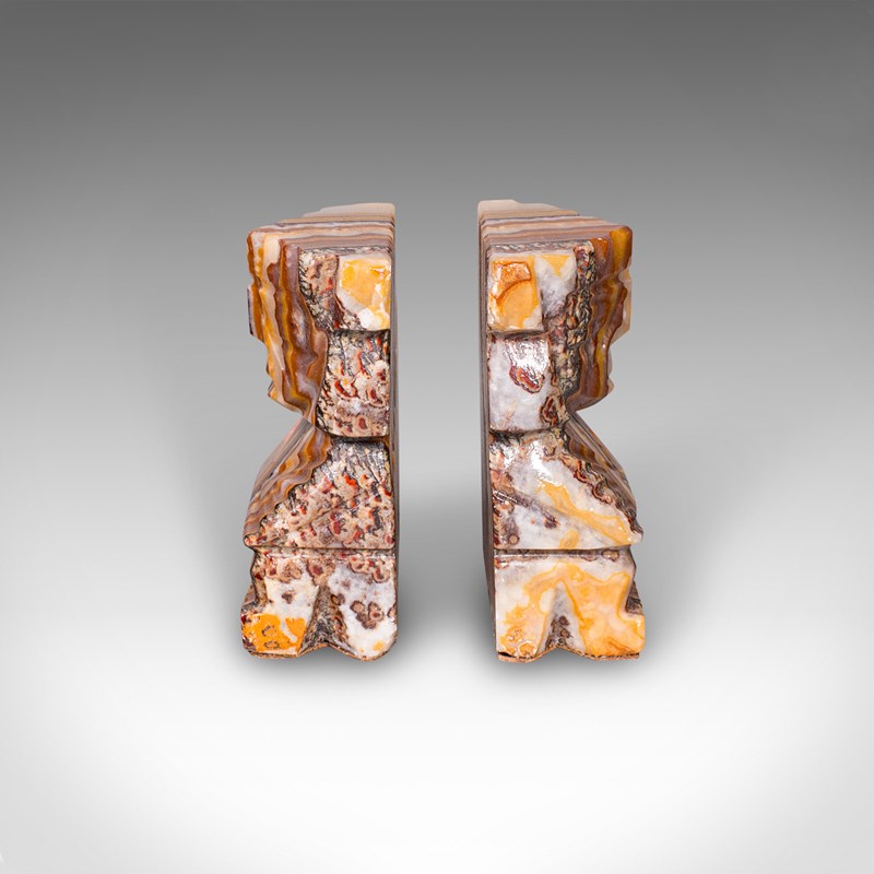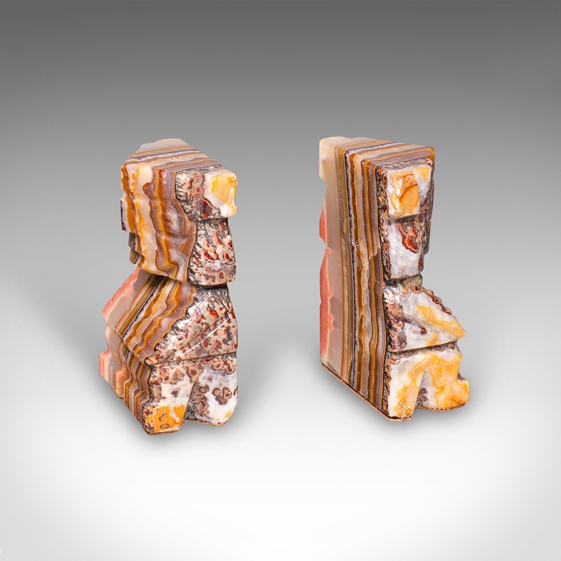 These Art Deco banded agate Aztec bookends offer both practical function and decorative presence, making them a fine choice for collectors of Art Deco, tribal or South American art. Delivered ready for the home.