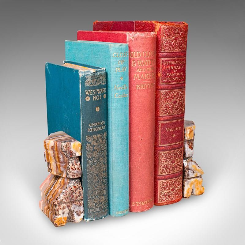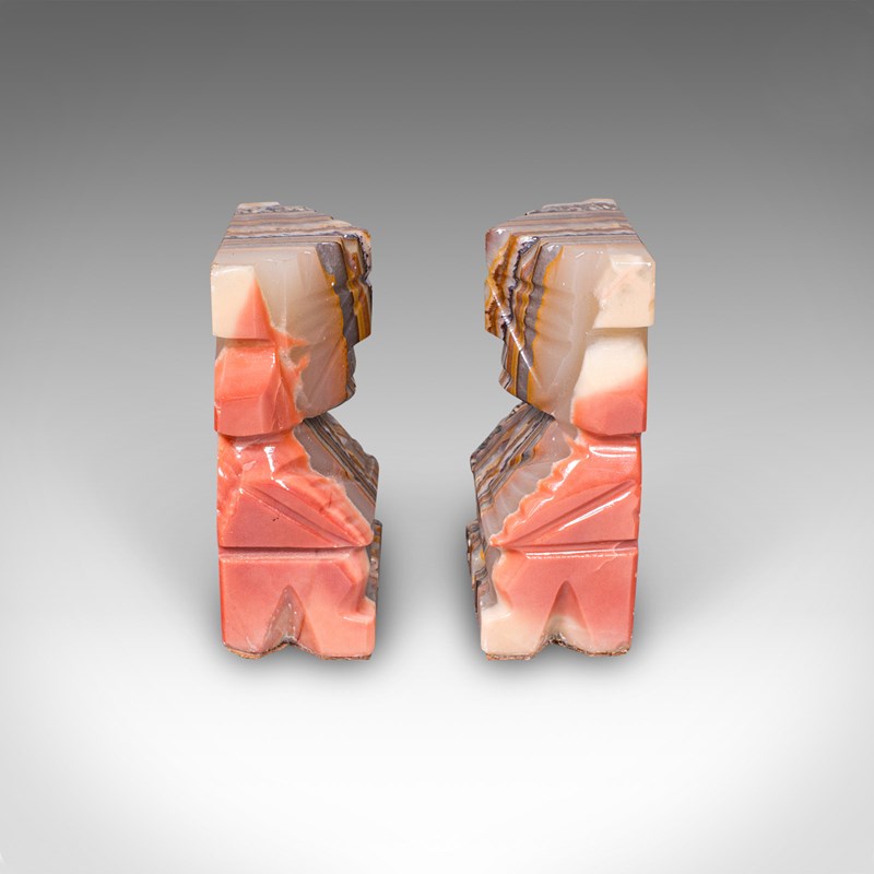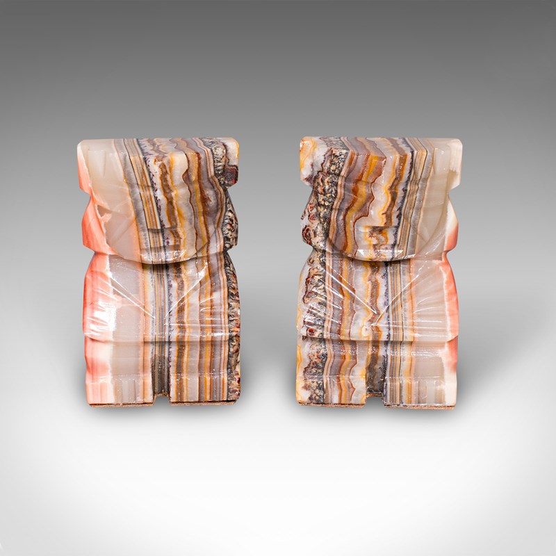 Pair Of Vintage Aztec Figure Bookends, Banded Agate, Book Rest, Art Deco, C.1930