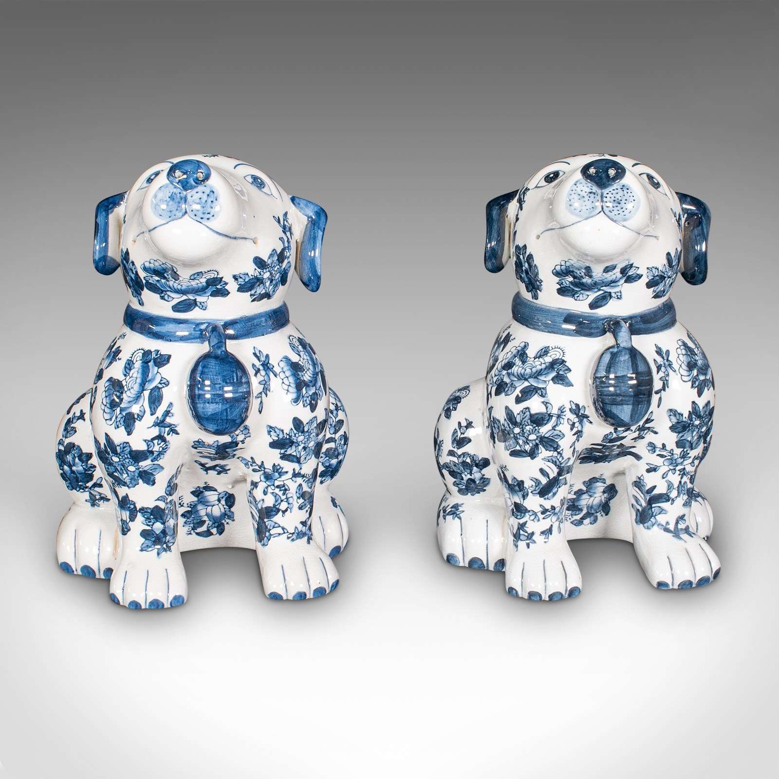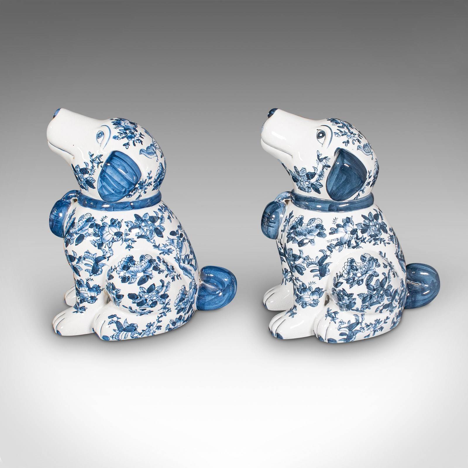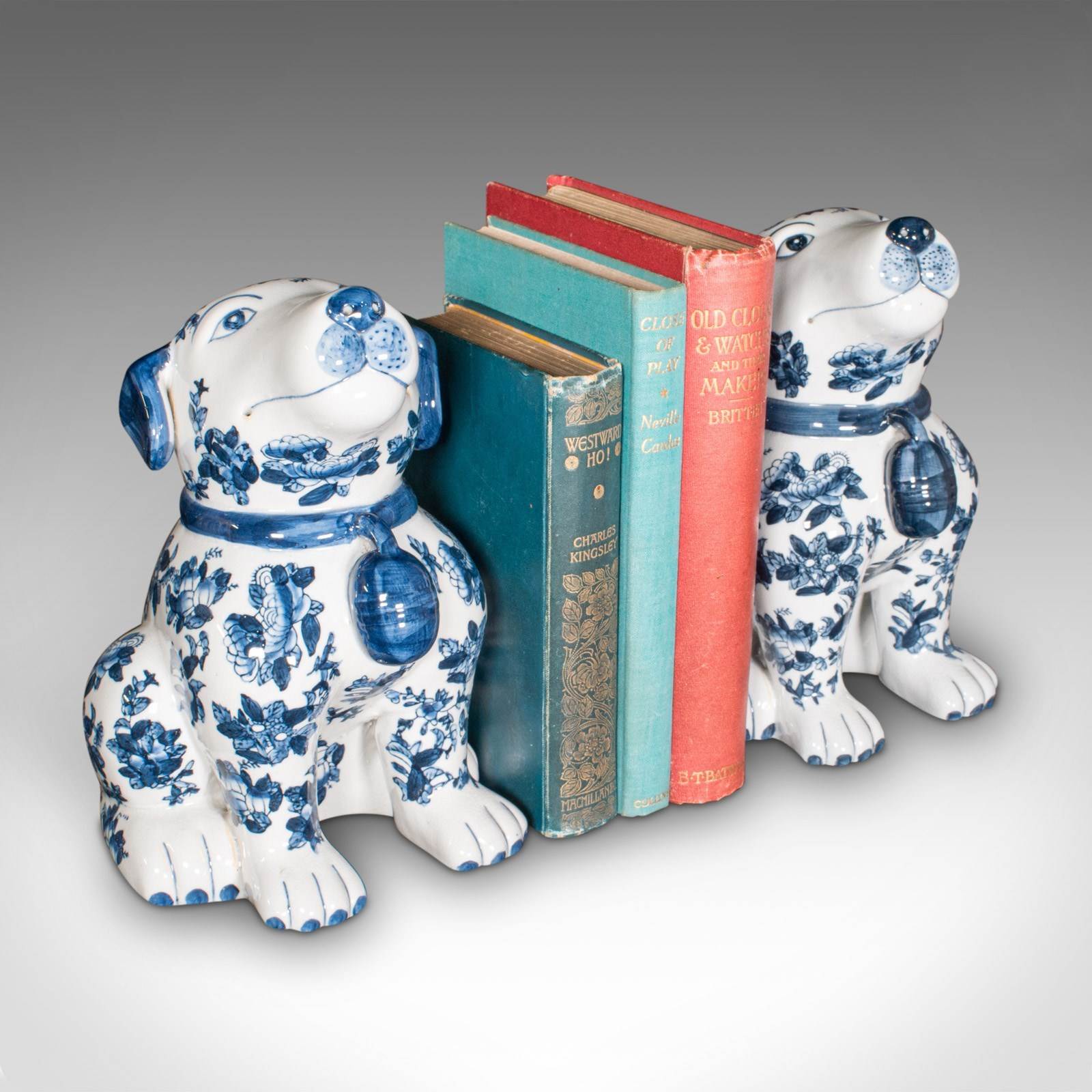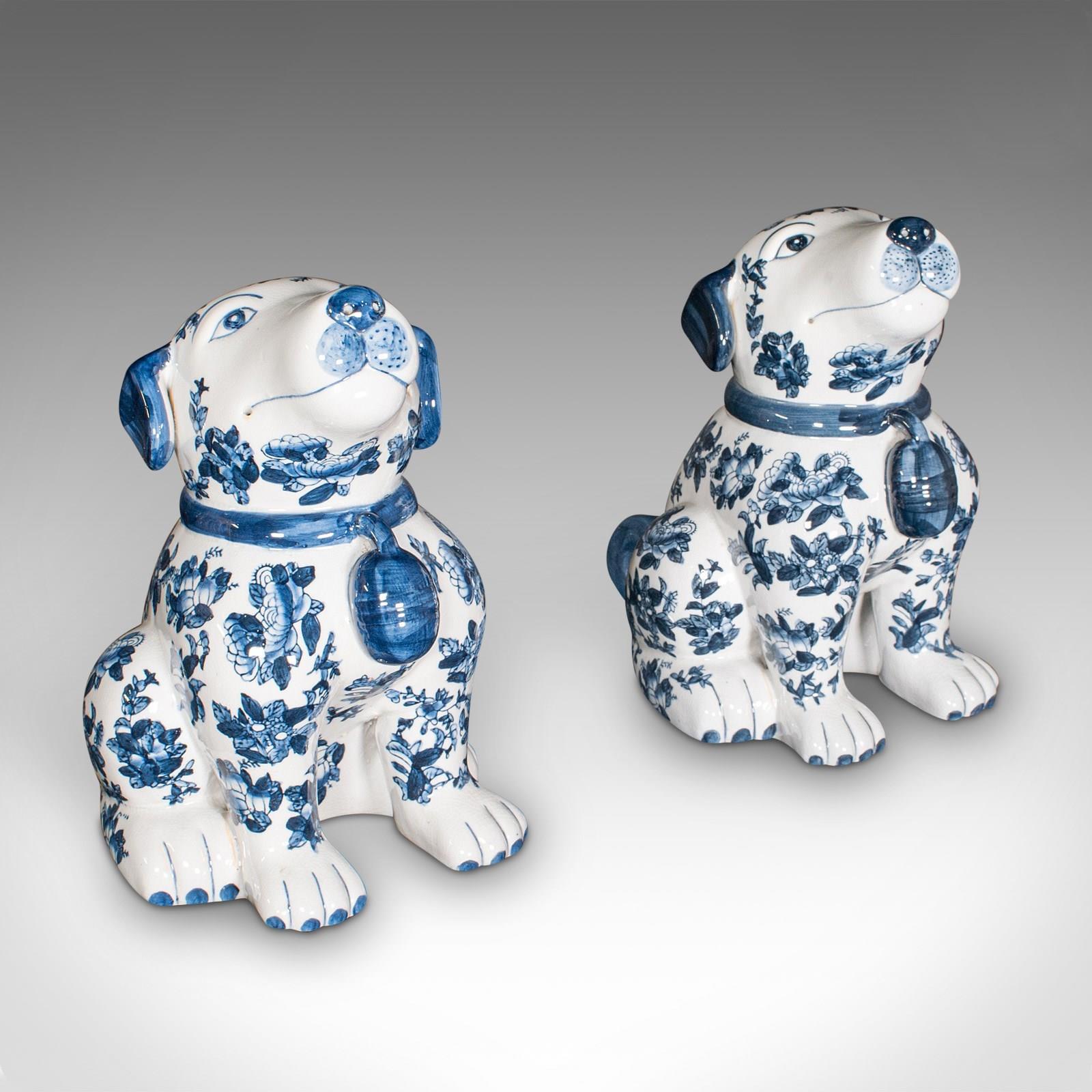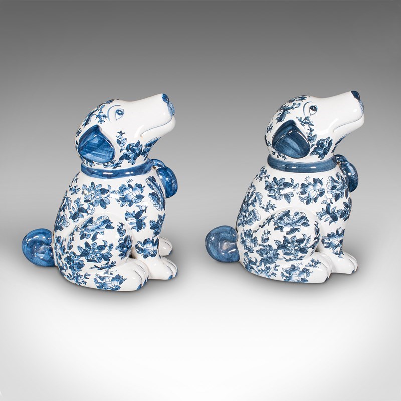 Pair Of Vintage Decorative Book Dogs, Chinese, Ceramic, Blue & White, Bookends